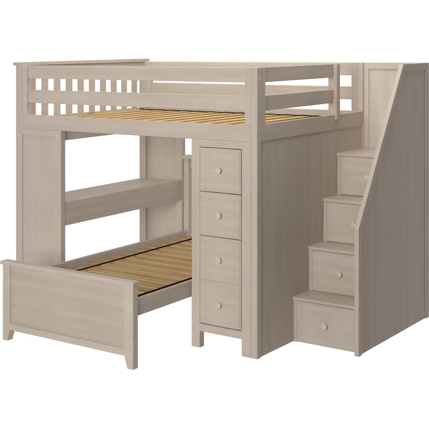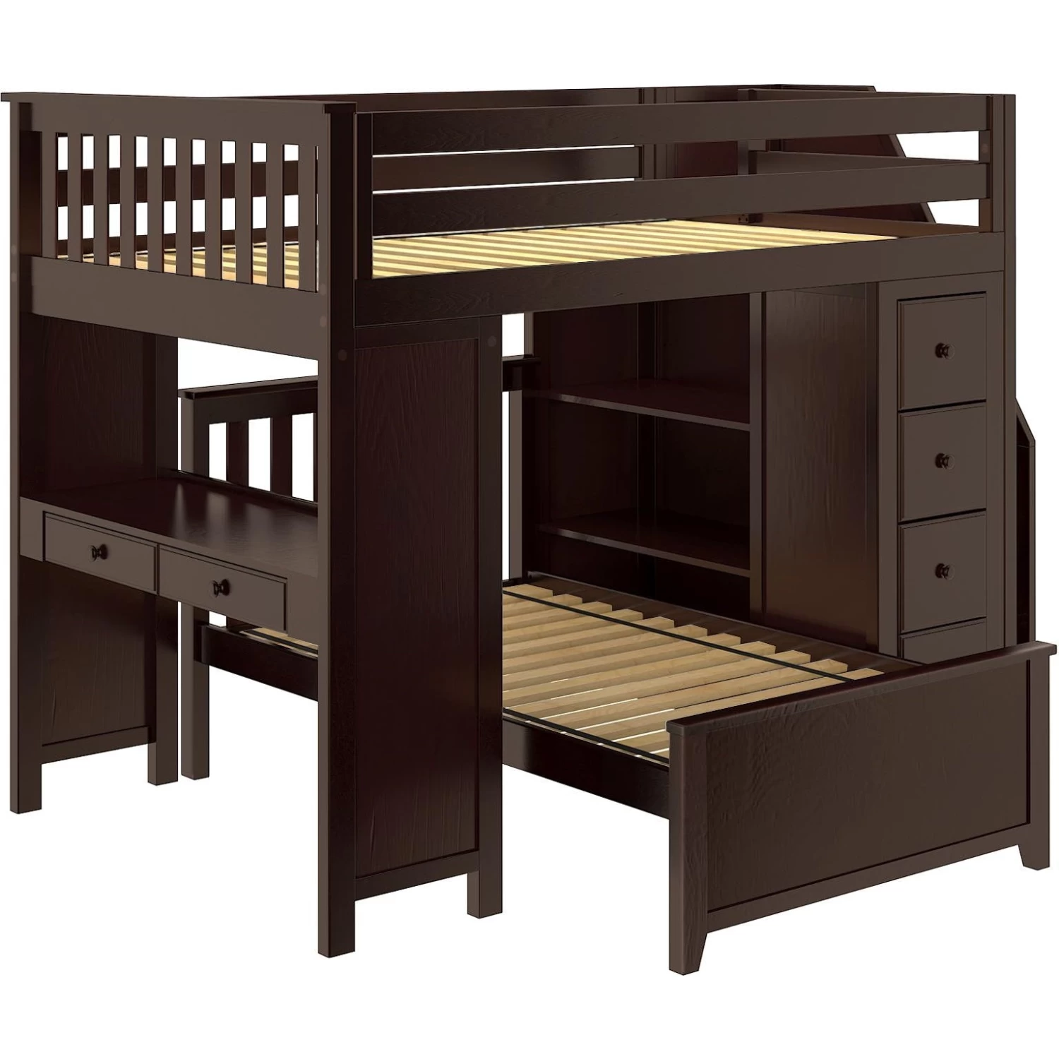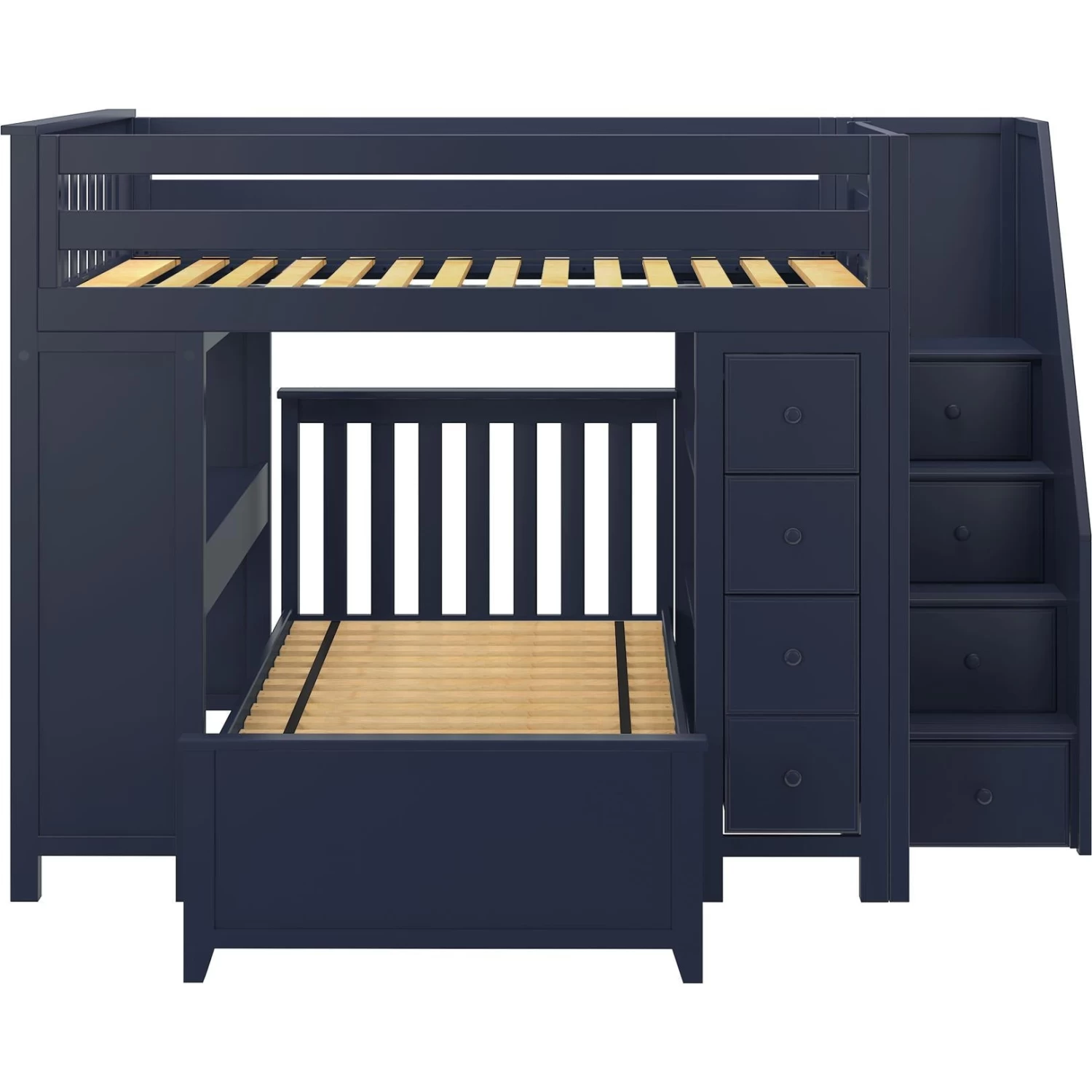 Study and storage now in a stylish package. The Buxton 4 Loft Bed handles it all in one beautiful setup. This bed’s unique design has a freestanding lower bed that can be moved for ultimate versatility. The desk with two drawers is the perfect place for studying and storing your school essentials. An included storage tower with extra-long drawers organizes your clothes, books, and bedding. A wide, anti-slip staircase makes climbing up simple and easy. The staircase also features built-in storage for your shoes and other everyday items. Safety and security come standard with tall 15″ guard rails for the top bunk. Crafted with solid, knot-free New Zealand pine wood and metal-on-metal connections, this bed offers strong support for years to come. The durable, non-toxic low VOC finishes make this bed the clean and healthy choice for your home. A slatted headboard and flush, color-matched hardware create a modern look. Combining superior quality with classic design, this Loft with Staircase + Desk + Storage + Lower Bed is the perfect all-in-one solution for every room.