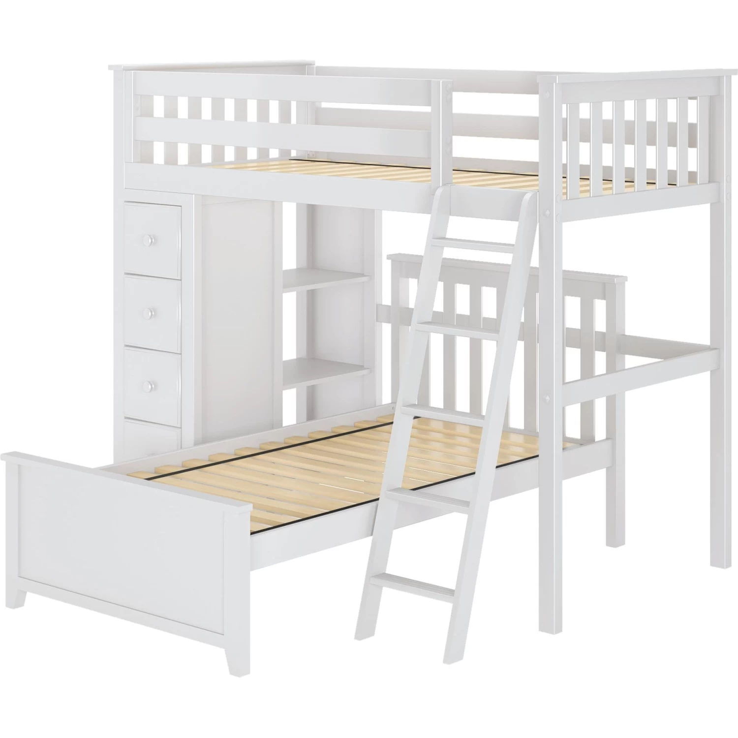 Sleep/Storage Solution – Twin Loft with built-in storage tower with 4 roomy front-facing drawers & 3 book shelves behind it. Twin Bed fits L-Shaped under Loft. Solid knot free Pine construction with flush, color coordinated hardware creates a clean & modern look. Oversized steel hardware ensures solid connections. Each bed tested for 400lb to comfortably sleep kids or adults. Pre-assembled components for fast & easy assembly. 15″ guardrails accommodate standard size mattresses (slat rolls included). Recommended for 8 feet ceiling height above. This bed meets or exceeds federal safety standards. Mattress & Bedside tray sold separately.