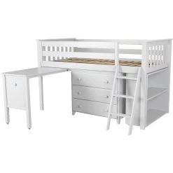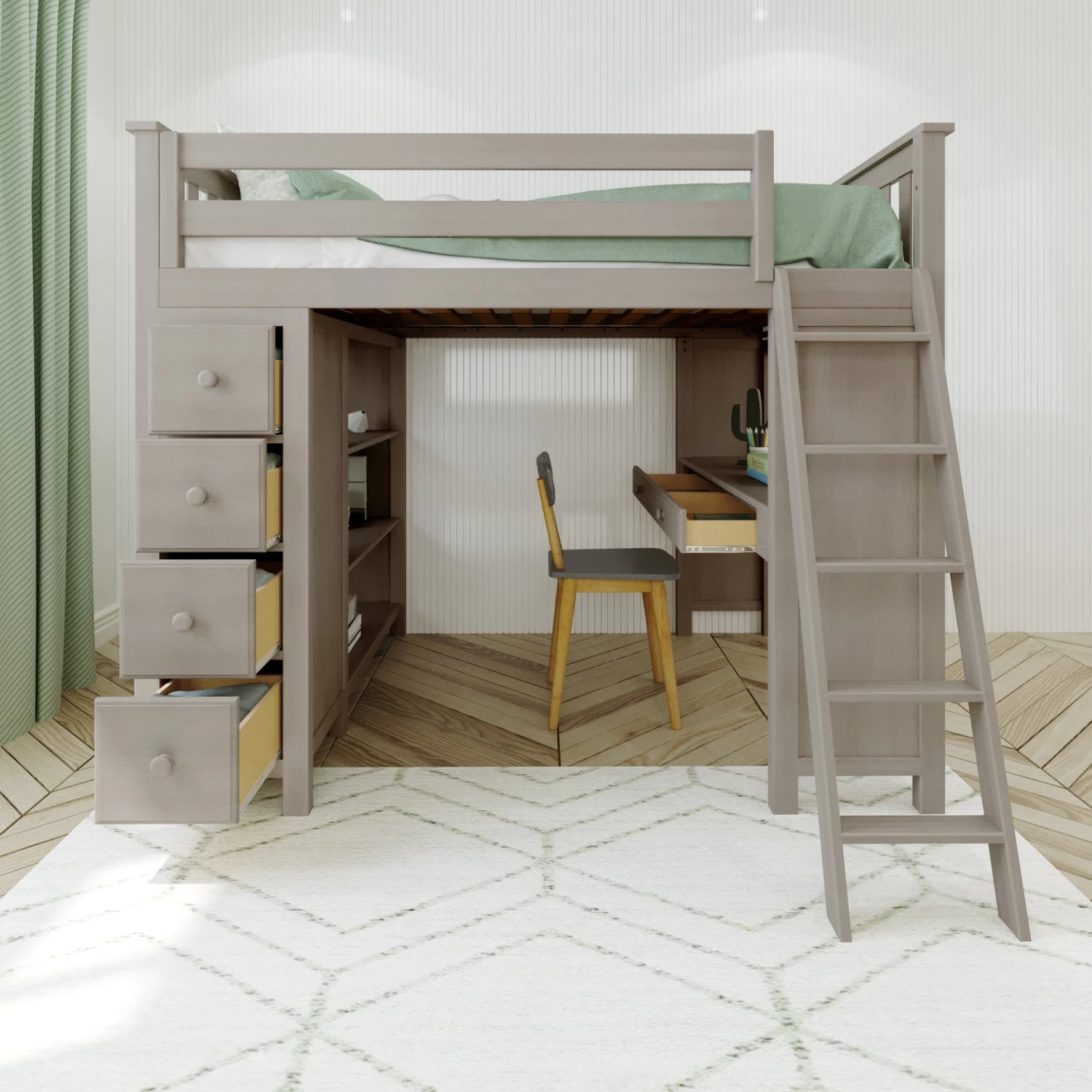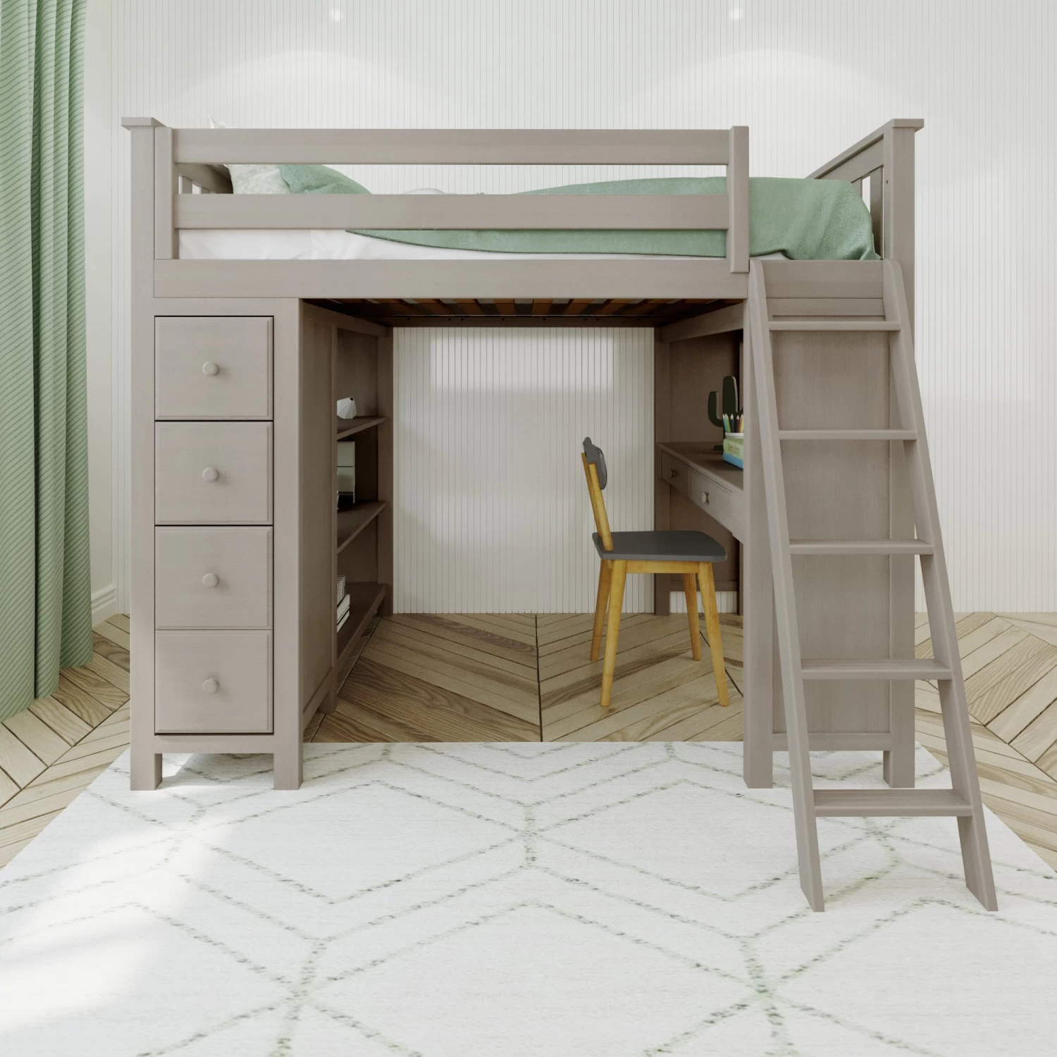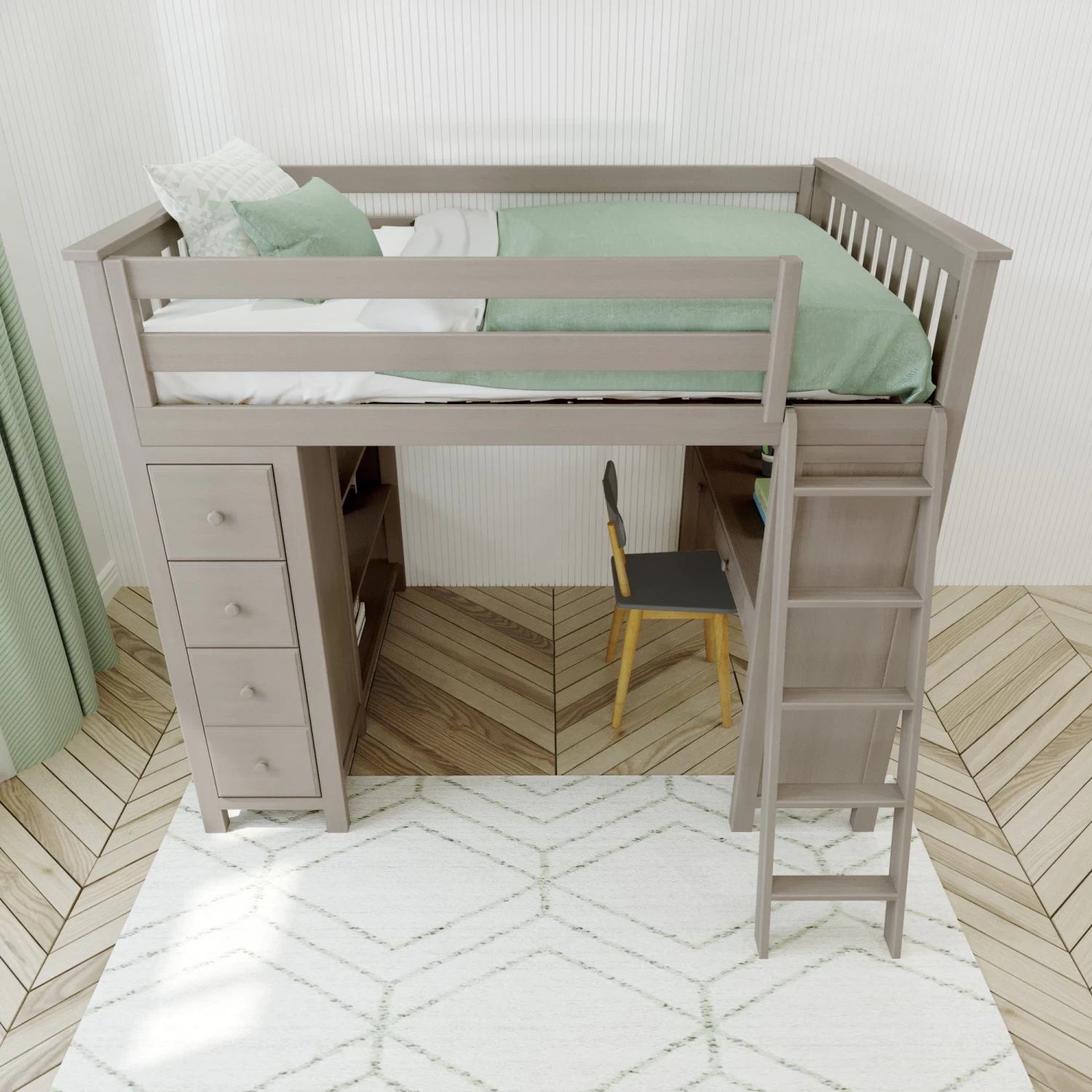 Made to store all your essentials, the Mayfair Loft Bed is the ideal sleep, study solution for your space. A desk with two drawers offers the perfect place for studying. Made to be both stylish and versatile, this desk can be assembled on either side of the bed for the ultimate space-saving design. Safety comes standard with extra tall 15″ guardrails. Storage is made simple thanks to a storage tower with extra-long shelves. The reversible ladder with rounded edges and grooved treads makes climbing up easy and comfortable. This loft bed’s raised design maximizes your space by opening up room underneath for an additional storage or lounge area. Crafted with solid, knot-free New Zealand pine wood and strong metal-on-metal connections, this bed’s frame offers sturdy support for years to come. Feel safe and secure with solid plywood slats and a metal support bar that offer a high 400 lb. resting weight capacity per sleeping surface. The beautiful slatted headboard and flush, color-matched hardware create a modern look. Durable, non-toxic low VOC finishes make this bed the clean, healthy choice for your home. Combining superior quality with classic design, this Loft with Desk + Storage is the perfect all-in-one choice for every room.