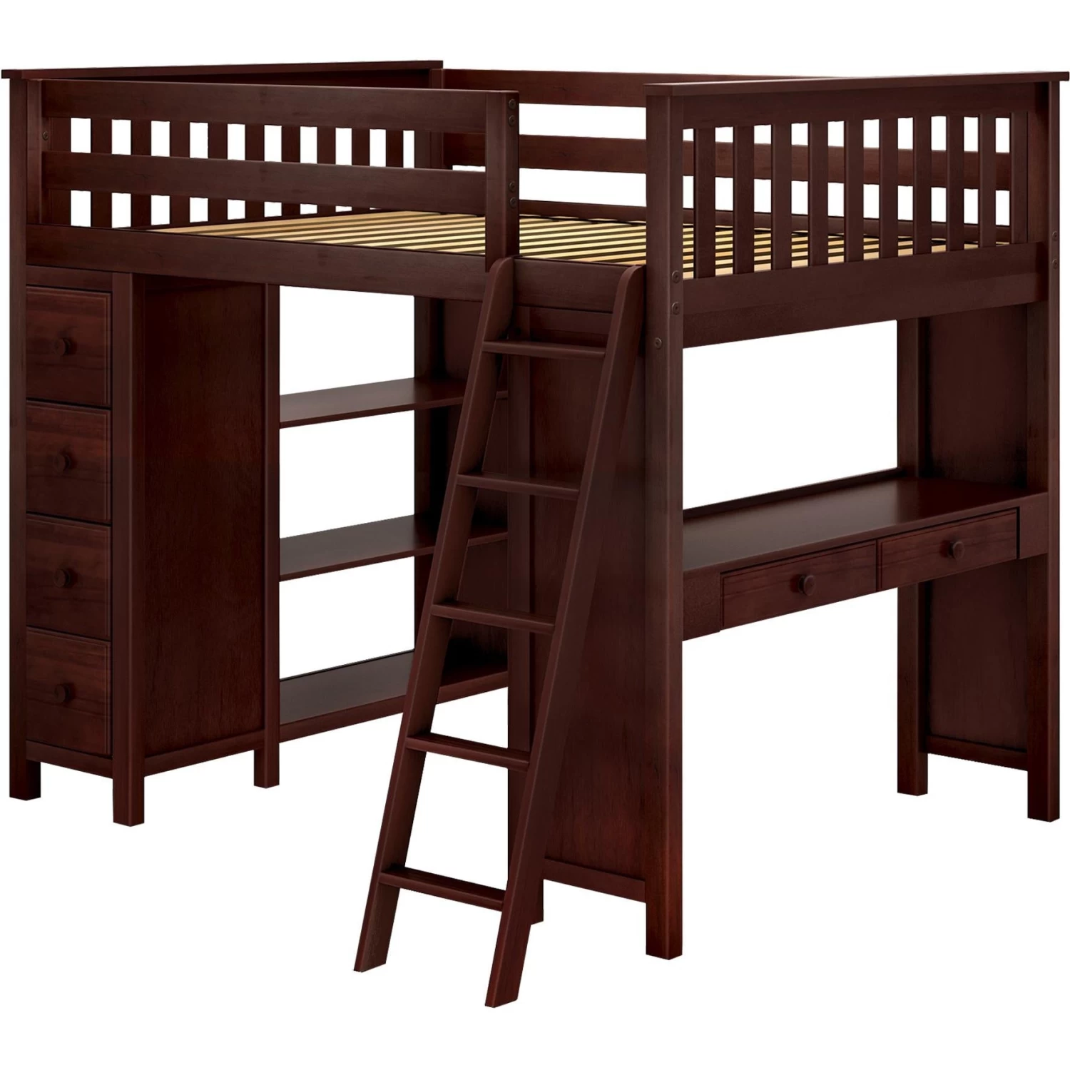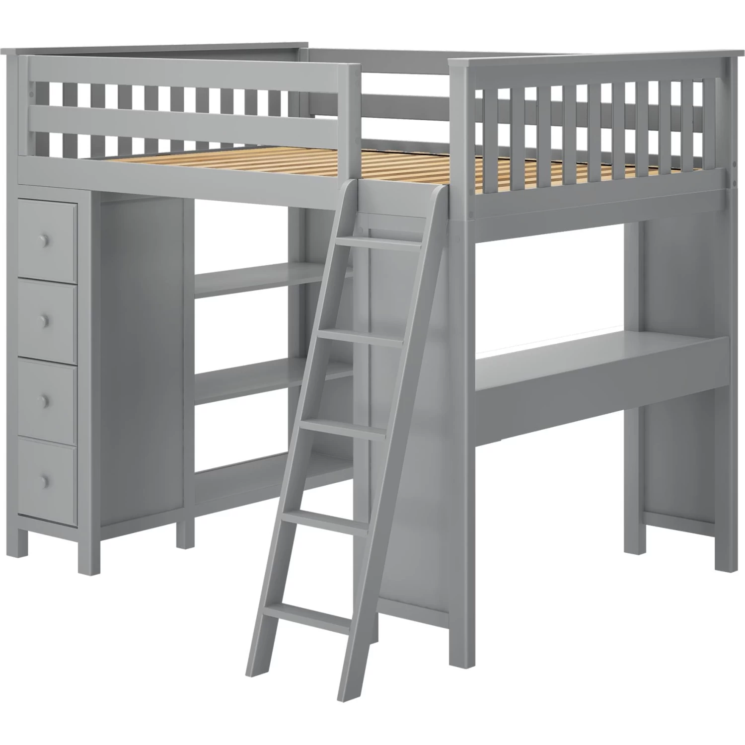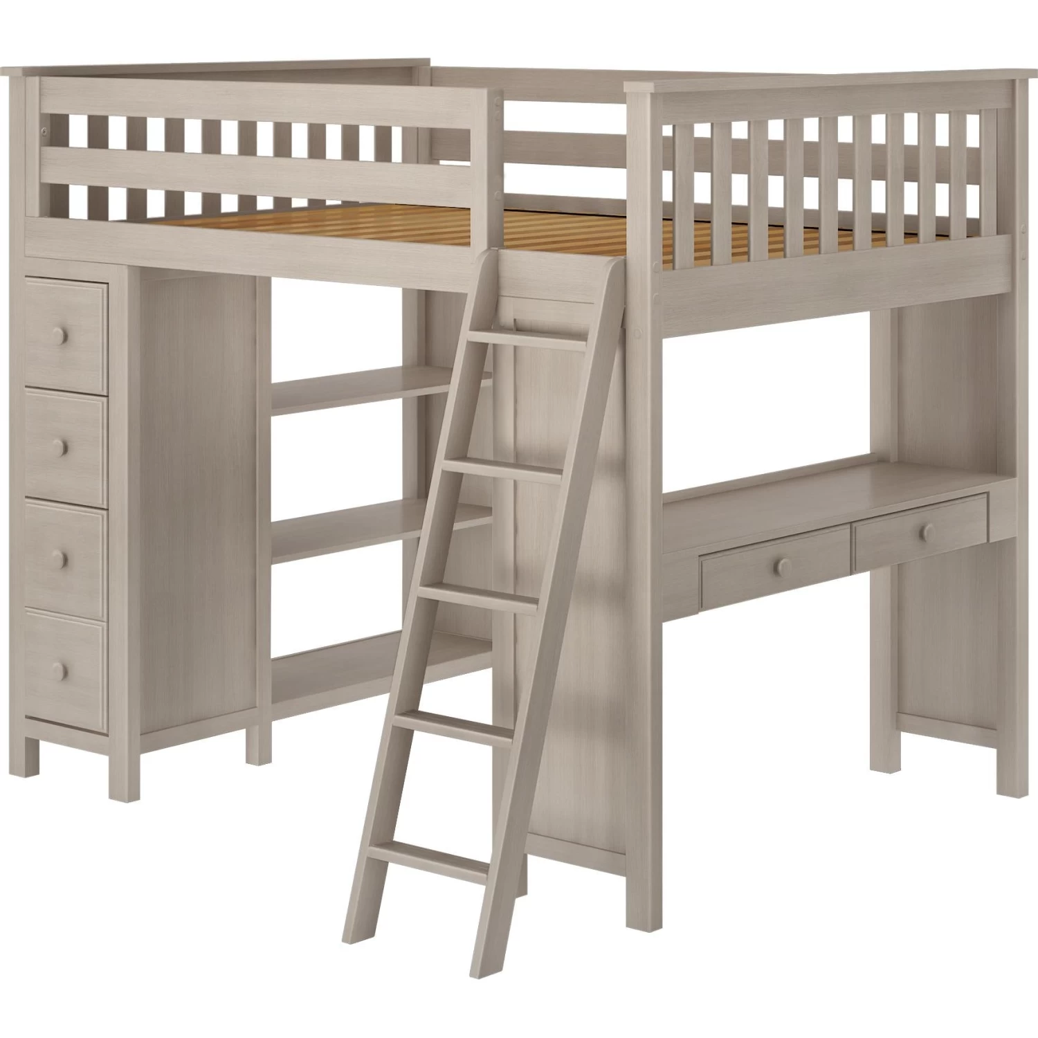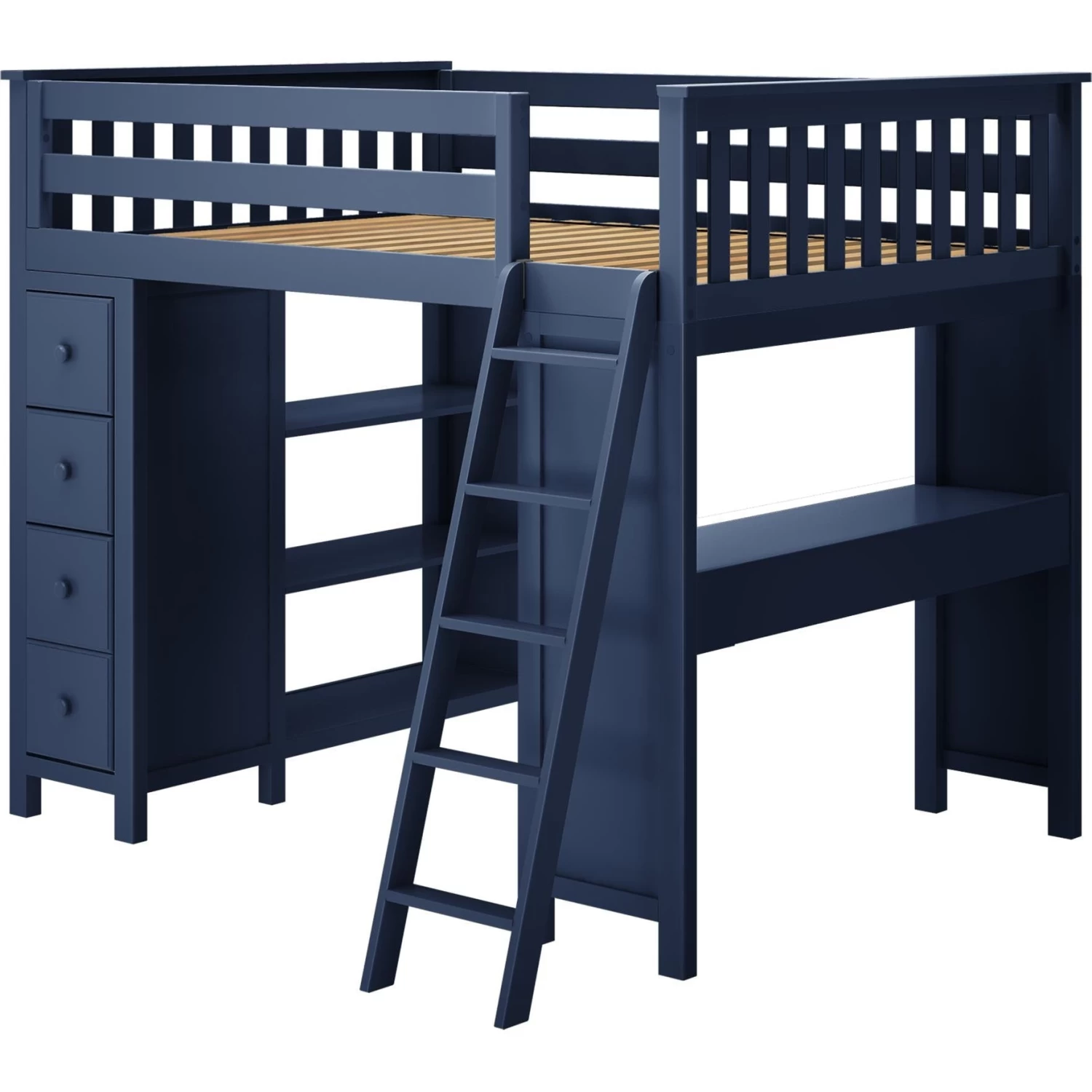 Made to store all your essentials, the Mayfair Loft Bed is the ideal sleep, study solution for your space. A desk with two drawers offers the perfect place for studying. Made to be both stylish and versatile, this desk can be assembled on either side of the bed for the ultimate space-saving design. Safety comes standard with extra tall 15″ guardrails. Storage is made simple thanks to a storage tower with extra-long shelves. The reversible ladder with rounded edges and grooved treads makes climbing up easy and comfortable. This loft bed’s raised design maximizes your space by opening up room underneath for an additional storage or lounge area. Crafted with solid, knot-free New Zealand pine wood and strong metal-on-metal connections, this bed’s frame offers sturdy support for years to come. Feel safe and secure with solid plywood slats and a metal support bar that offer a high 400 lb. resting weight capacity per sleeping surface. The beautiful slatted headboard and flush, color-matched hardware create a modern look. Durable, non-toxic low VOC finishes make this bed the clean, healthy choice for your home. Combining superior quality with classic design, this Loft with Desk + Storage is the perfect all-in-one choice for every room.