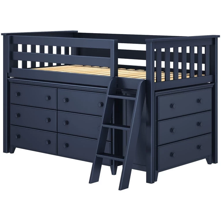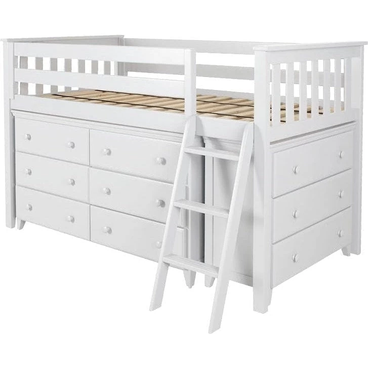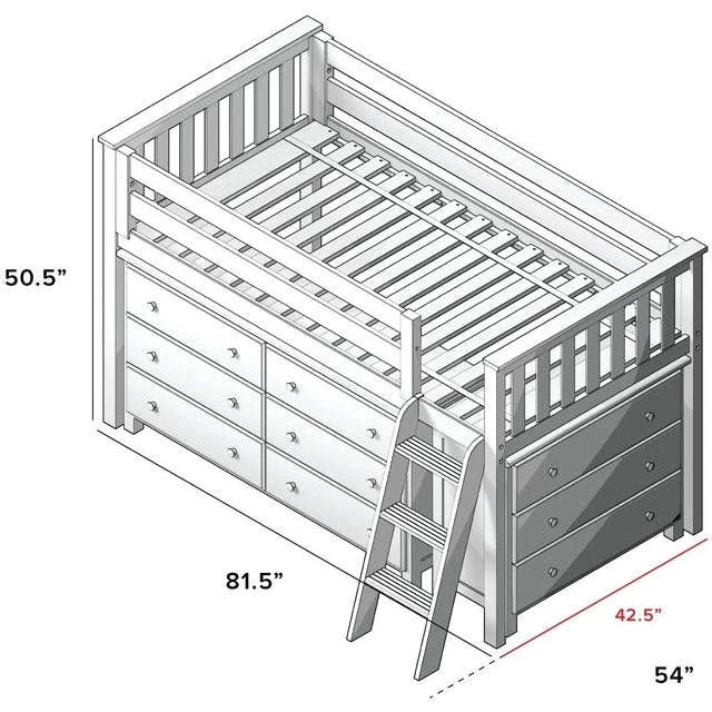 Create a total sleep/storage solution: Solid wood low loft with removable 6 drawer and 3 drawer dresser underneath. With tall 15″ guardrails the bed safely accommodates standard size mattresses. Angled ladder with grooved steps and rounded edges offers safe climbing. Super stable 400lb weight capacity per bed. Flush color coordinated hardware creates a clean & modern look. This bed meets or exceeds federal safety standards.