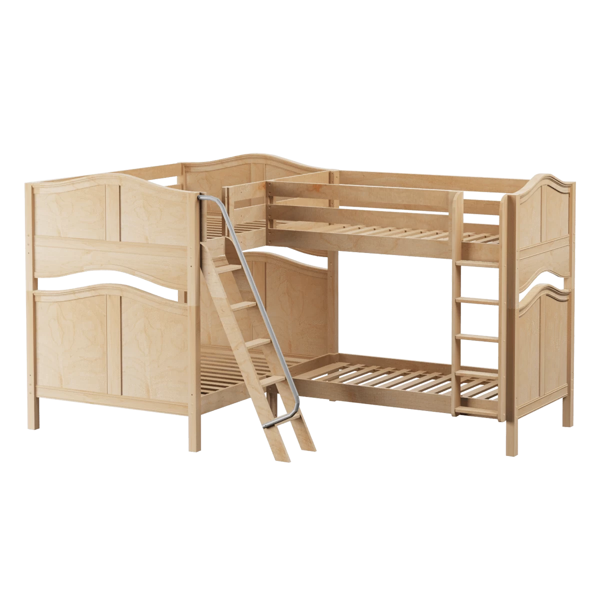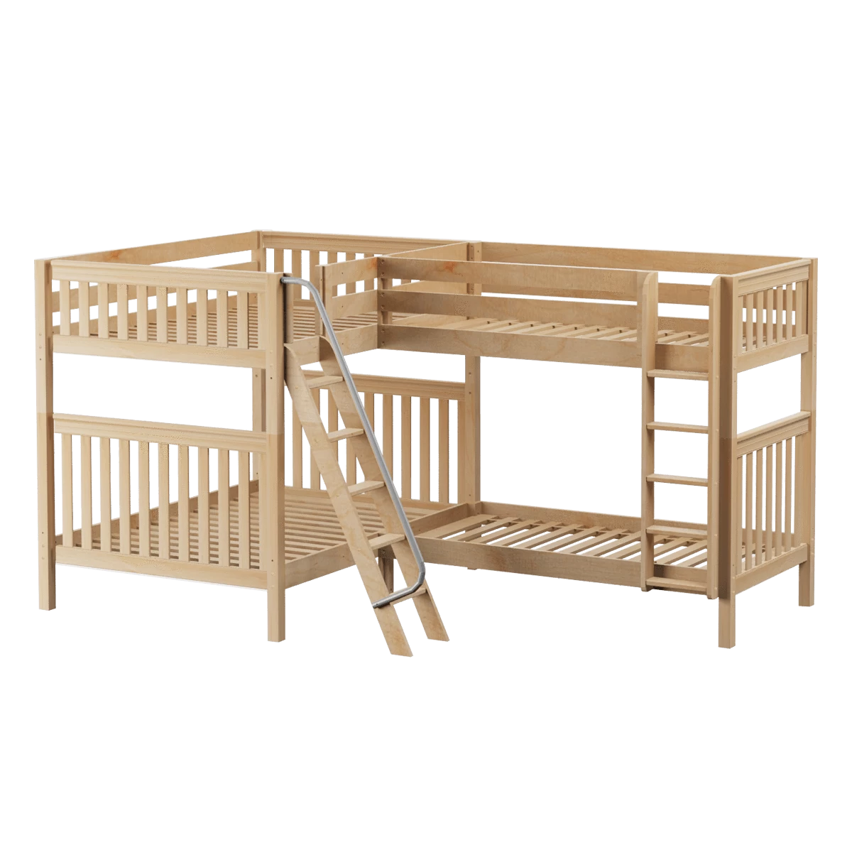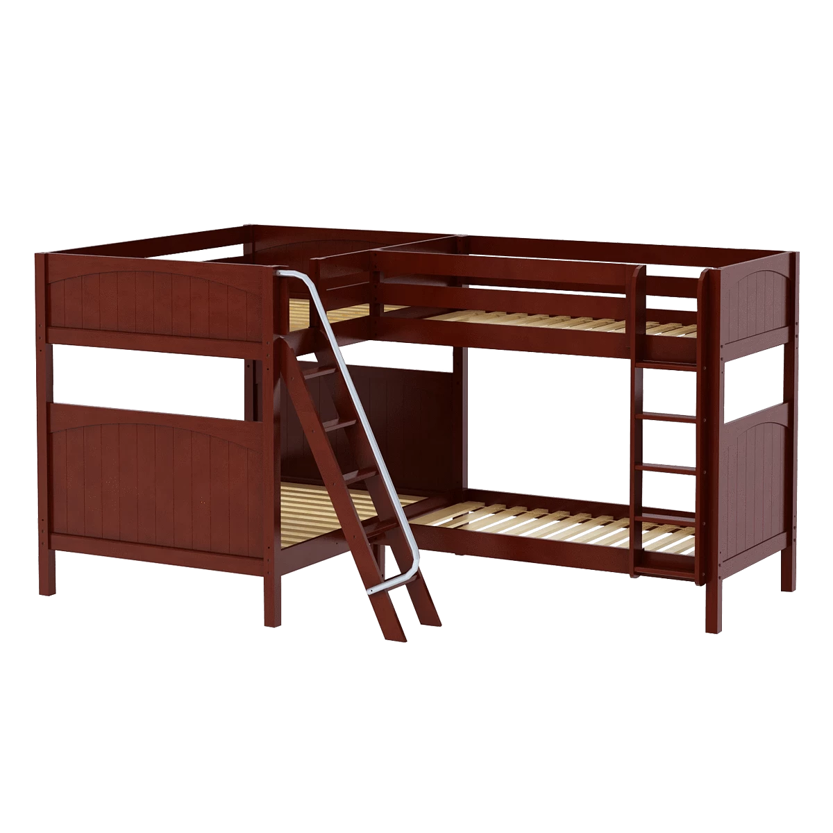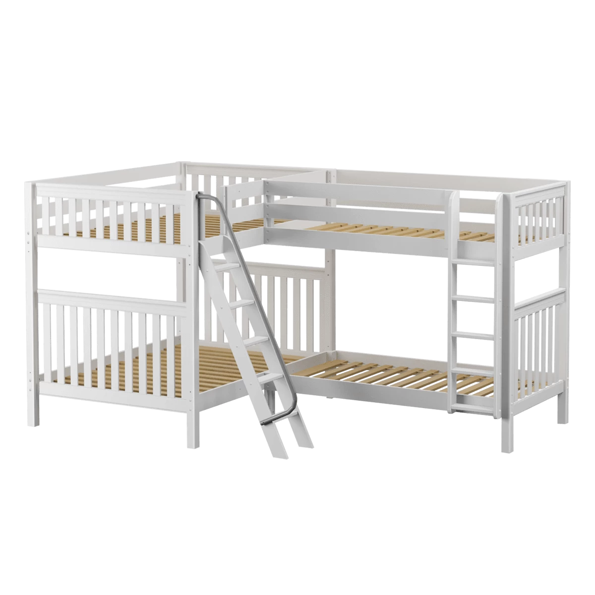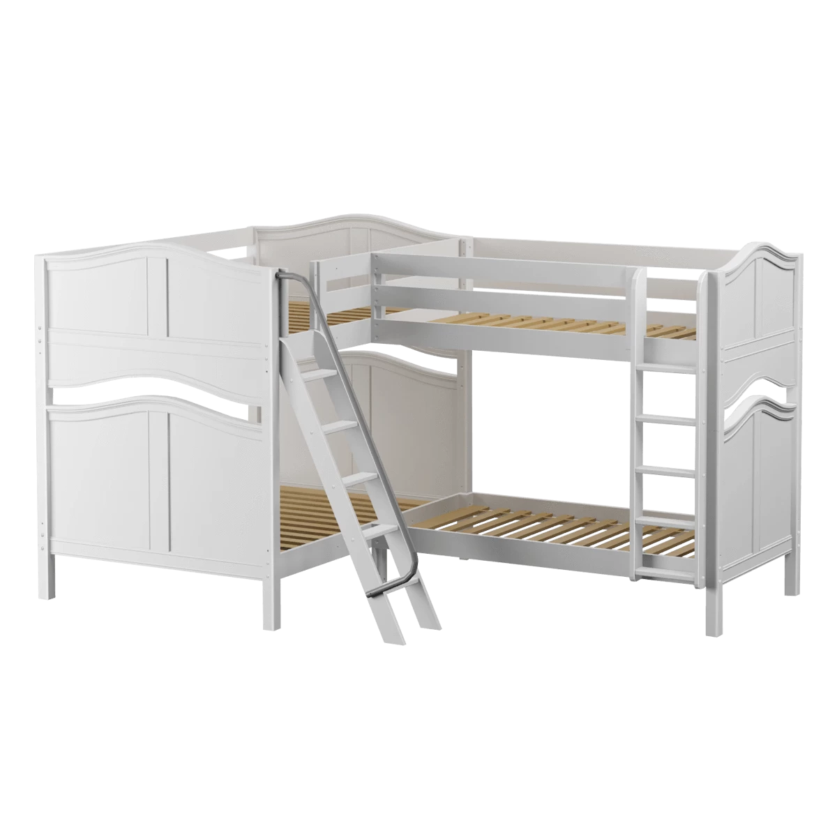 We connected a full size bunk + a twin bunk in an “L” shape to fit perfectly in a bedroom corner. This space-saving design sleeps 4 (or more!), making it the perfect solution for a shared bedroom or vacation home. Easy-to-climb, solid wood ladders on each end for dual access points. Patented Rock Lock system keeps stacked beds super sturdy and secure.