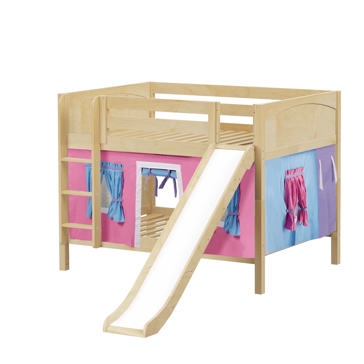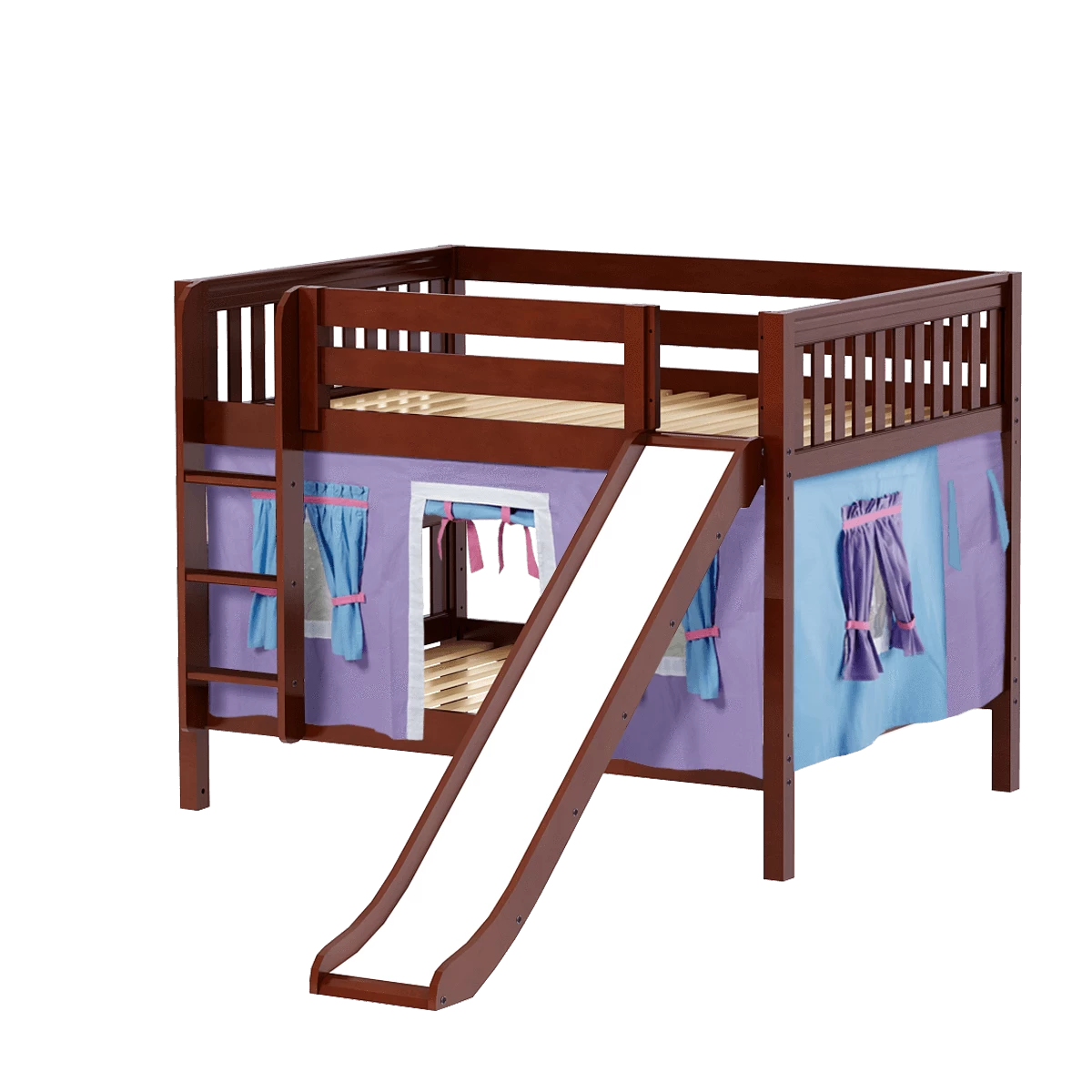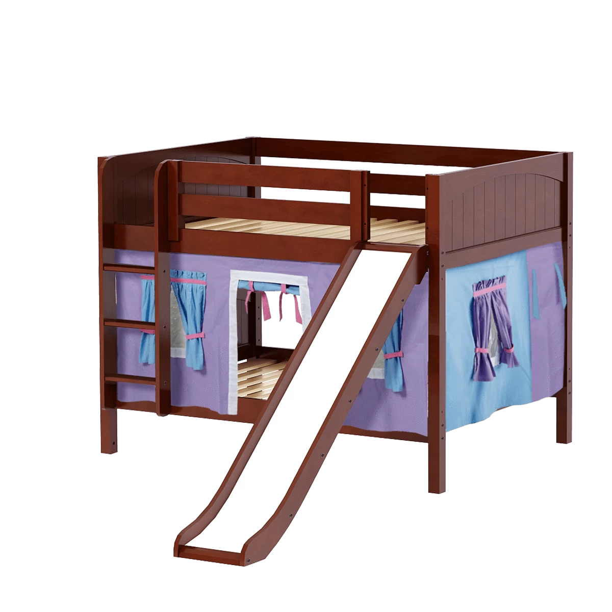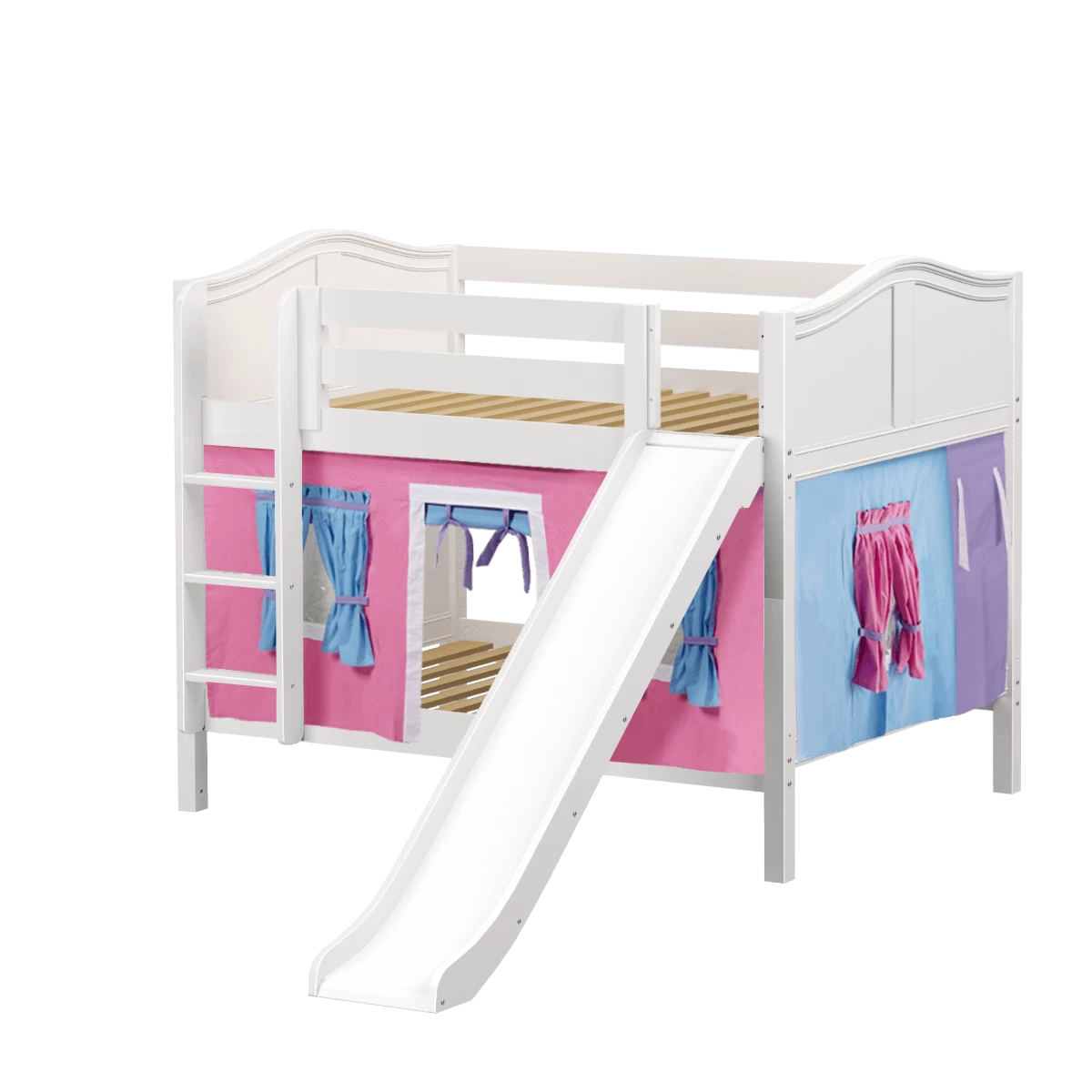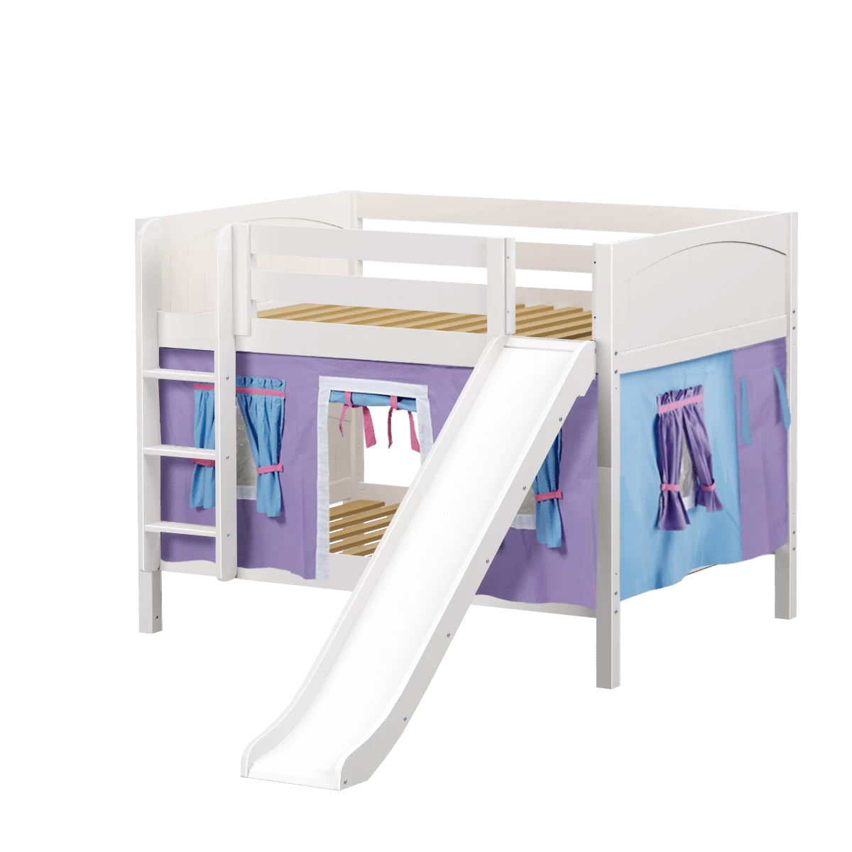 Colorful curtains and super fun slide turn our low bunk with straight ladder into an adorable playhouse bed! Stacked design sleeps two comfortably – low height is perfect for small rooms and little ones. Full size = extra room for growing kids, sleepovers or snuggling with parents.