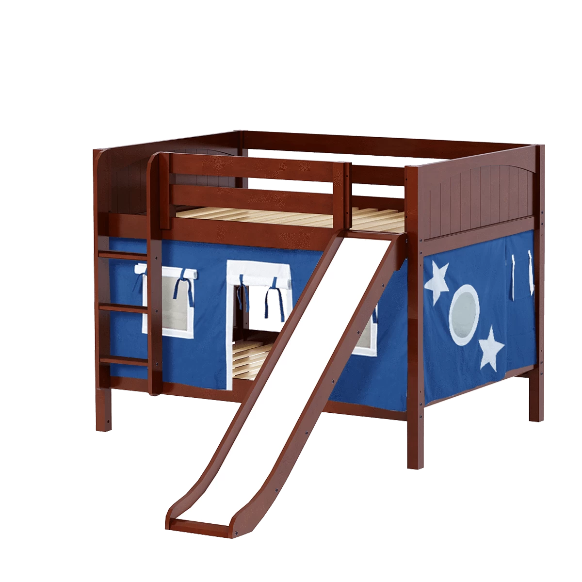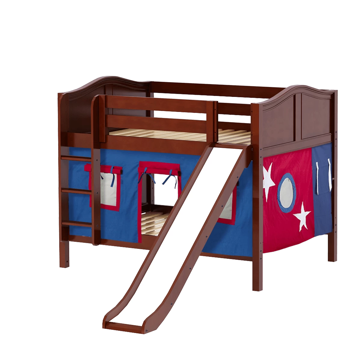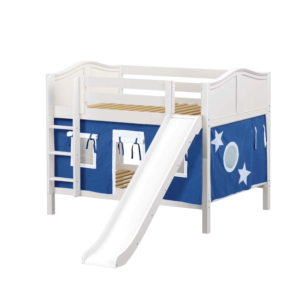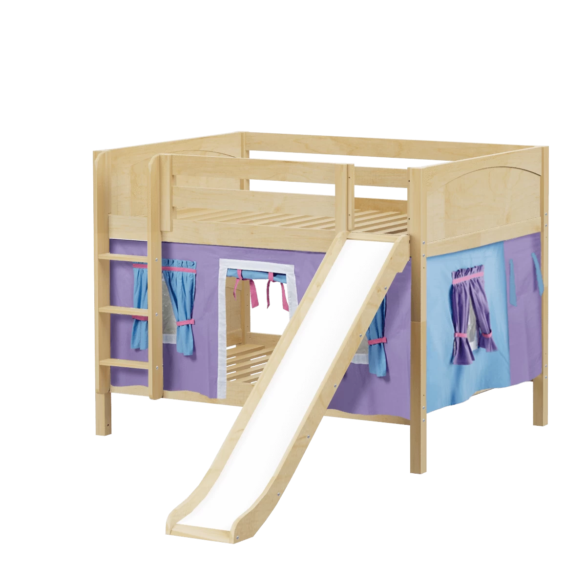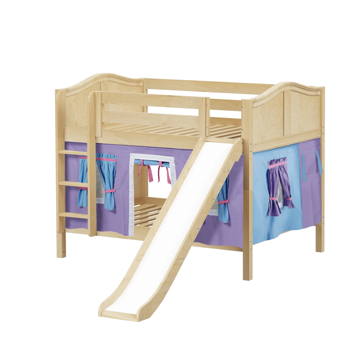 Colorful curtains and super fun slide turn our low bunk with straight ladder into an adorable playhouse bed! Stacked design sleeps two comfortably – low height is perfect for small rooms and little ones. Full size = extra room for growing kids, sleepovers or snuggling with parents.