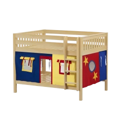 Colorful curtains turn our classic low bunk into an adorable playhouse! Stacked design is a space-saving way to sleep two in one room. Straight ladder sits flush for a clean finish + easy trundle or storage drawer use. Full size = extra room for growing kids, sleepovers or snuggling with parents.