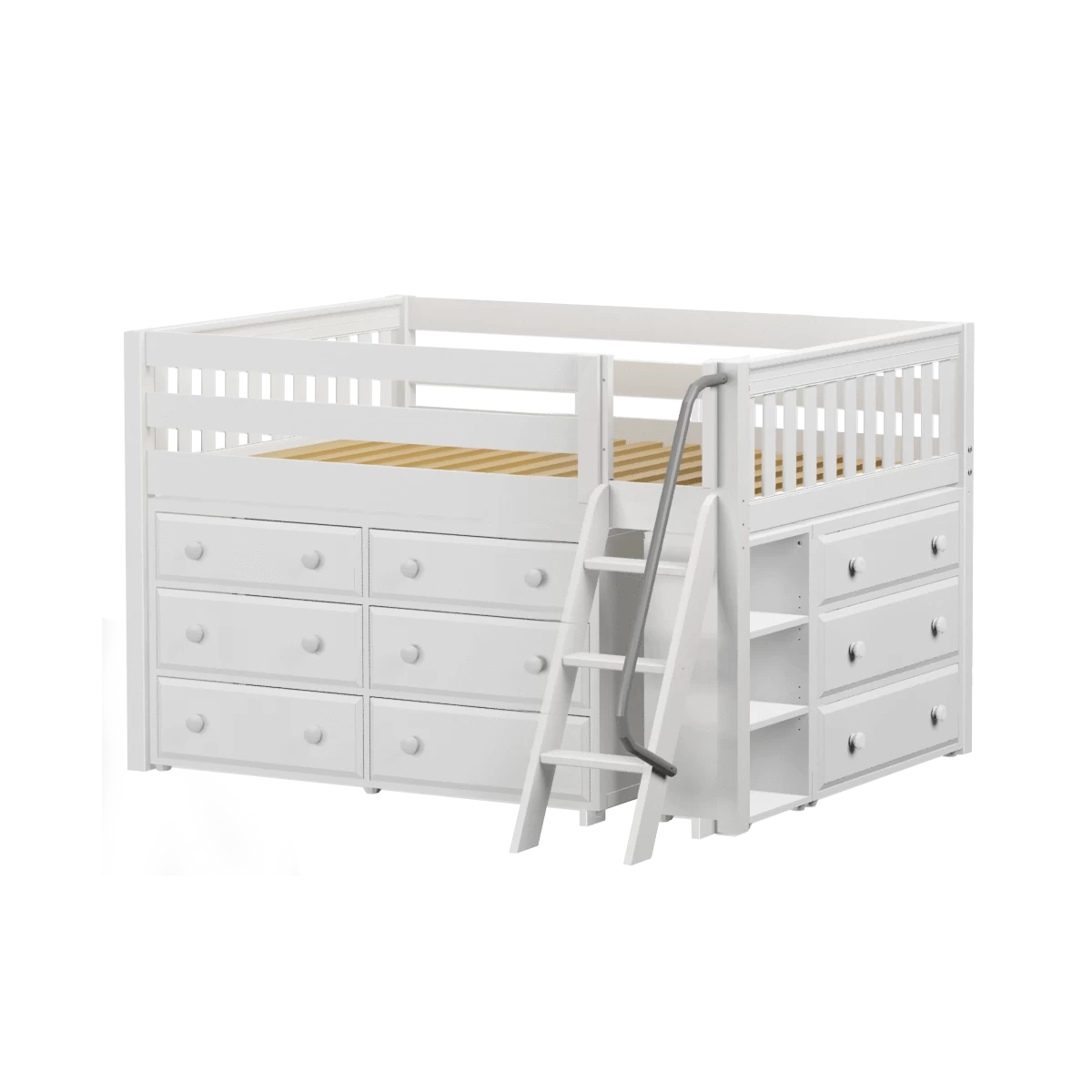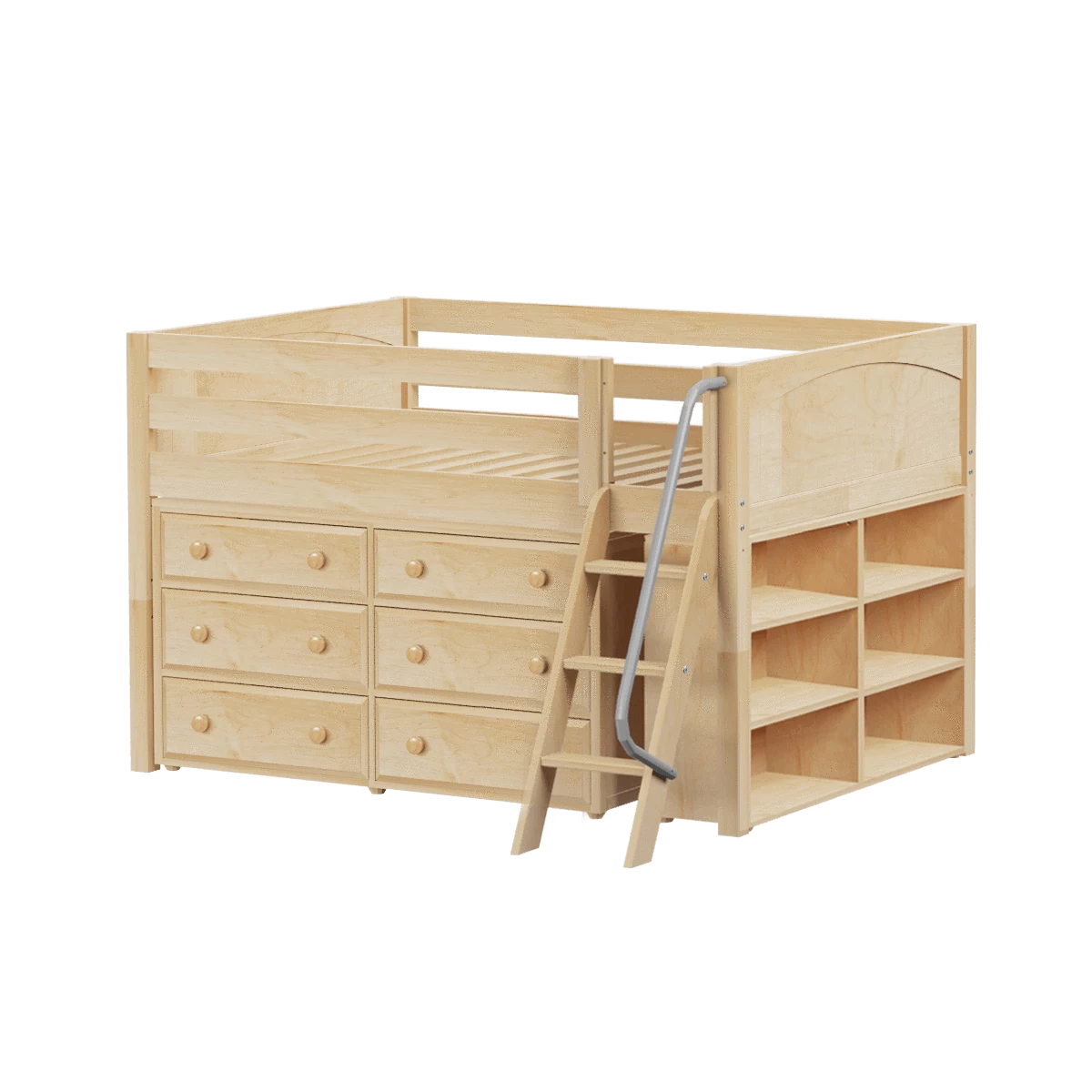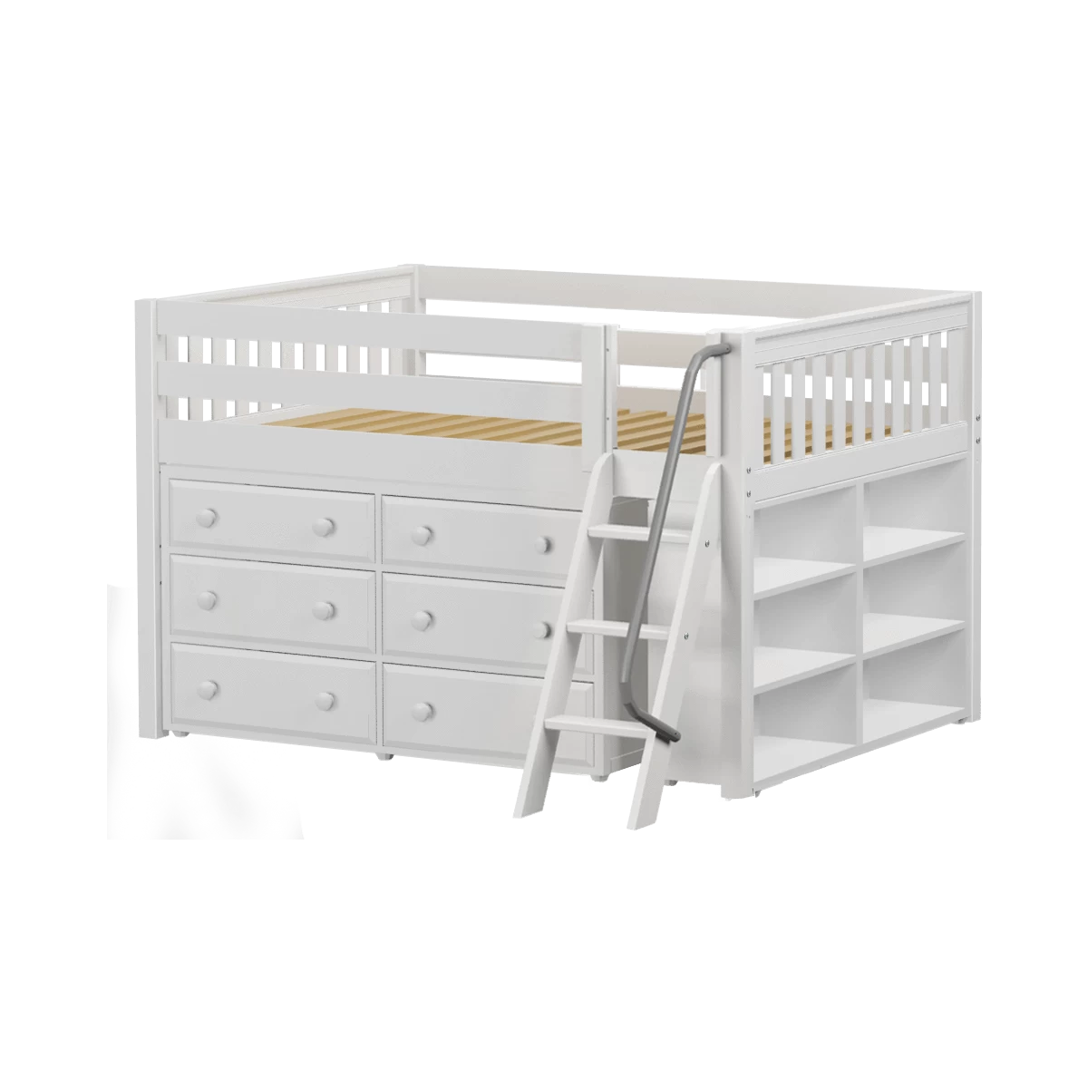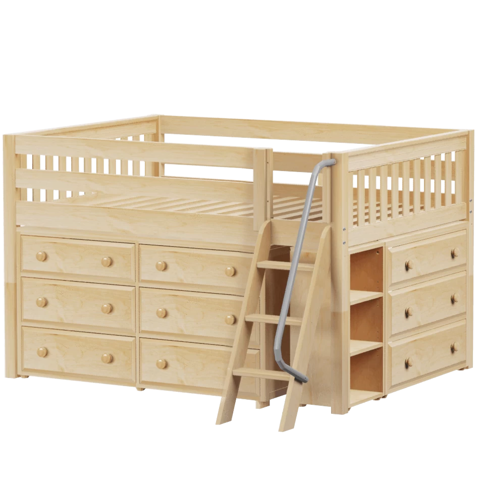 Our classic low loft bed with angled ladder becomes the ultimate storage cube! Dressers, bookcases + cube units all designed to fit perfectly. Each piece is freestanding so you can use separately for years to come. Full size = extra room for growing kids, sleepovers or snuggling.