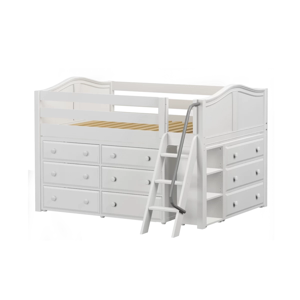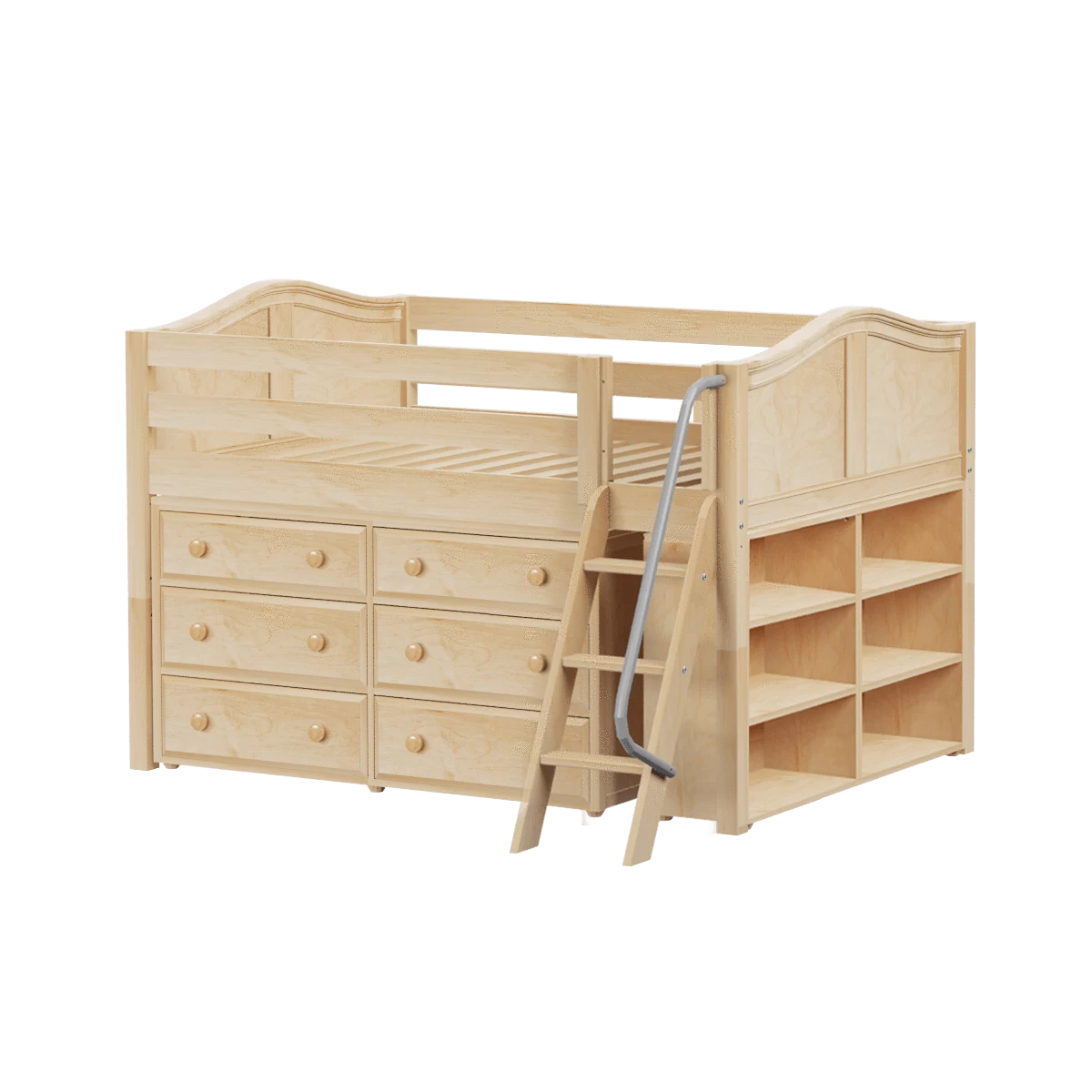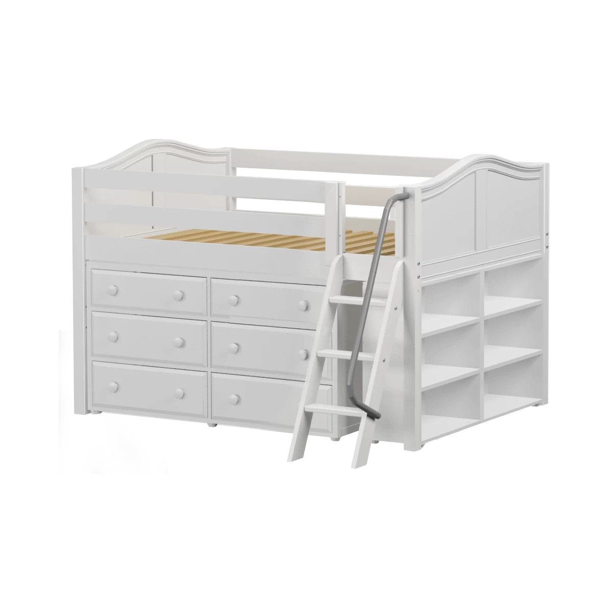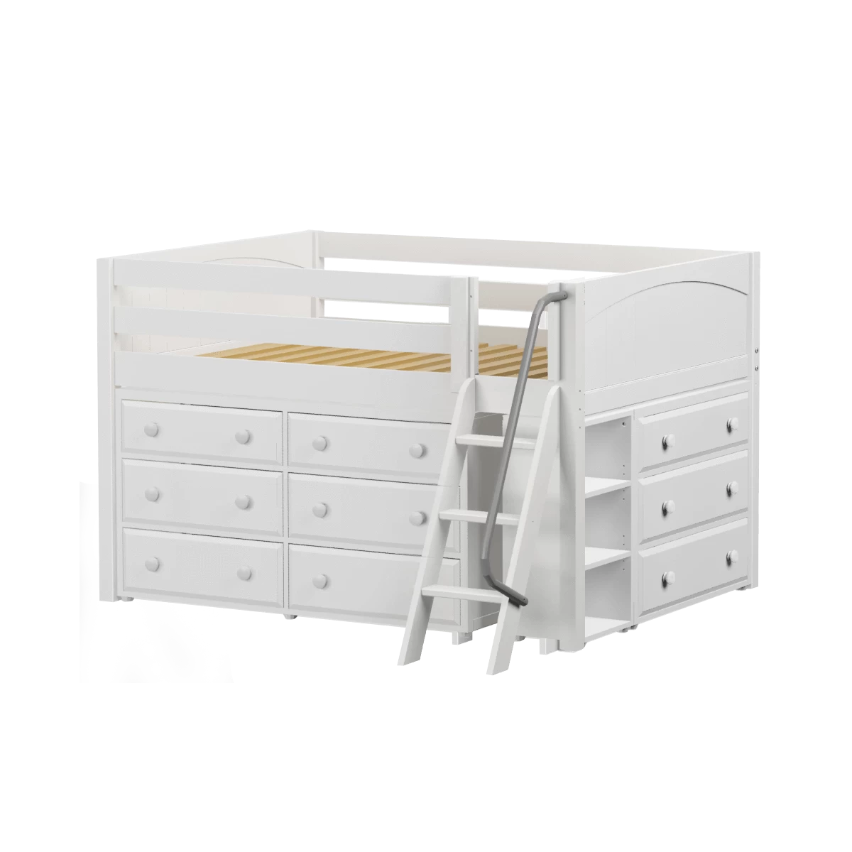 Our classic low loft bed with angled ladder becomes the ultimate storage cube! Dressers, bookcases + cube units all designed to fit perfectly. Each piece is freestanding so you can use separately for years to come. Full size = extra room for growing kids, sleepovers or snuggling.