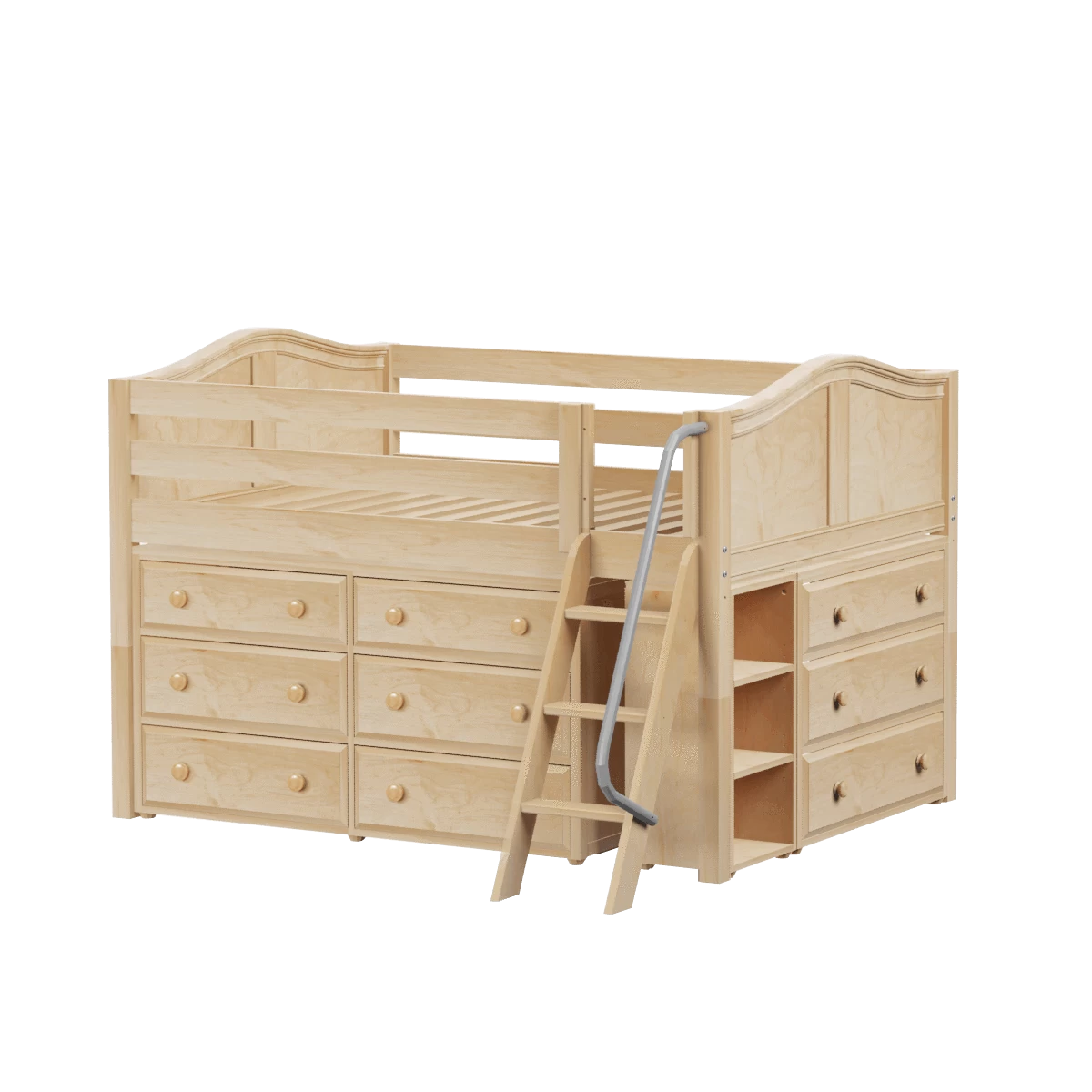 Gain storage without losing floorspace! Our low loft bed with storage is the perfect solution for anyone tight on space or just wanting to keep rooms tidy + organized.