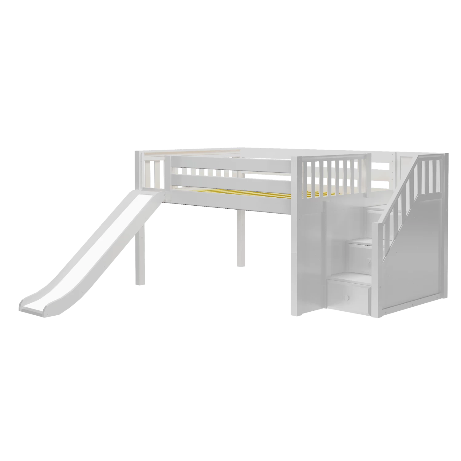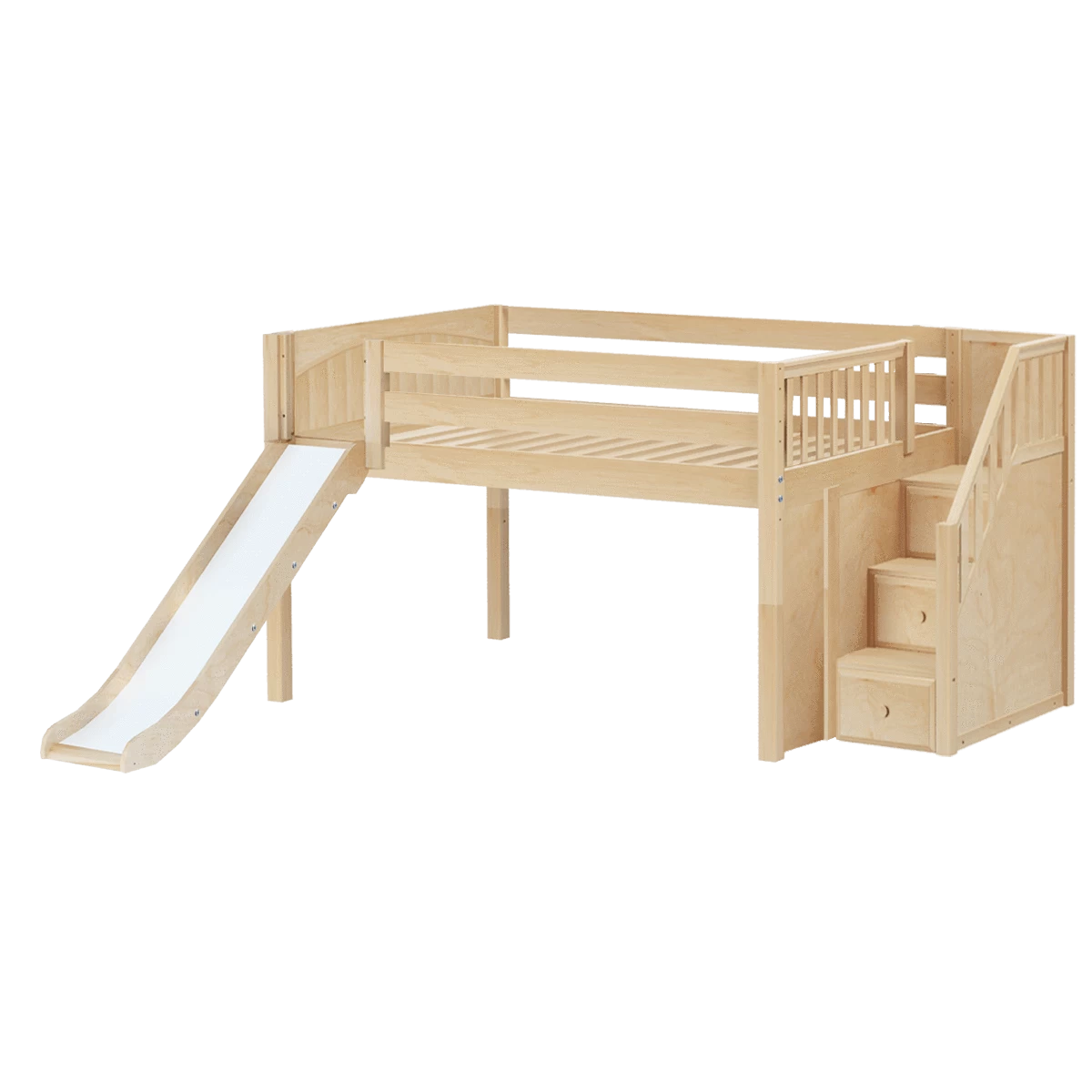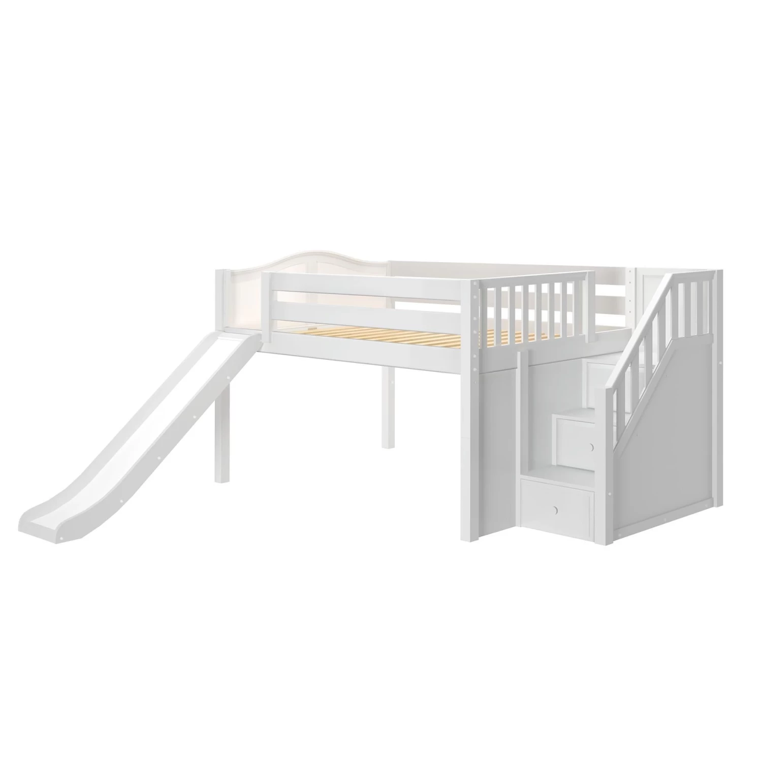 Create the perfect space for sleep and play with our popular low loft bed with stairs and slide. Steps are a safe way for younger children to climb + double as storage drawers, while slide adds pure fun! Full size = extra room for growing kids, sleepovers or snuggling with parents.