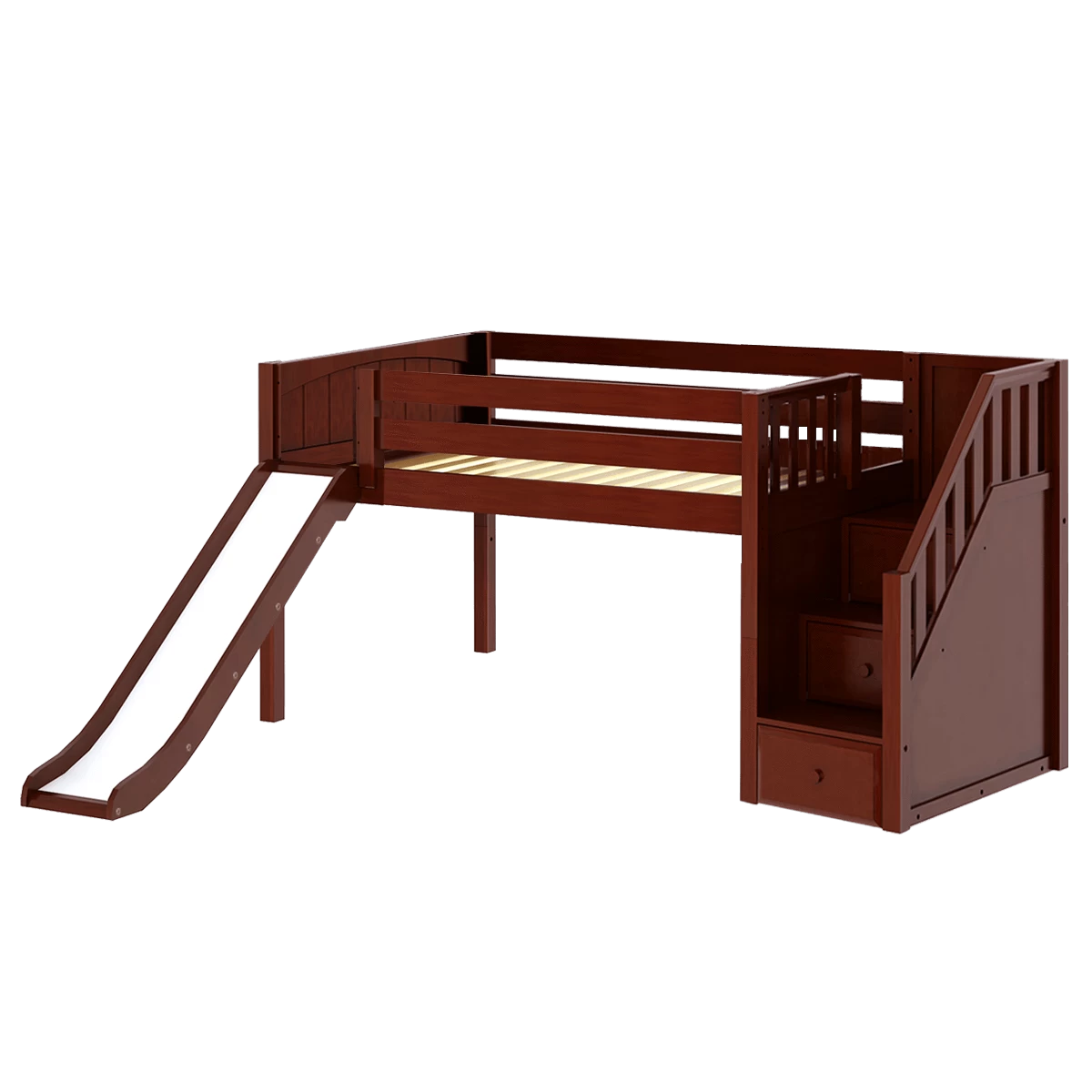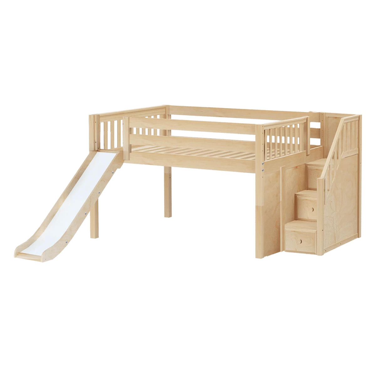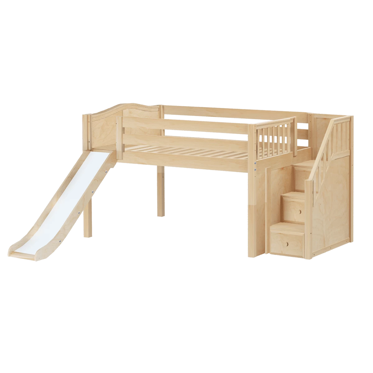 Create the perfect space for sleep and play with our popular low loft bed with stairs and slide. Steps are a safe way for younger children to climb + double as storage drawers, while slide adds pure fun! Full size = extra room for growing kids, sleepovers or snuggling with parents.