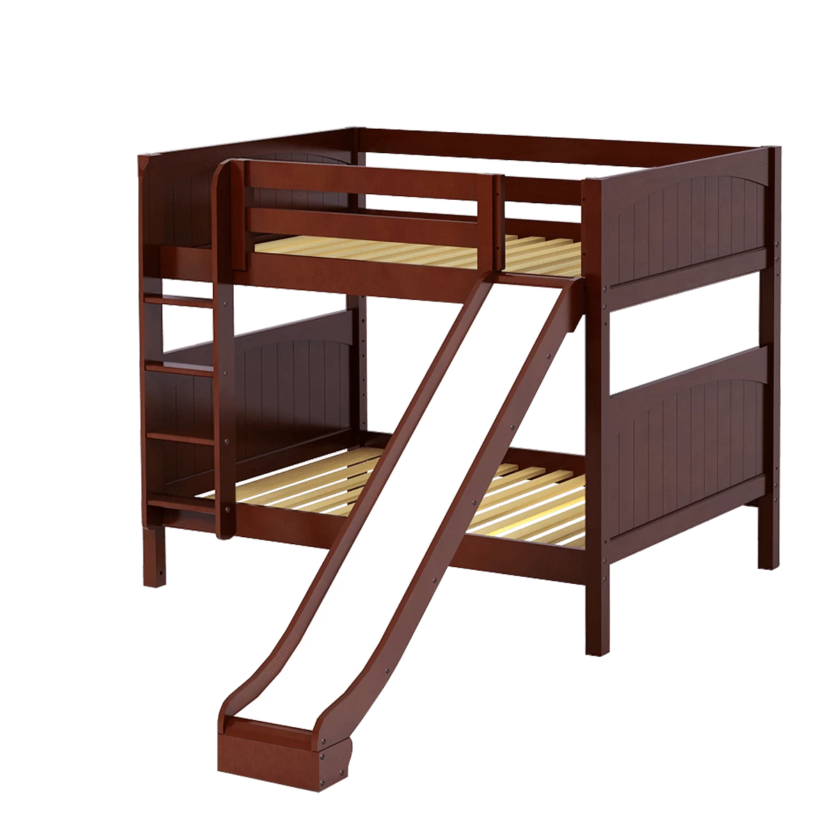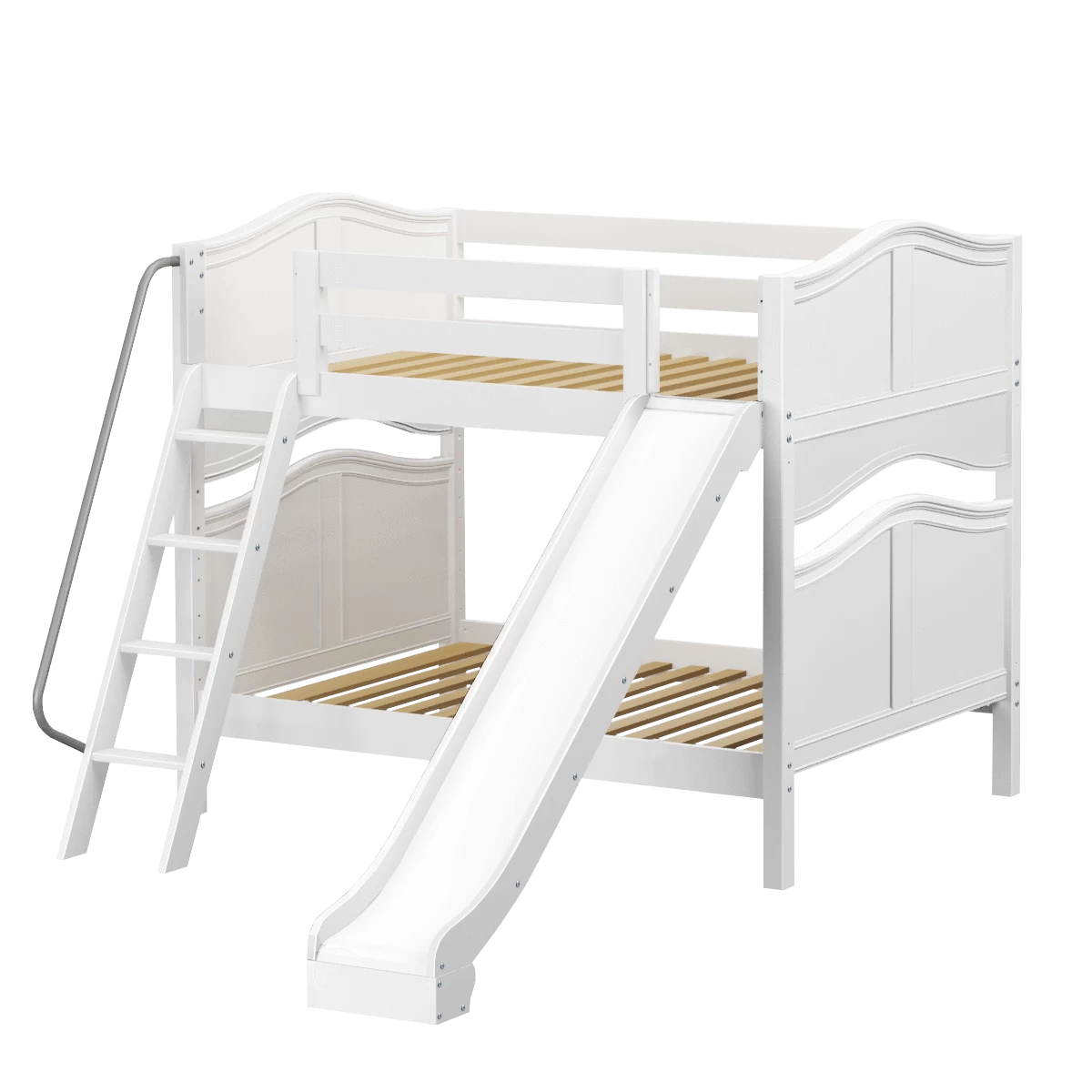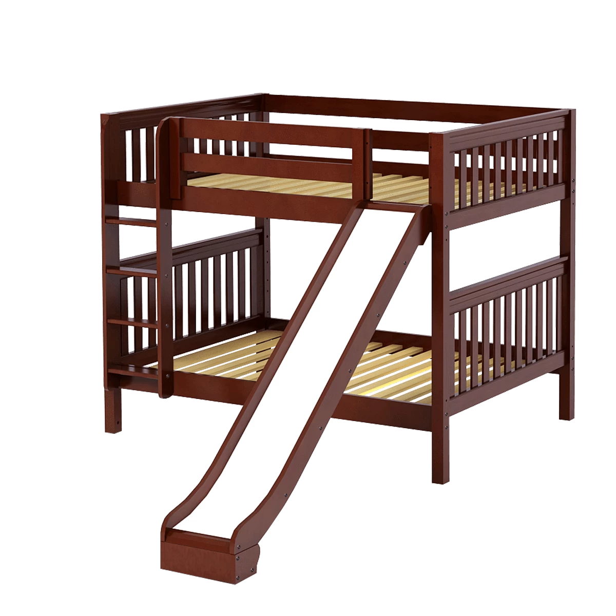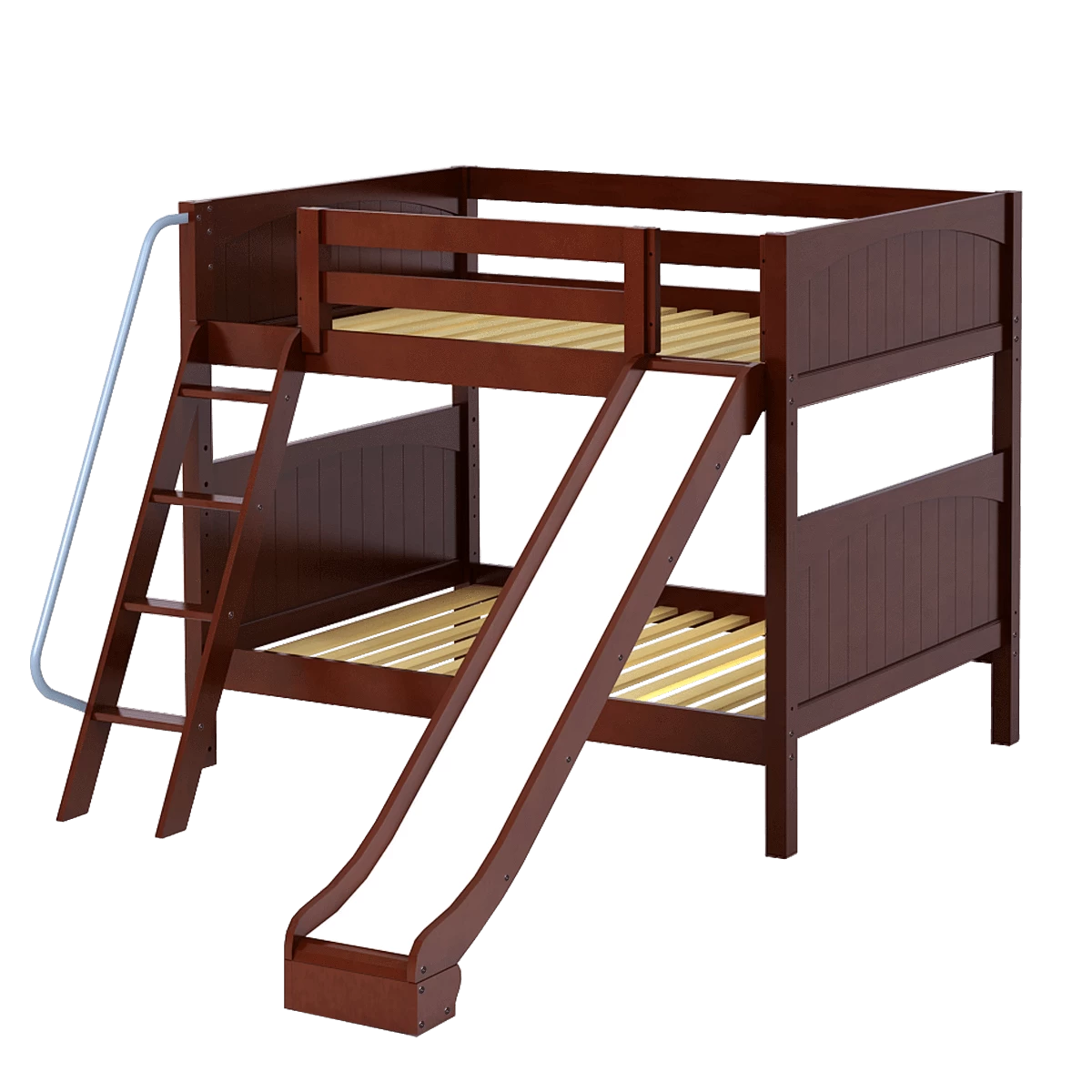 We added a slide to our best-selling style for the ultimate combination of fun and function. Full size = extra room for growing kids, sleepovers or snuggling with parents. Medium height bunk designed with more space between beds, but still safe enough little ones + fits average ceilings.