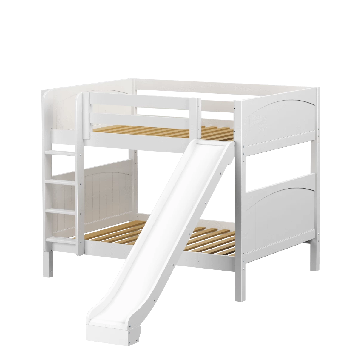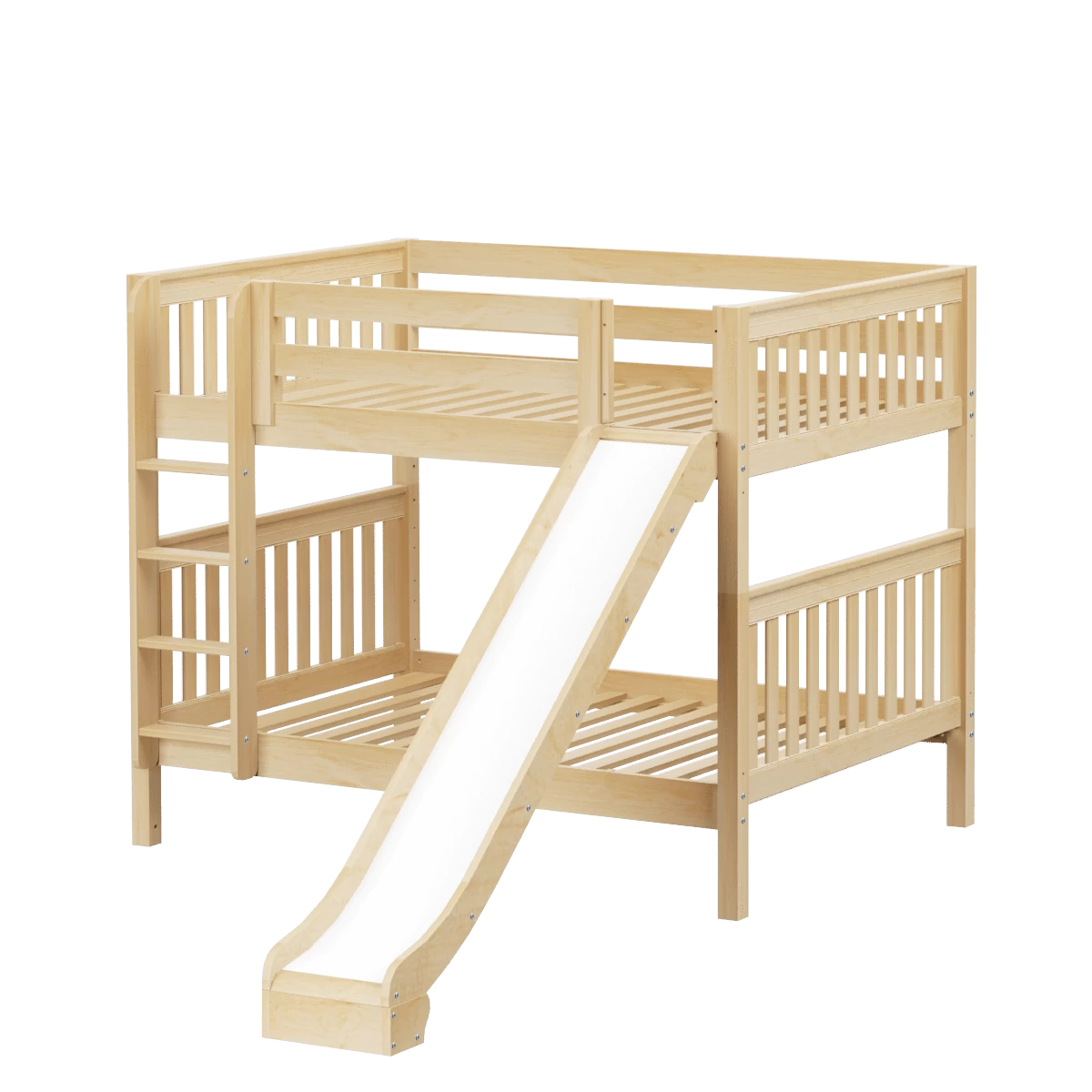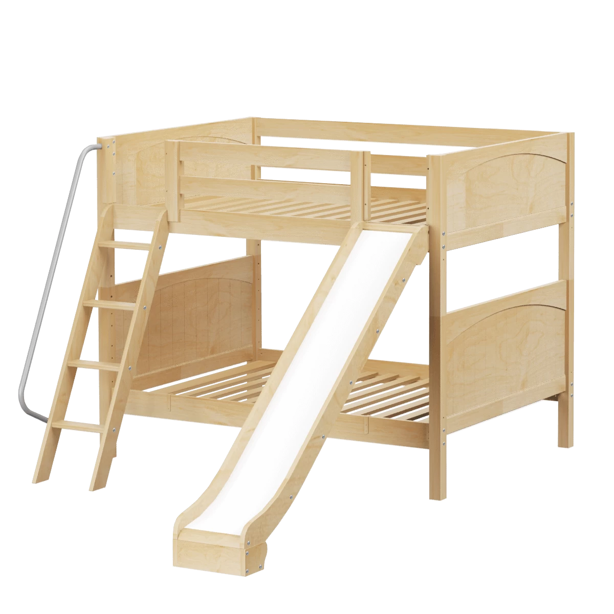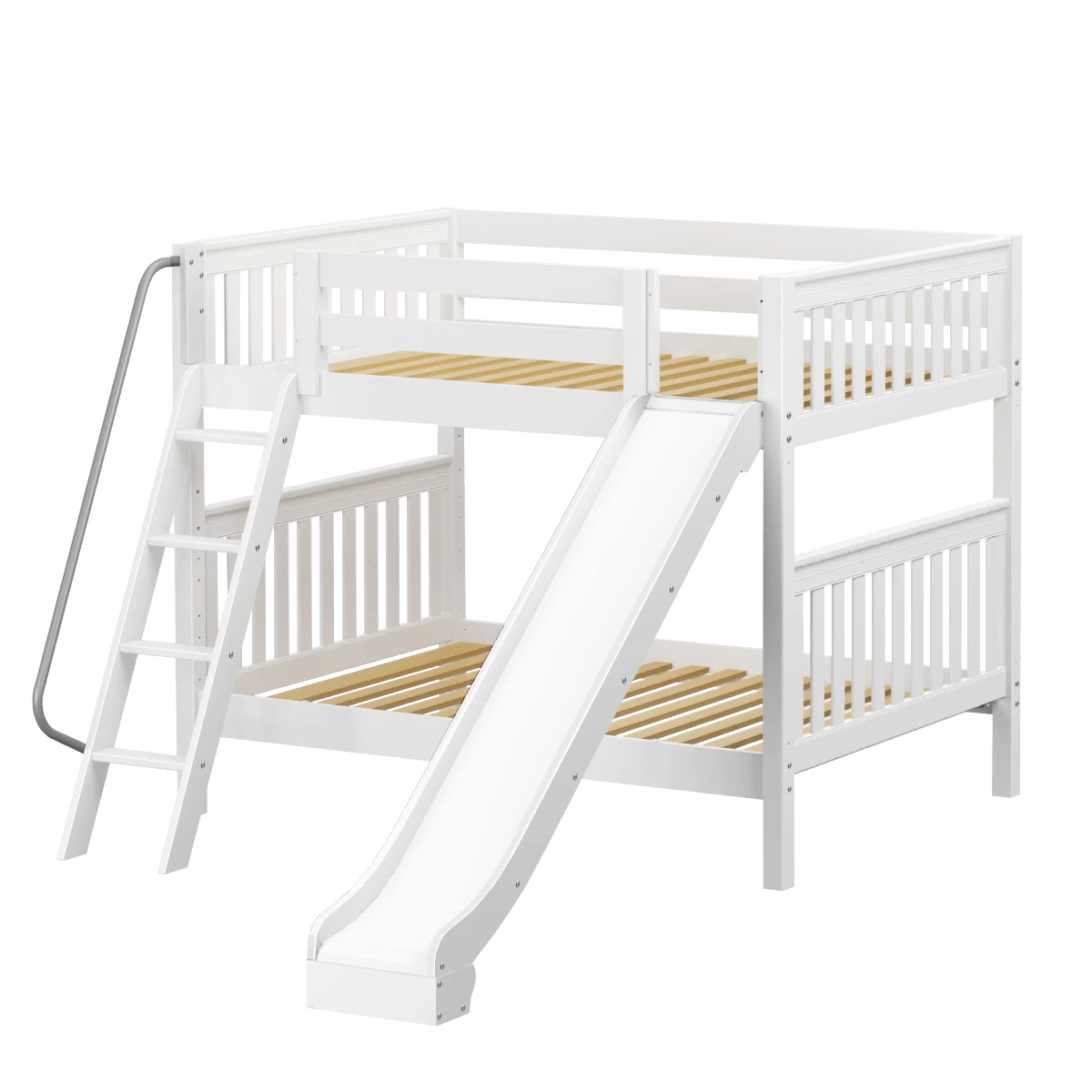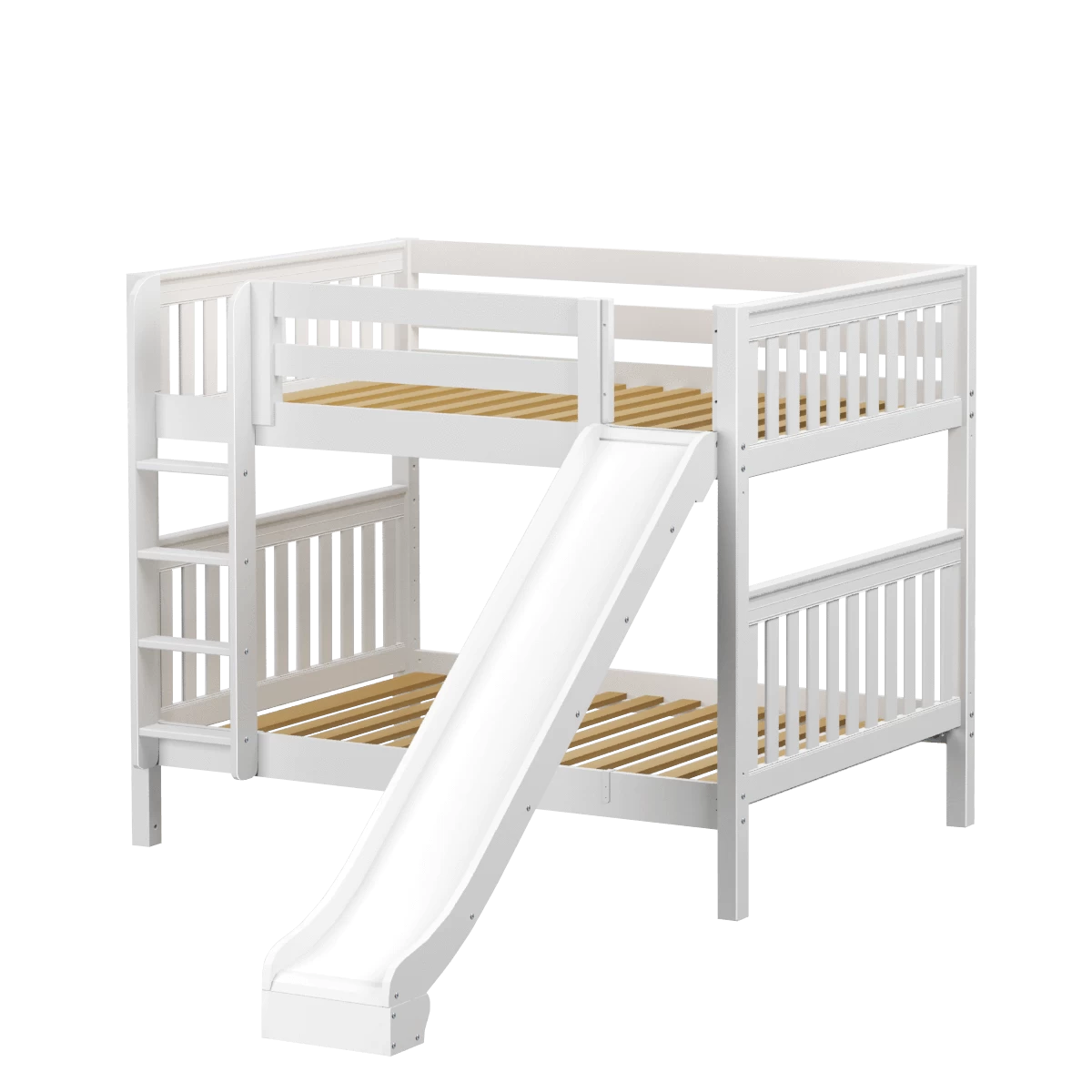 We added a slide to our best-selling style for the ultimate combination of fun and function. Full size = extra room for growing kids, sleepovers or snuggling with parents. Medium height bunk designed with more space between beds, but still safe enough little ones + fits average ceilings.