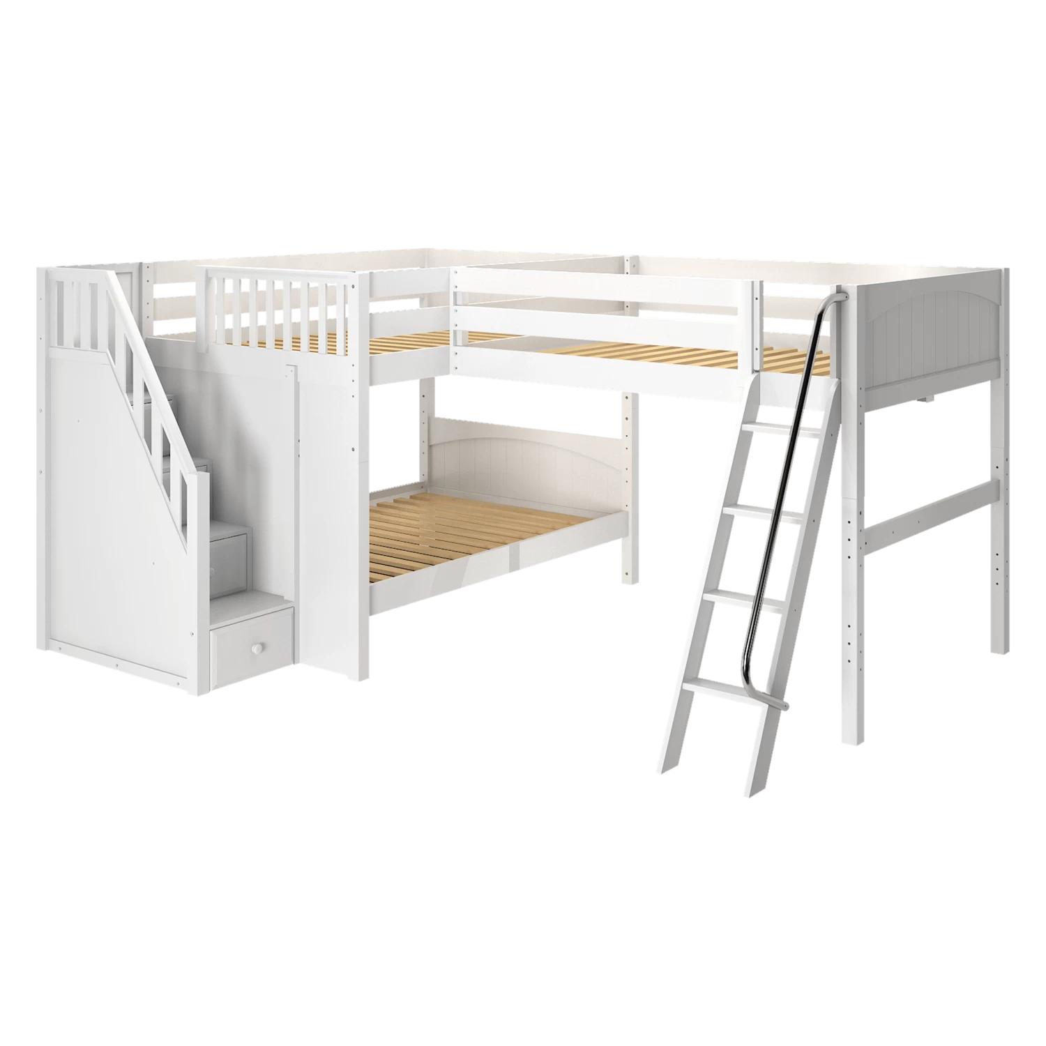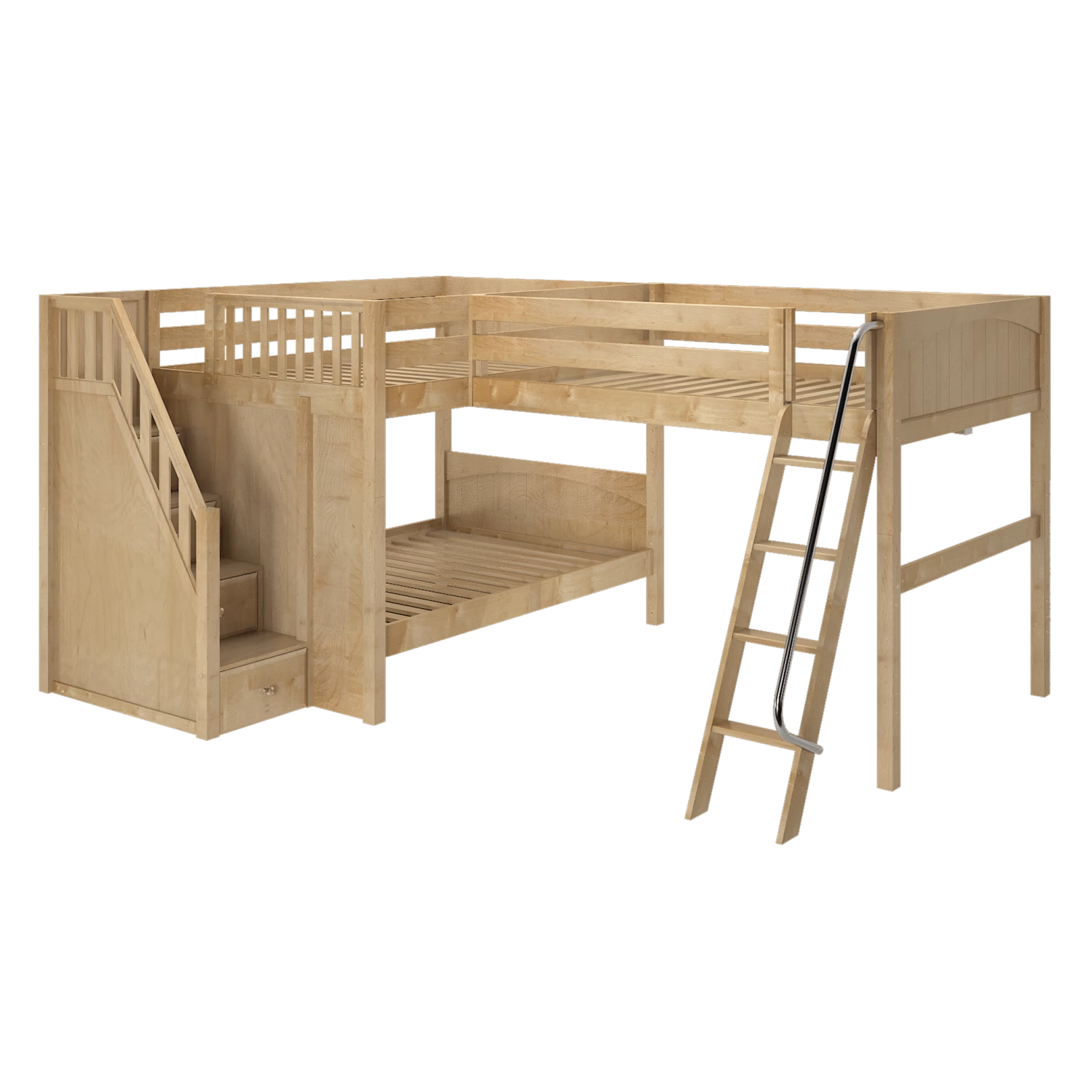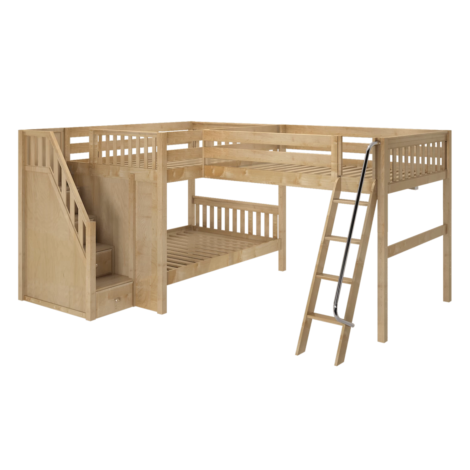 Sleep 3 without sacrificing all of your floorspace! We combined a full-size bunk bed + twin-size loft bed in a unique “L” shape that fits perfectly in the bedroom corner. Staircase is safe and easy to climb, plus each step doubles as a storage drawer. Full size = extra room for growing kids, sleepovers or snuggling.