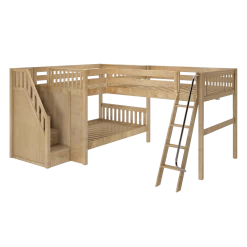 Our corner loft bunk is just that – two full size beds stacked on one side connected to a single twin size raised bed on the other. The result is a super functional “L” shape that fits perfectly in your bedroom corner.