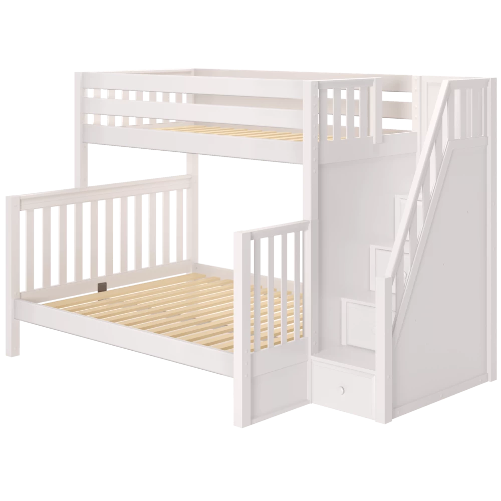 Sleep different sizes and ages comfortably in our high Full XL over Queen bunk bed with stairs! Top bunk raised higher for more space between beds = no more bumped heads on the bottom. Staircase is a super safe way for young children to climb + each step doubles as a storage drawer.