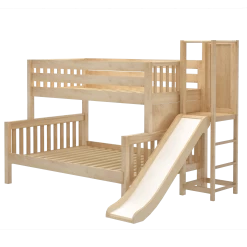 We added a slide to our classic twin over full bunk bed for the ultimate combination of fun and function. Staggered design sleeps different sizes and ages comfortably in one room. Platform at the bed end doubles as entry way to top.