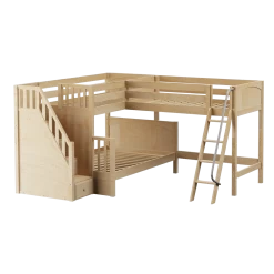Our corner loft bunk is just that – twin bed stacked over full bed on one side, connected to a single raised twin bed on the other. The result is a super functional “L” shape that fits perfectly in your bedroom corner.