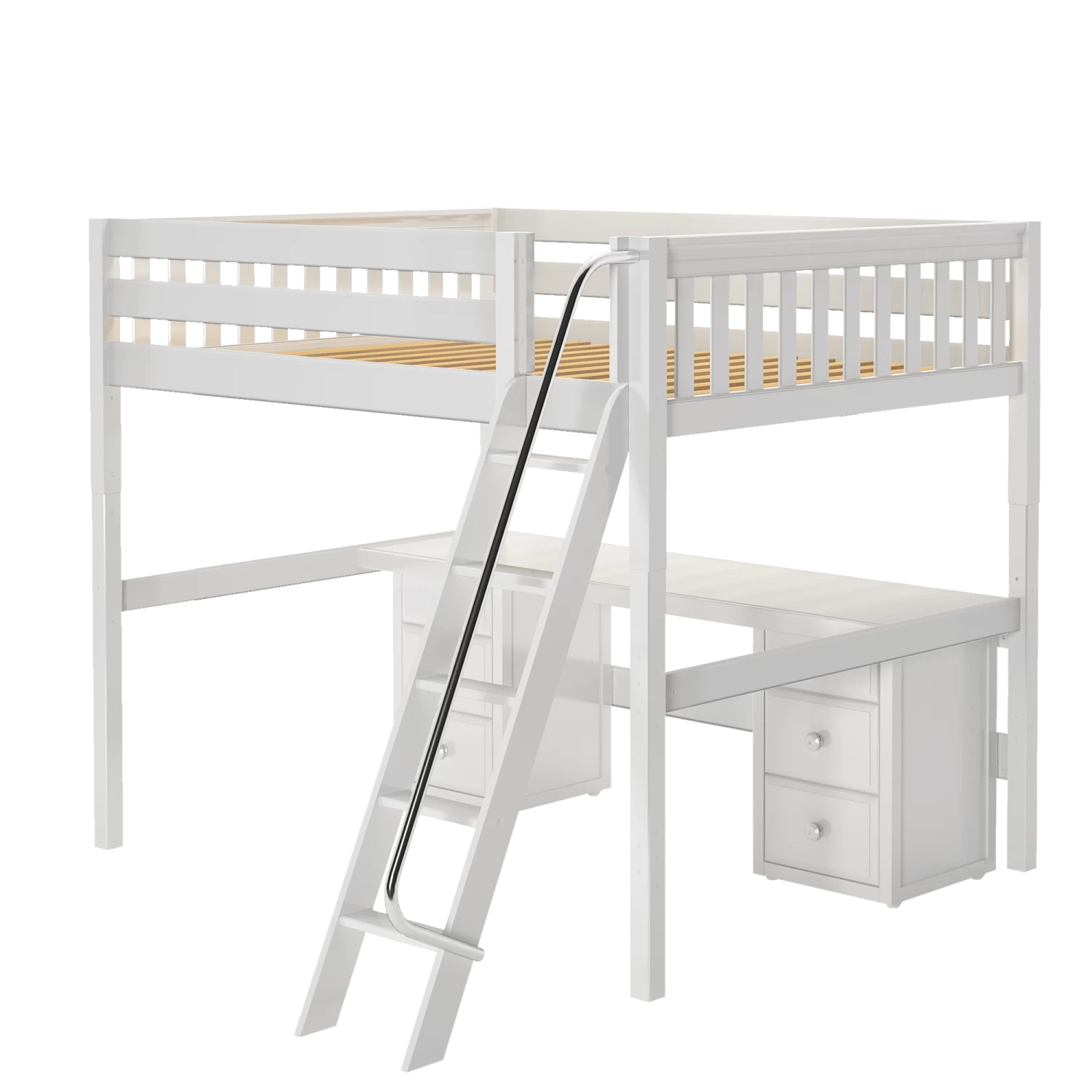 Our high loft with angled ladder becomes the ultimate sleep + study combo! Matching desk attaches directly underneath, freeing up valuable floorspace. Over 4 ft of underbed clearance means even taller teenagers can sit up comfortably. Queen size = extra room for long limbs to stretch out.