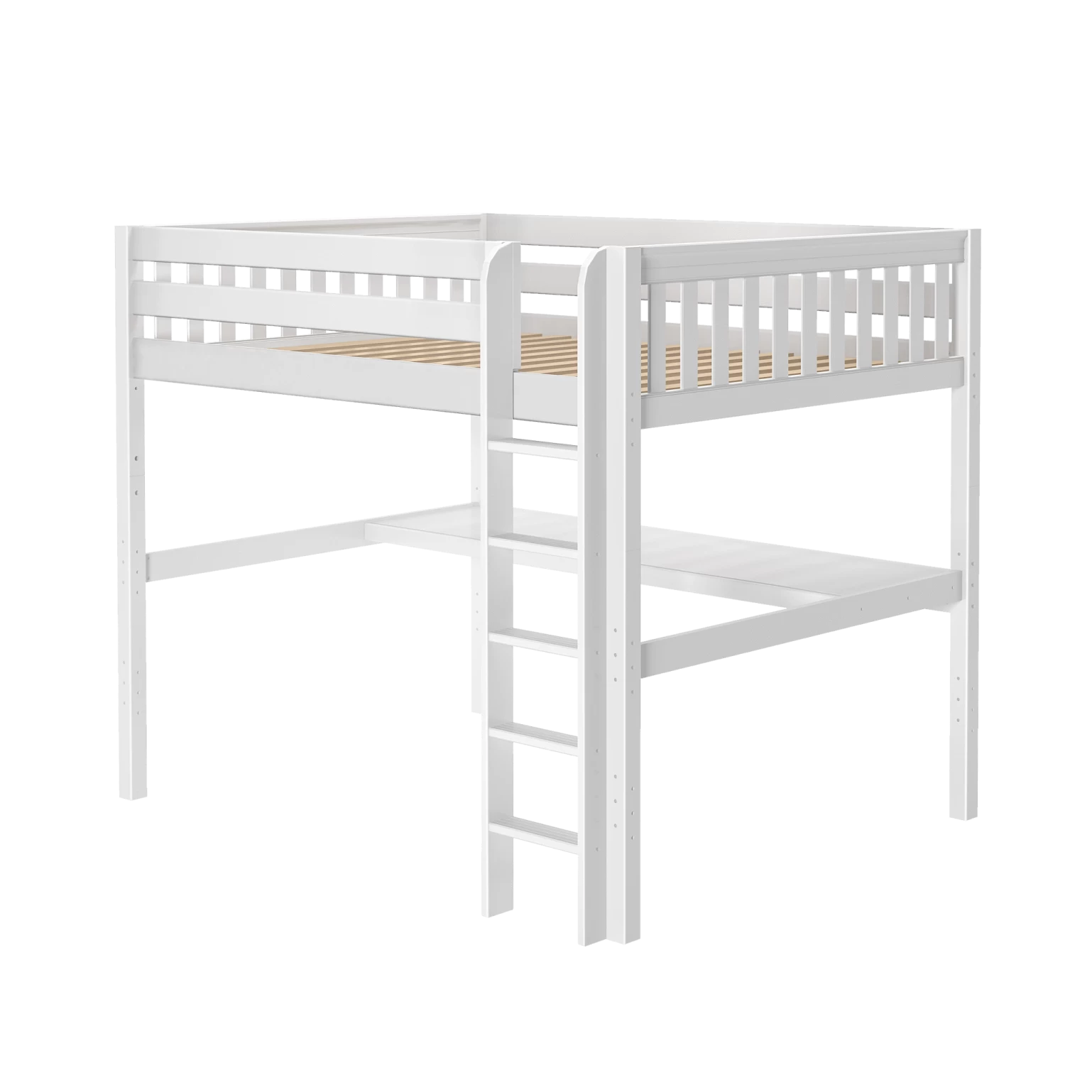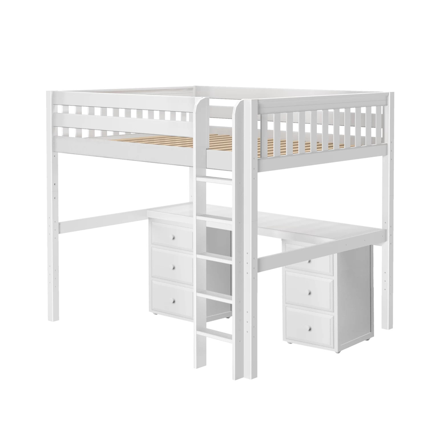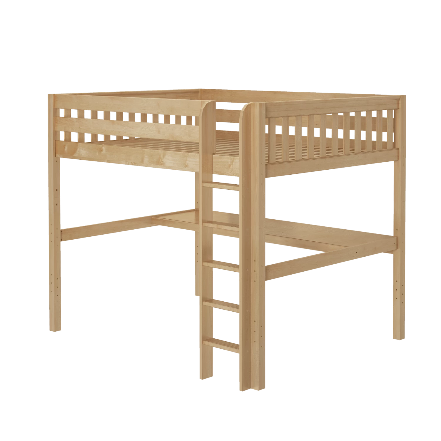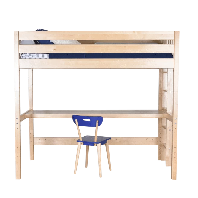 Our high loft with straight ladder becomes the ultimate sleep + study combo! Matching desk attaches directly underneath, freeing up valuable floorspace. Over 4 ft of underbed clearance means even taller teenagers can sit up comfortably. Queen size = extra room for long limbs to stretch out.