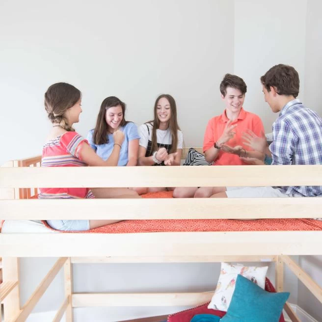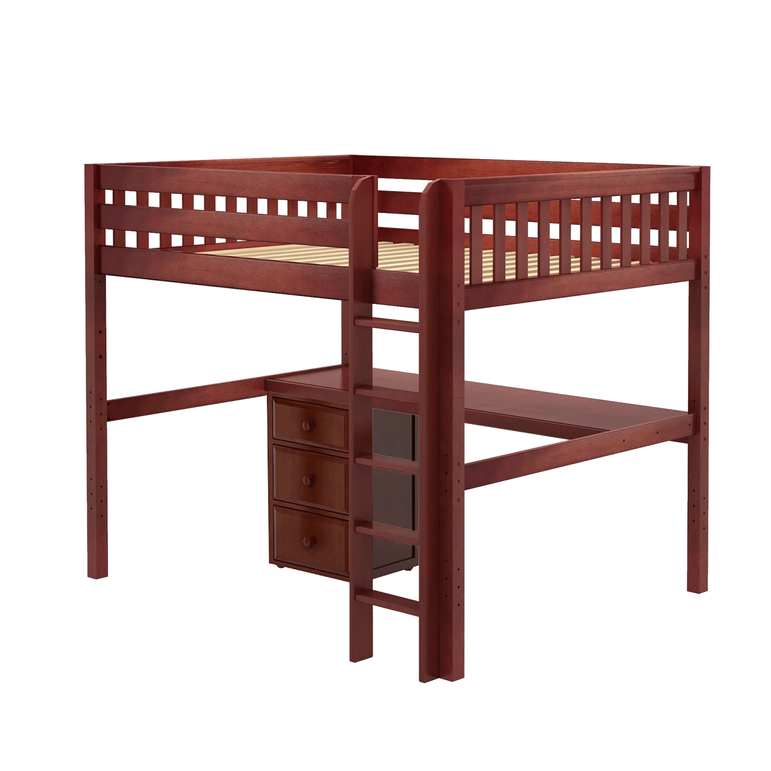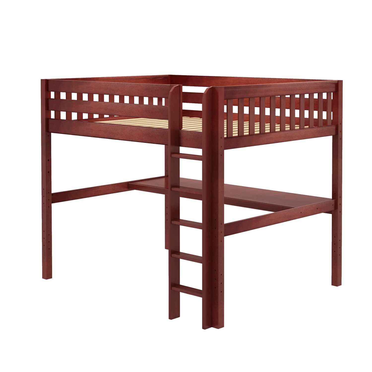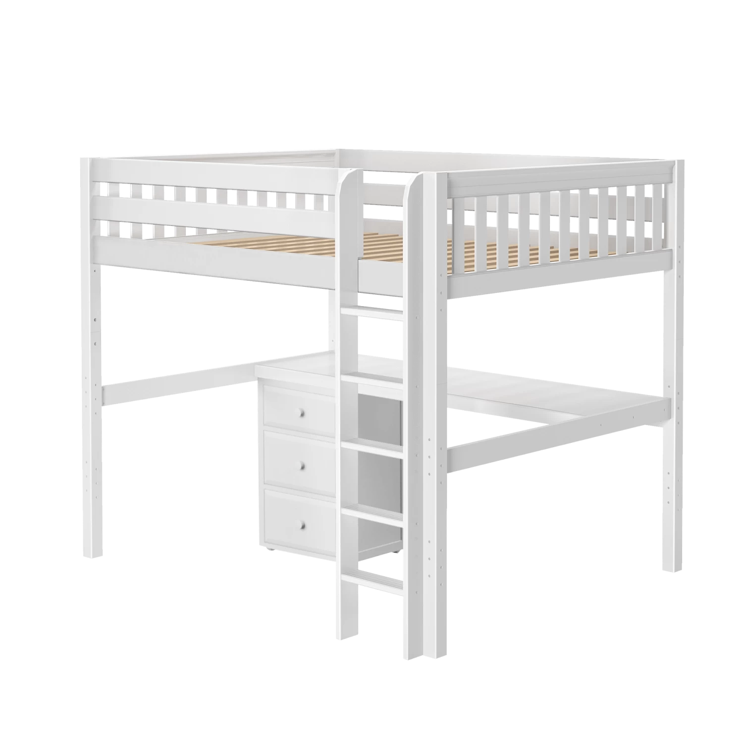 Our high loft with straight ladder becomes the ultimate sleep + study combo! Matching desk attaches directly underneath, freeing up valuable floorspace. Over 4 ft of underbed clearance means even taller teenagers can sit up comfortably. Queen size = extra room for long limbs to stretch out.
