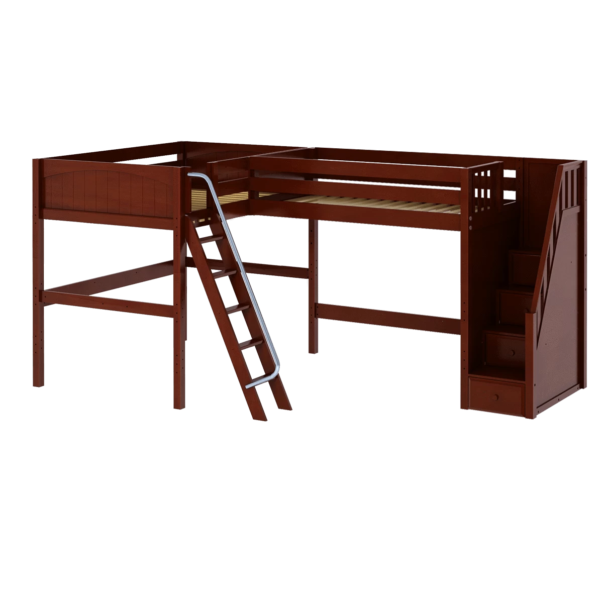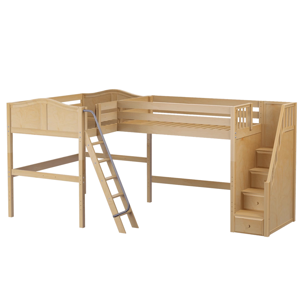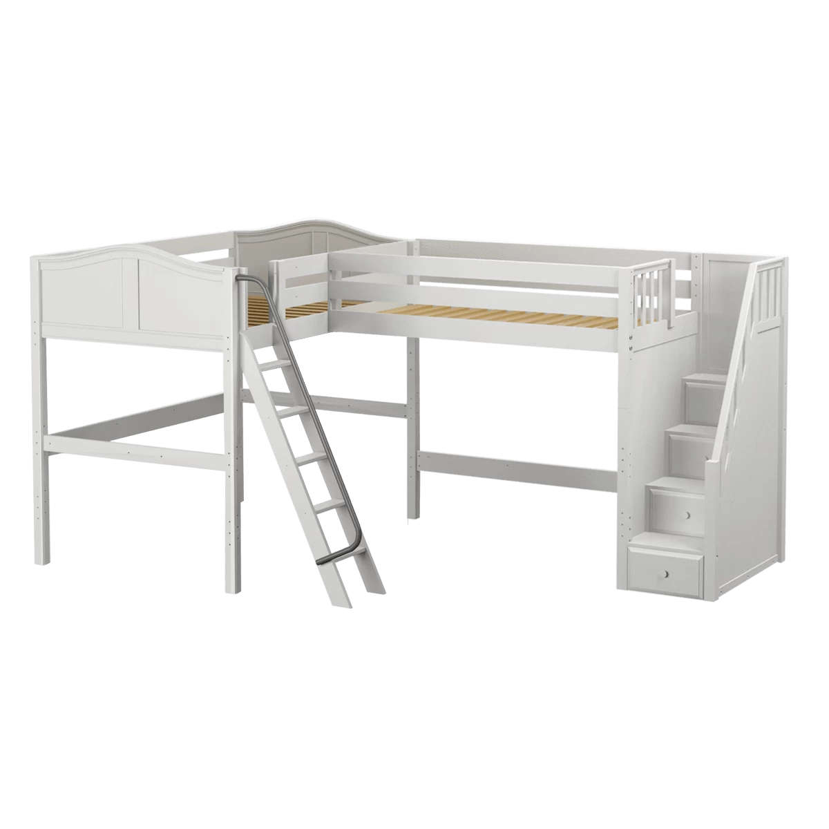 Raised “L” shape fits perfectly in a bedroom corner for a unique way to sleep two. Over 4 ft of underbed clearance – use open floorspace for a desk, storage or leave free for play. Full bed + angled ladder on one side is connected to a twin size bed with stairs on the other. Added bonus, staircase steps double as drawers for built in storage!