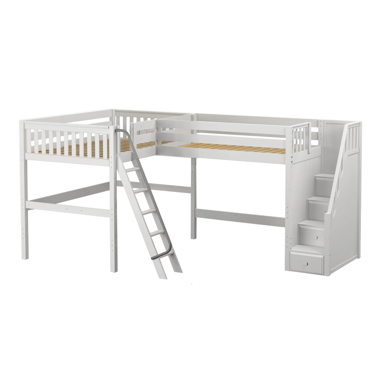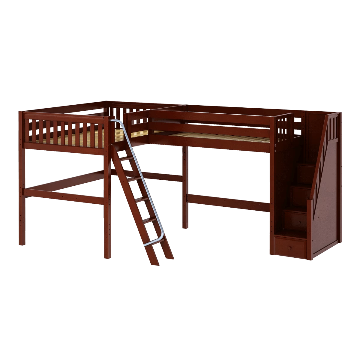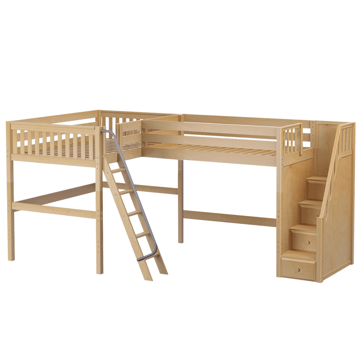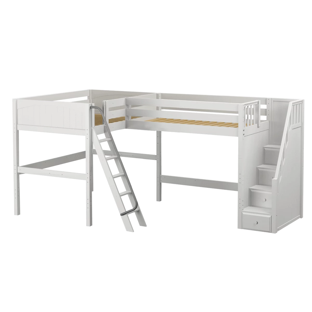 Raised “L” shape fits perfectly in a bedroom corner for a unique way to sleep two. Over 4 ft of underbed clearance – use open floorspace for a desk, storage or leave free for play. Full bed + angled ladder on one side is connected to a twin size bed with stairs on the other. Added bonus, staircase steps double as drawers for built in storage!