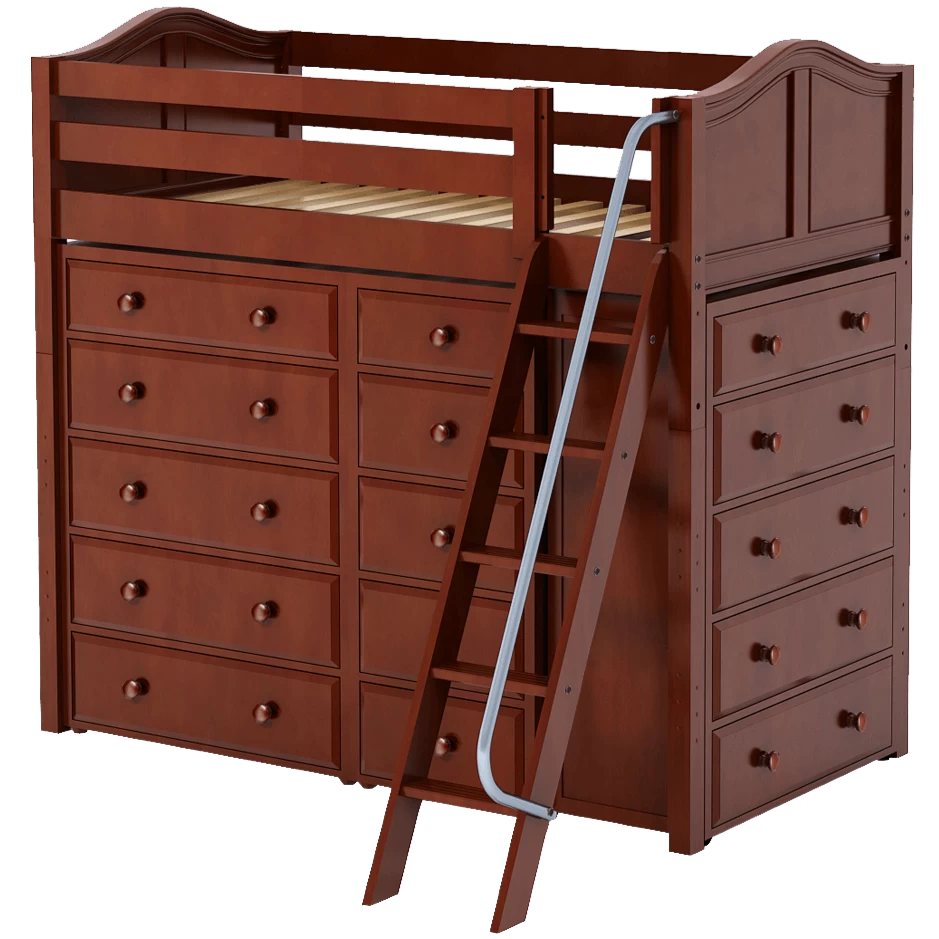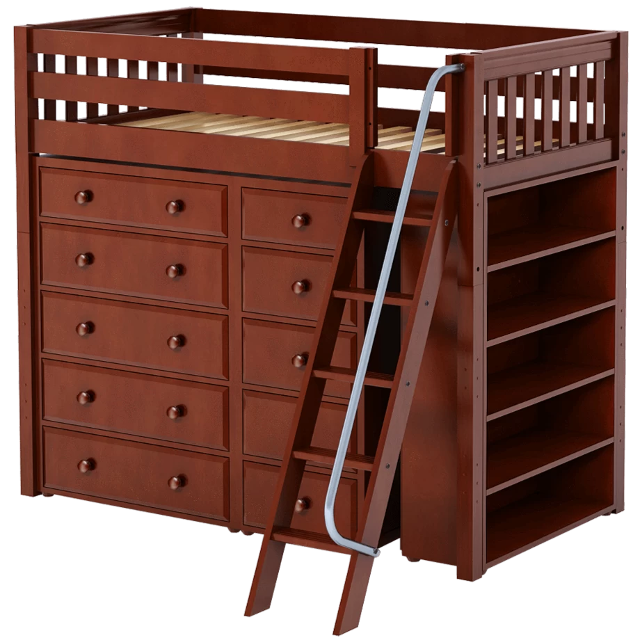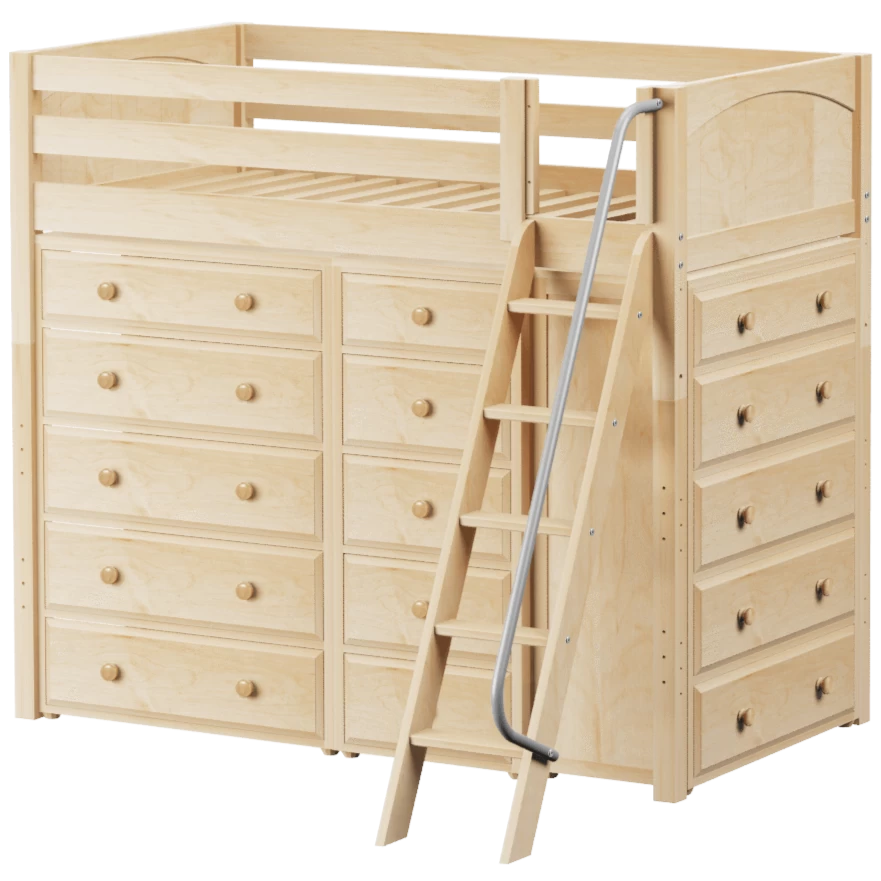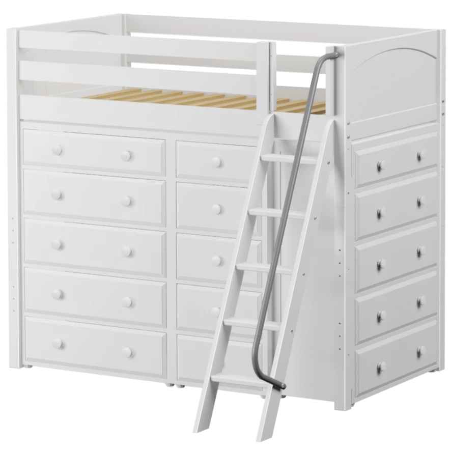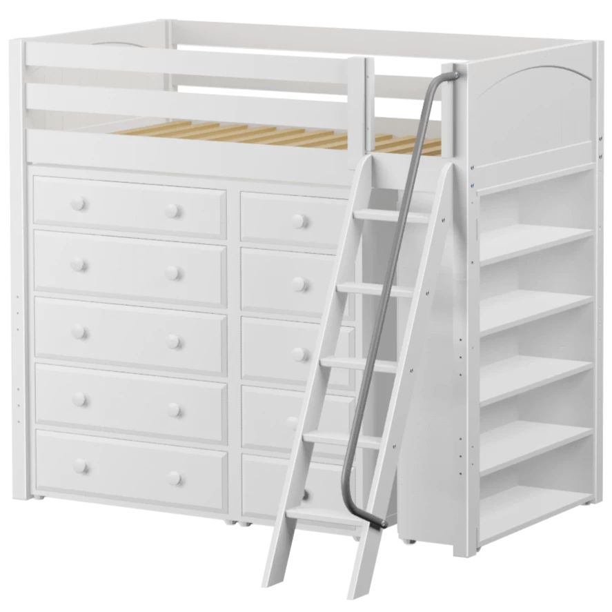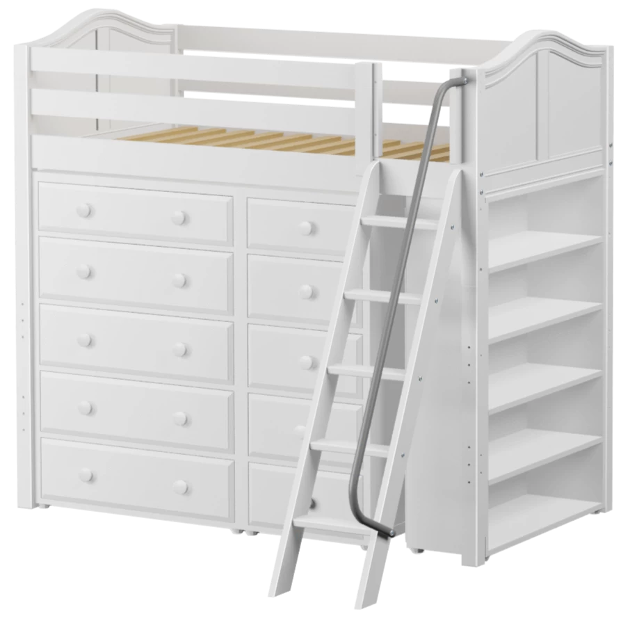 Our classic high loft bed with angled ladder becomes the ultimate storage cube! Raised bed = space underneath. Fill with matching case goods based on your needs. Dressers + bookcases are designed to fit perfectly. Each piece is freestanding so you can use separately for years to come.