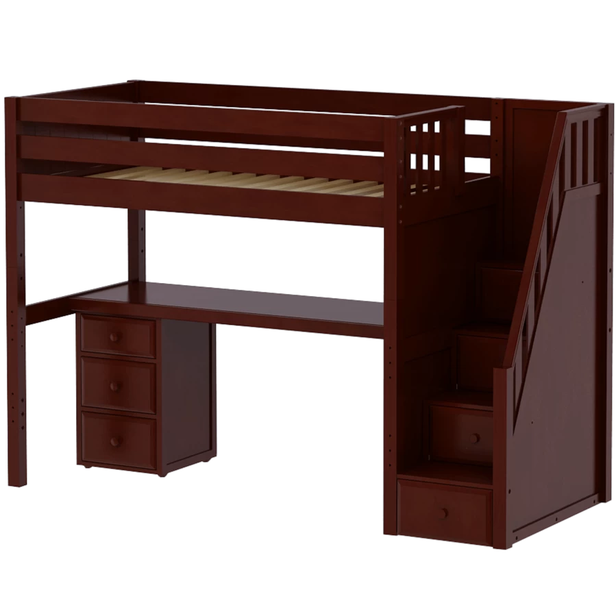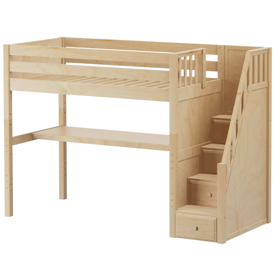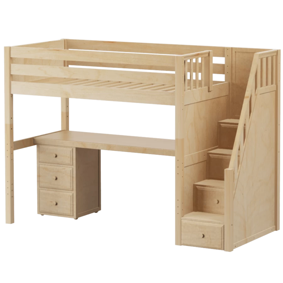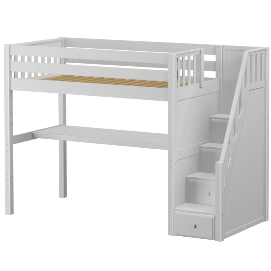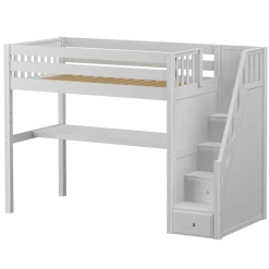 Our high loft with stairs becomes the ultimate sleep + study combo! Attached matching desk creates a functional spot for schoolwork and frees up valuable floorspace in your child’s bedroom. Easy to climb staircase steps double as storage drawers.