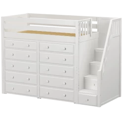 Our best-selling high loft bed becomes the ultimate storage cube. Matching dressers slide in perfectly beneath the bed, saving valuable floorspace. Added bonus, super safe staircase steps double as storage drawers.