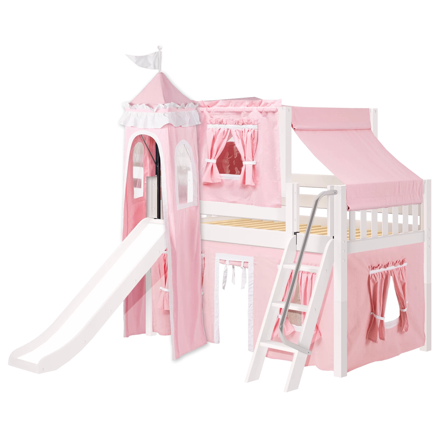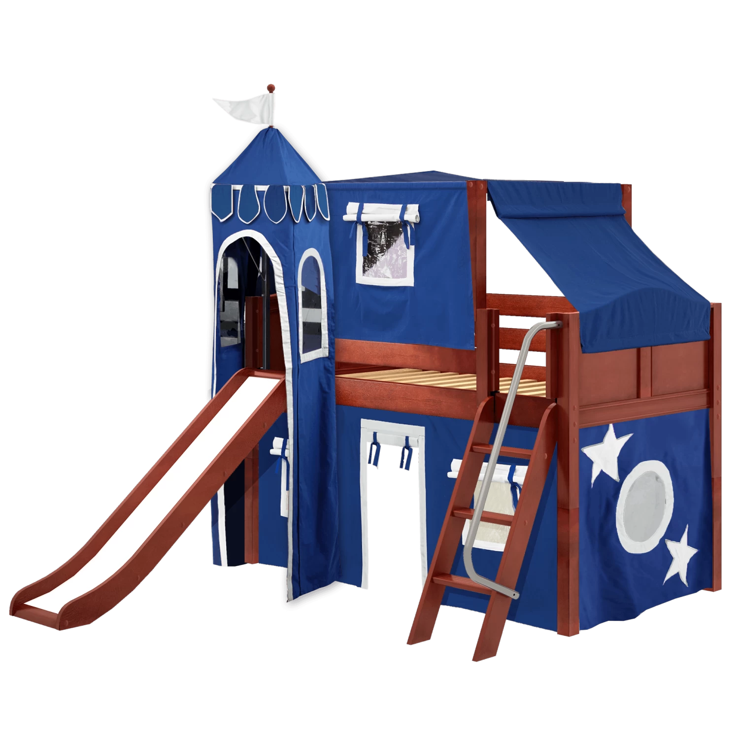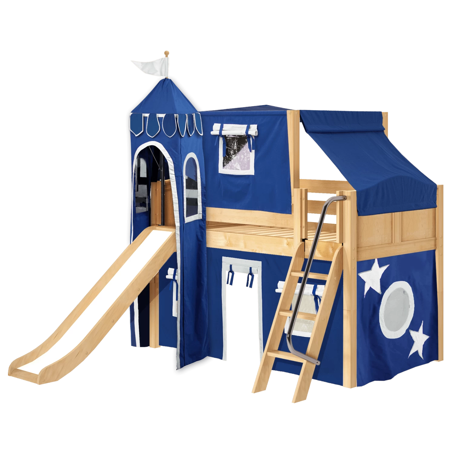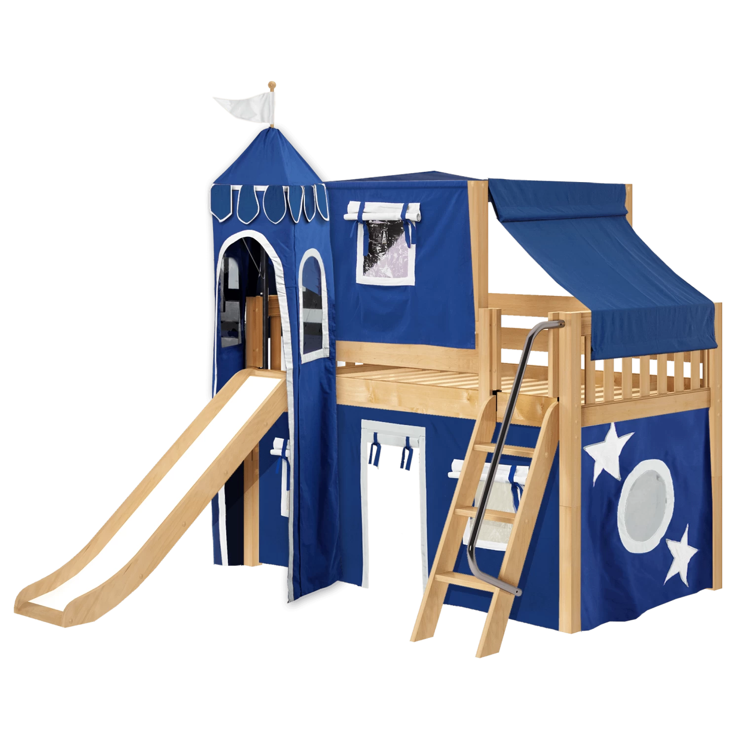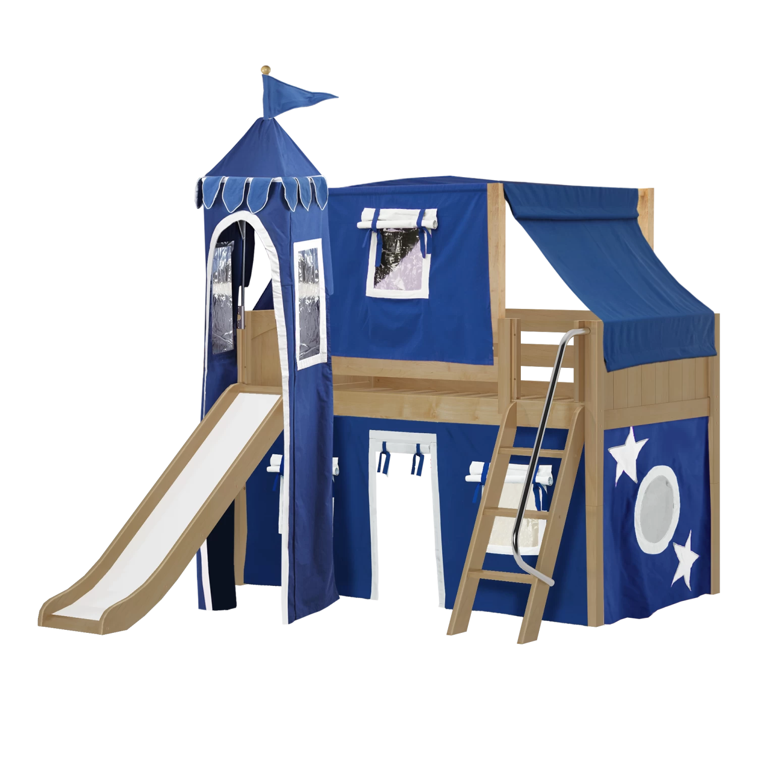 Maxtrix Twin Low Loft Bed With Angled Ladder, Curtain, Top Tent, Tower + Slide