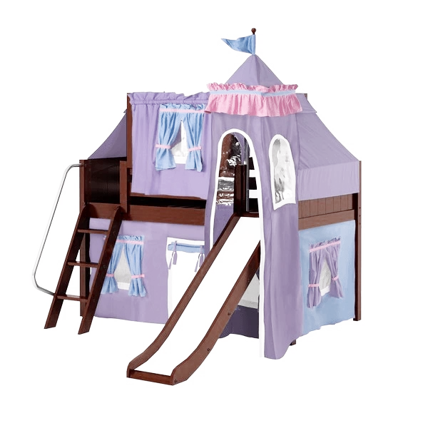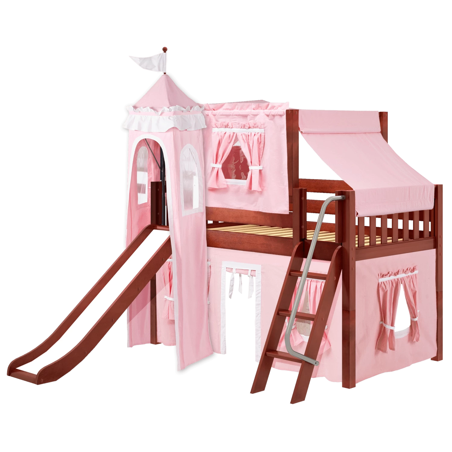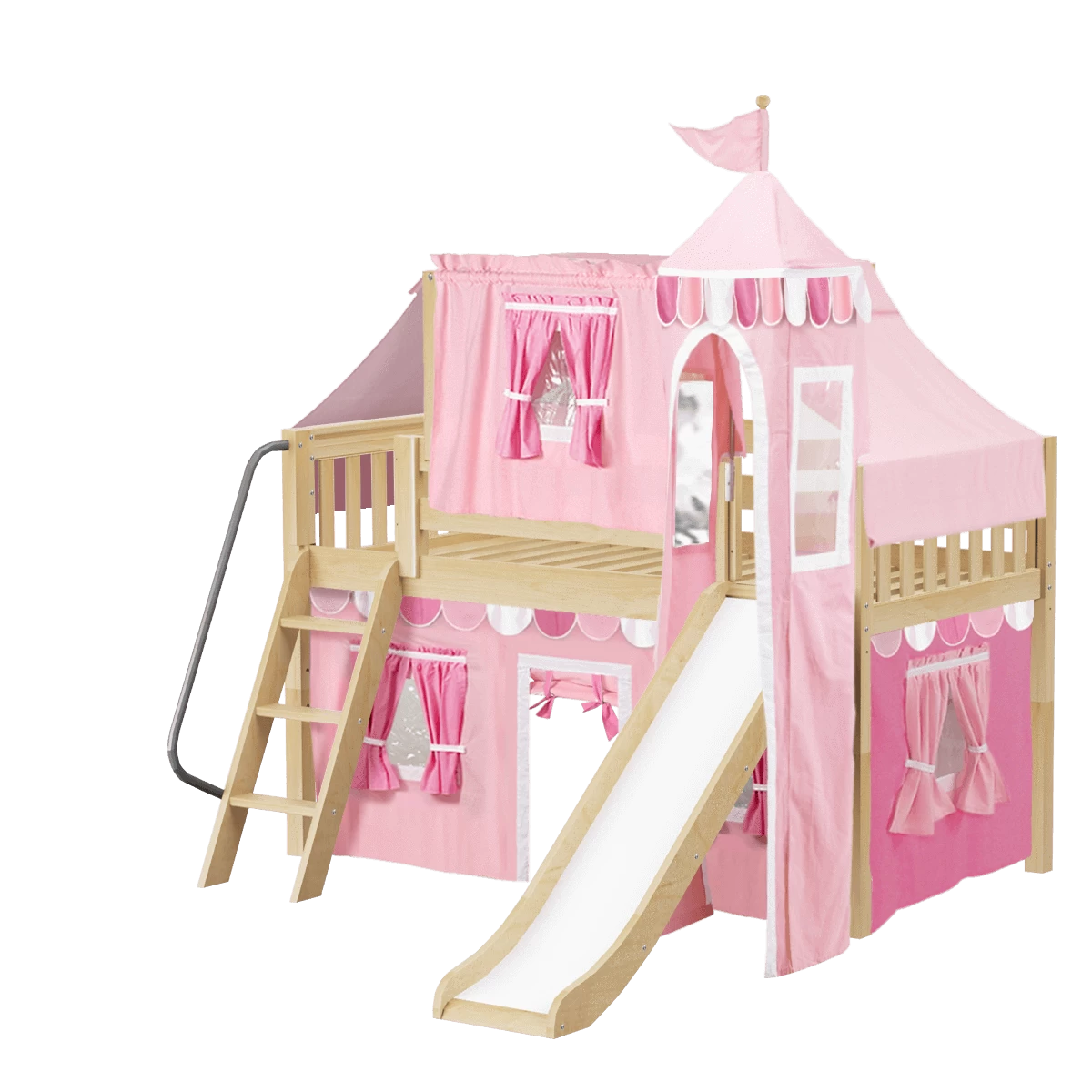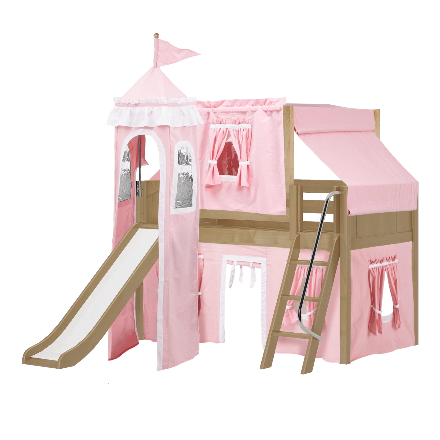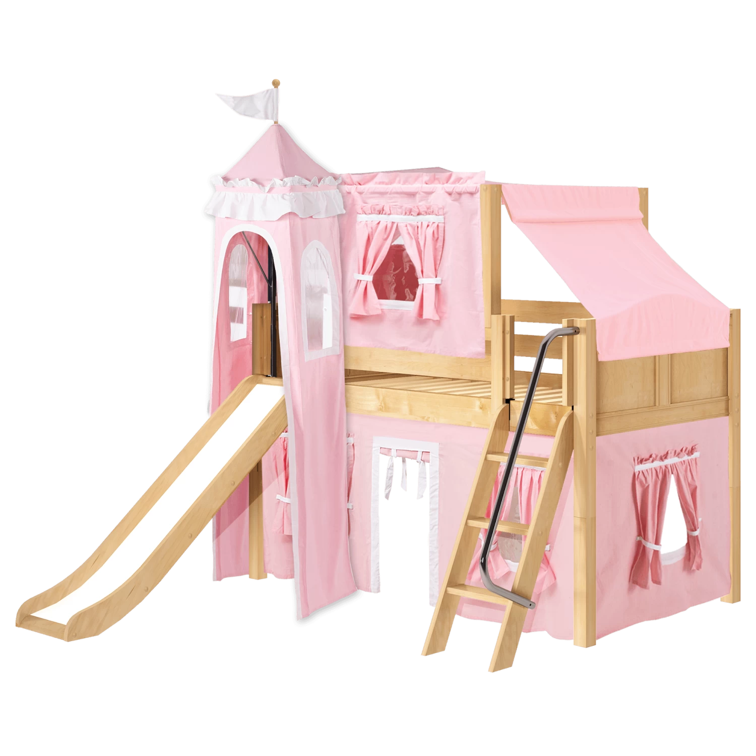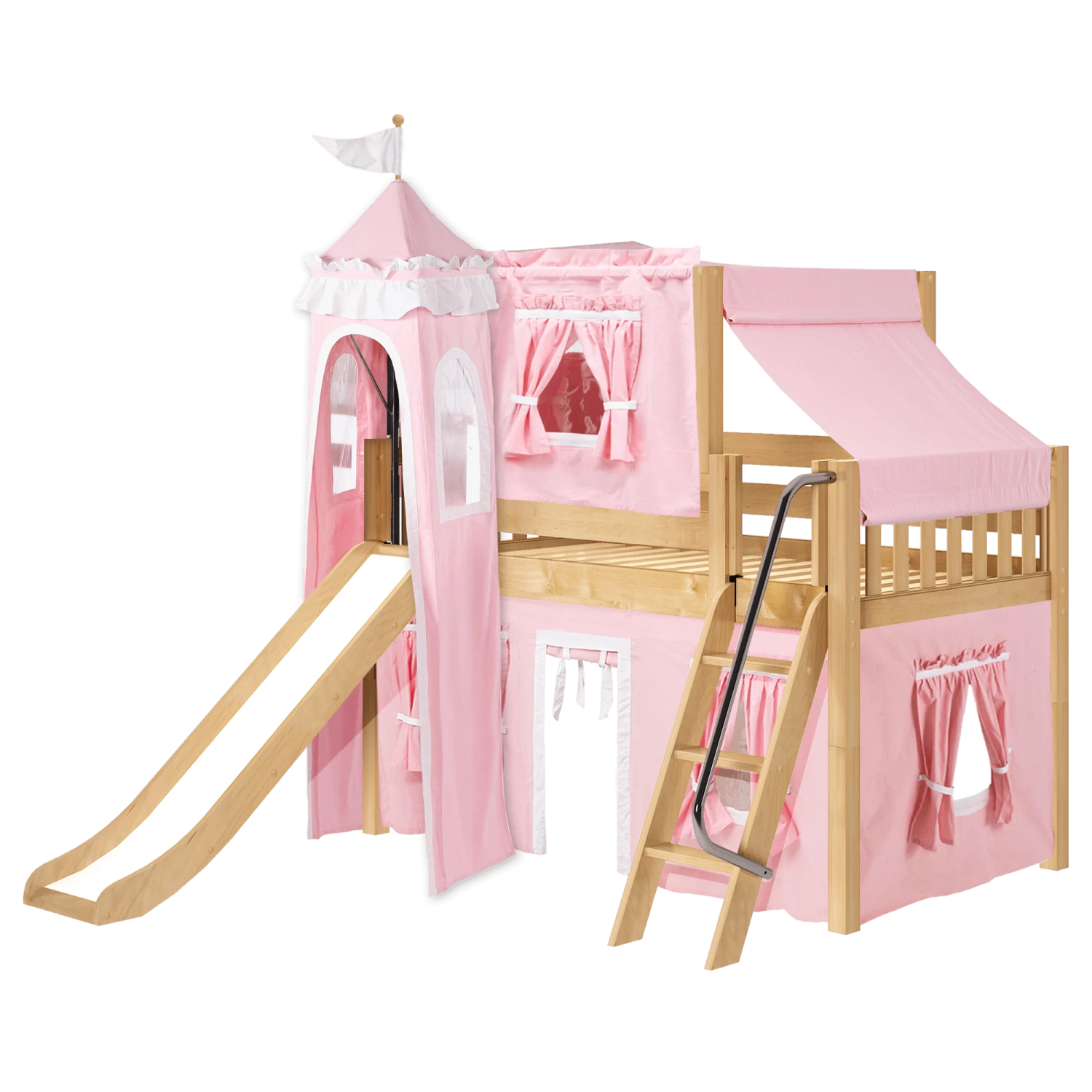 Maxtrix Twin Low Loft Bed With Angled Ladder, Curtain, Top Tent, Tower + Slide
