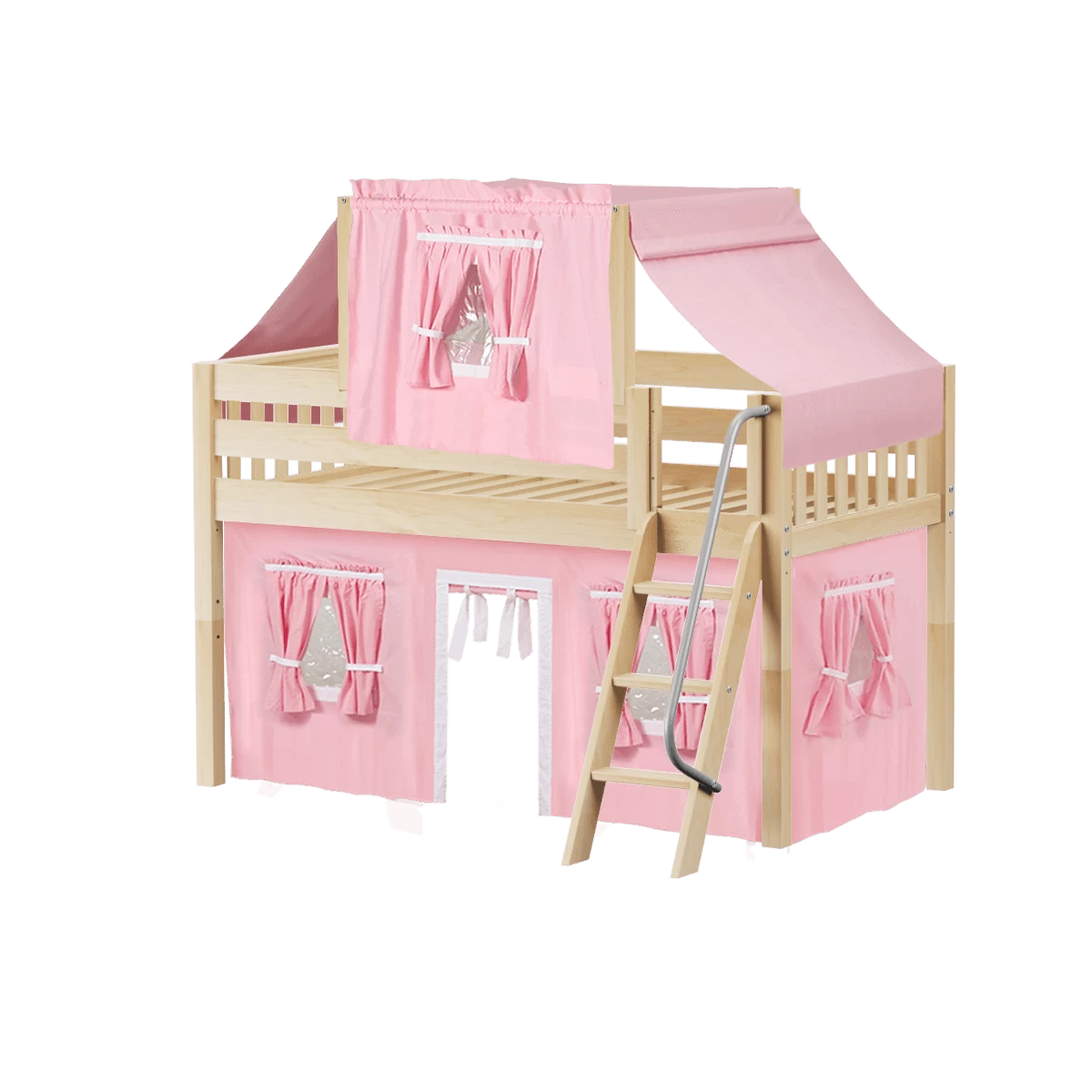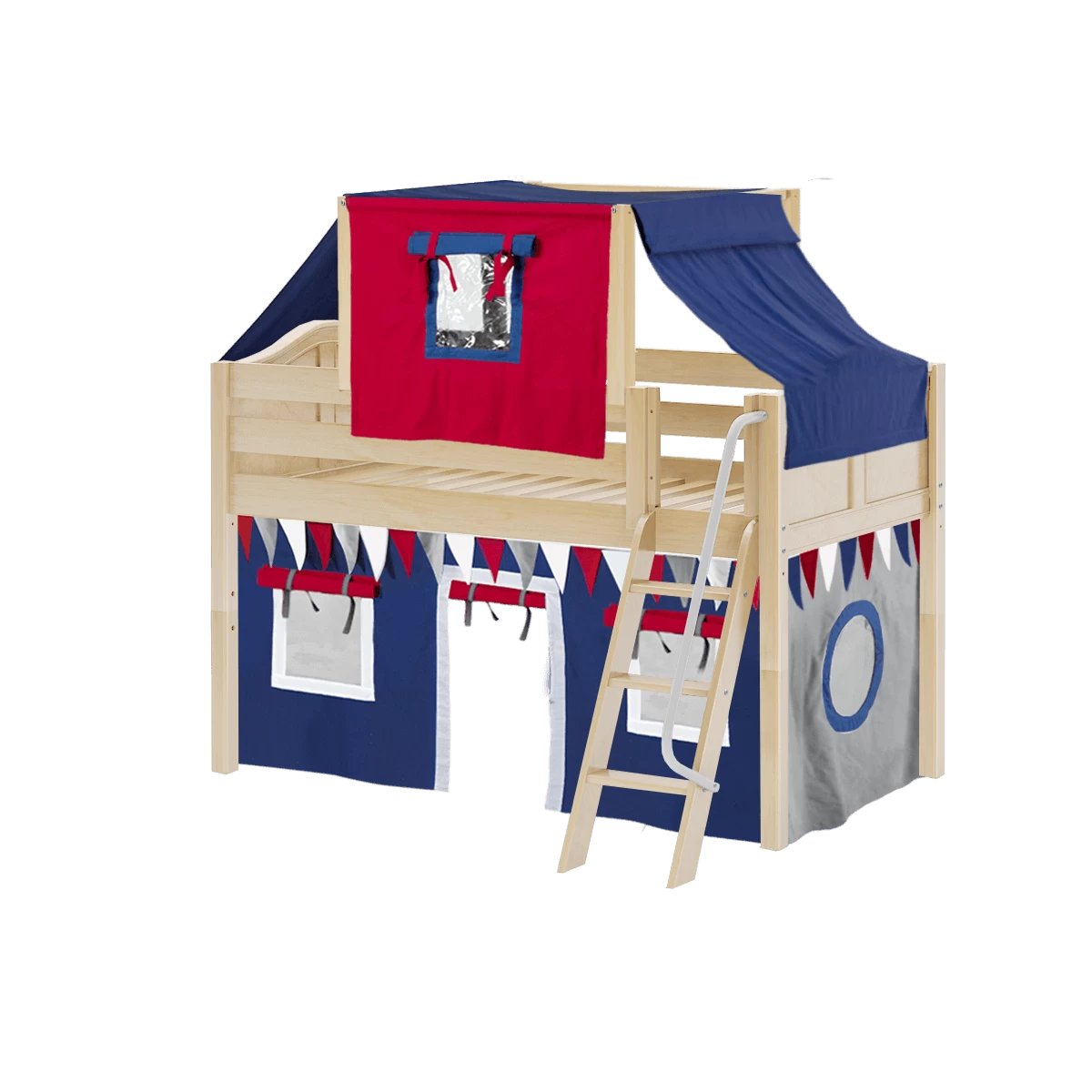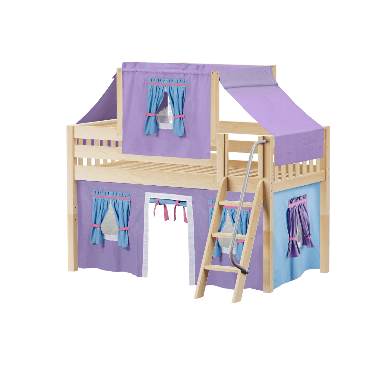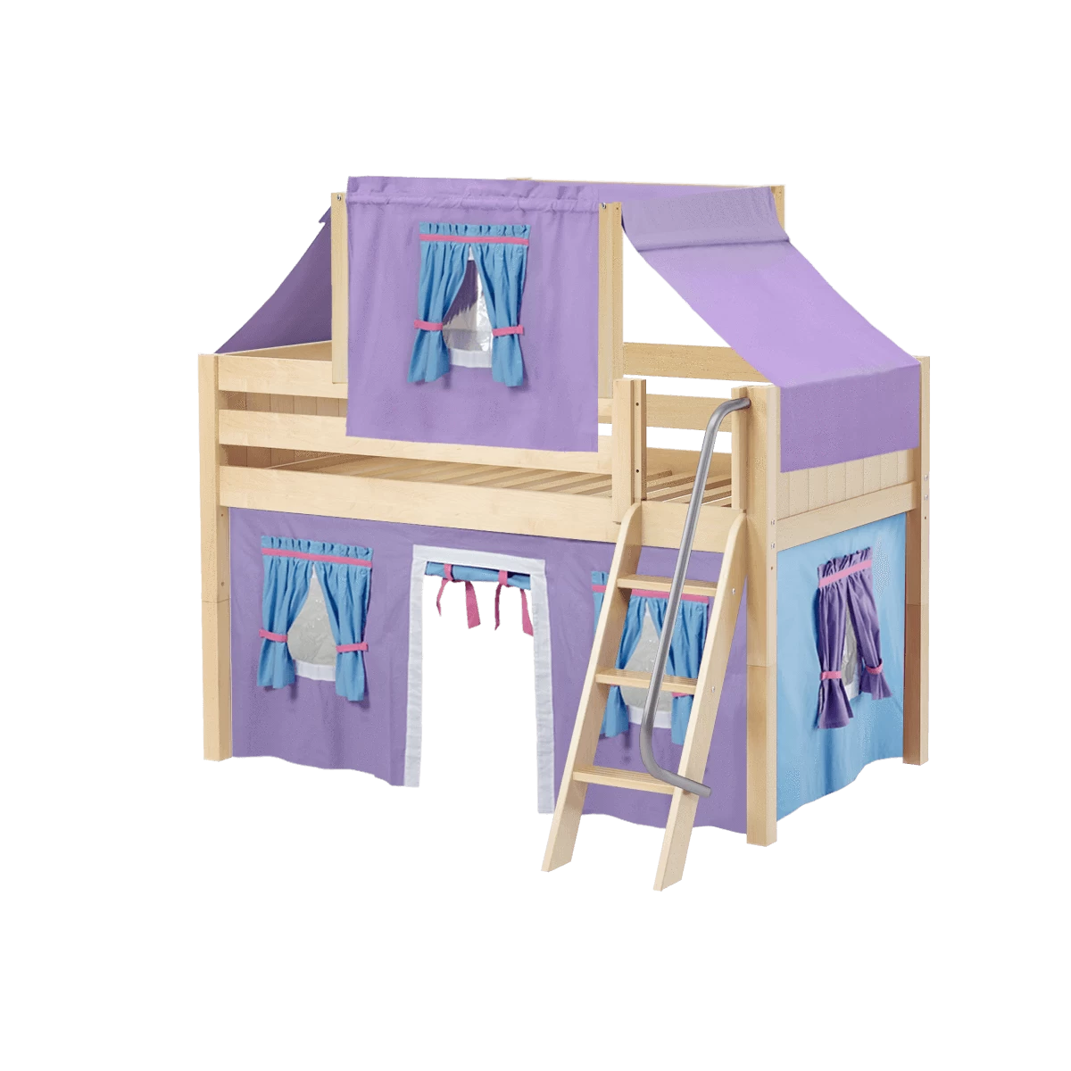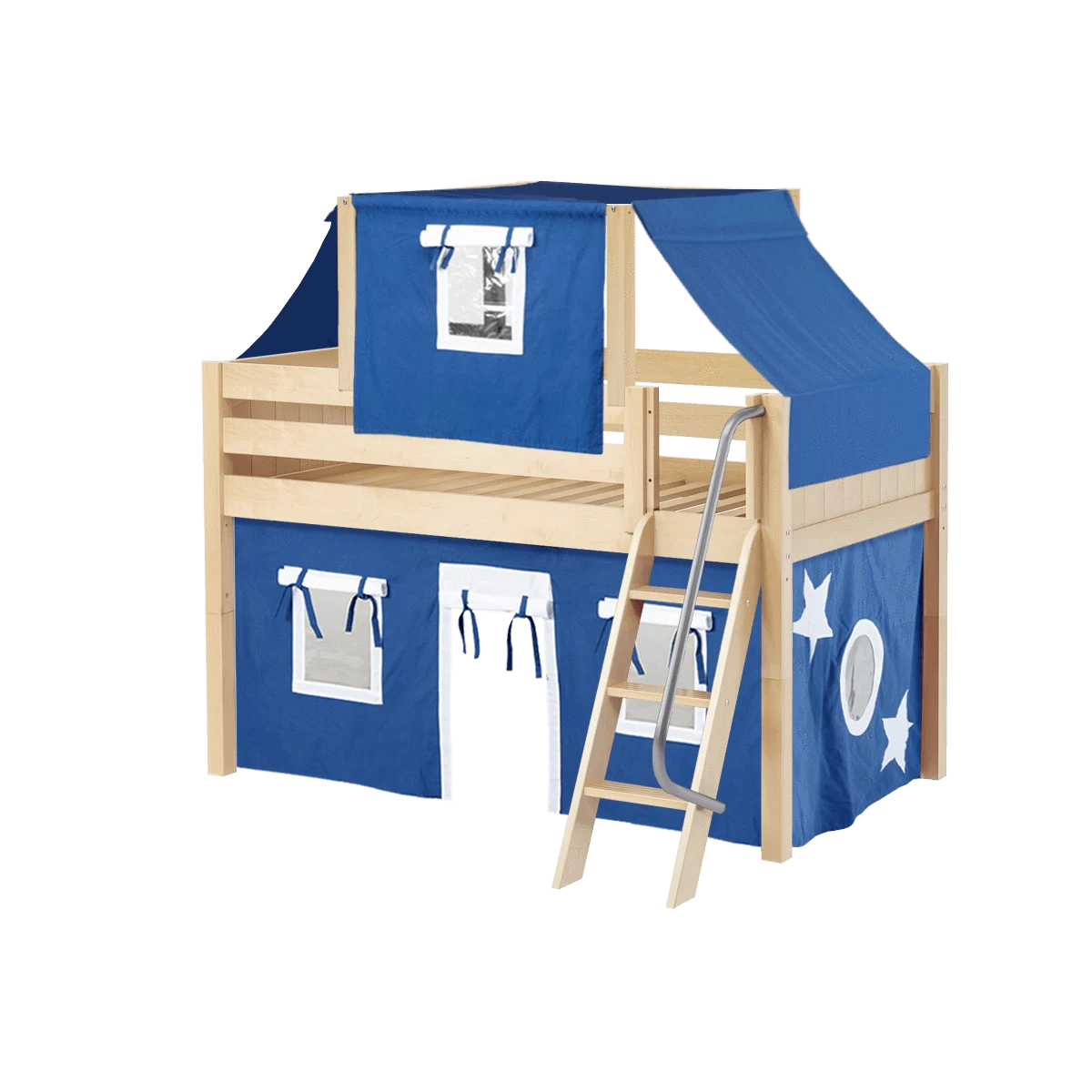 Maxtrix Twin Low Loft Bed With Angled Ladder, Curtain + Top Tent