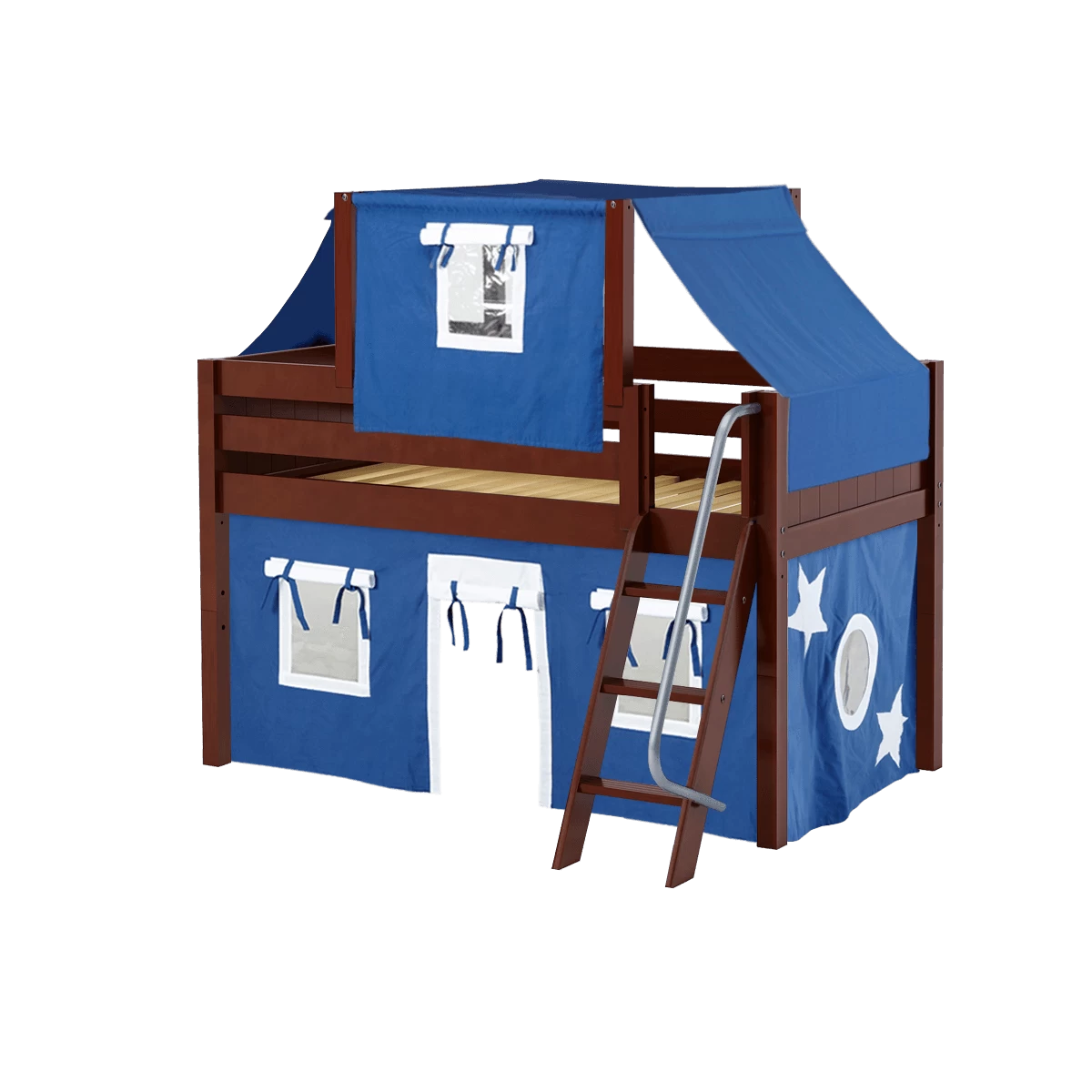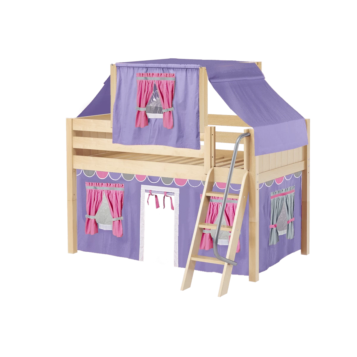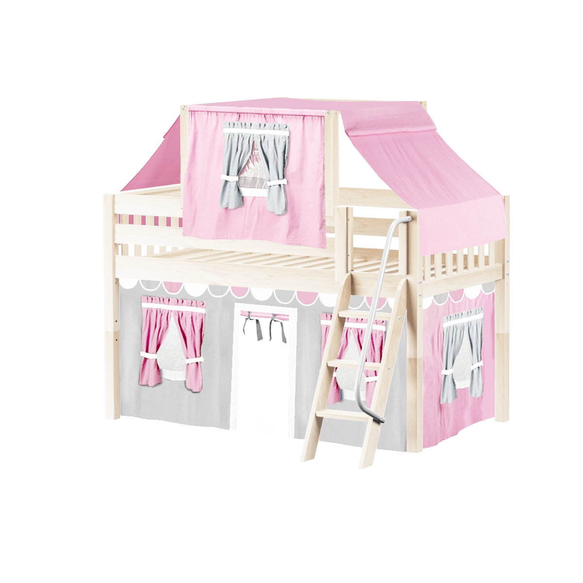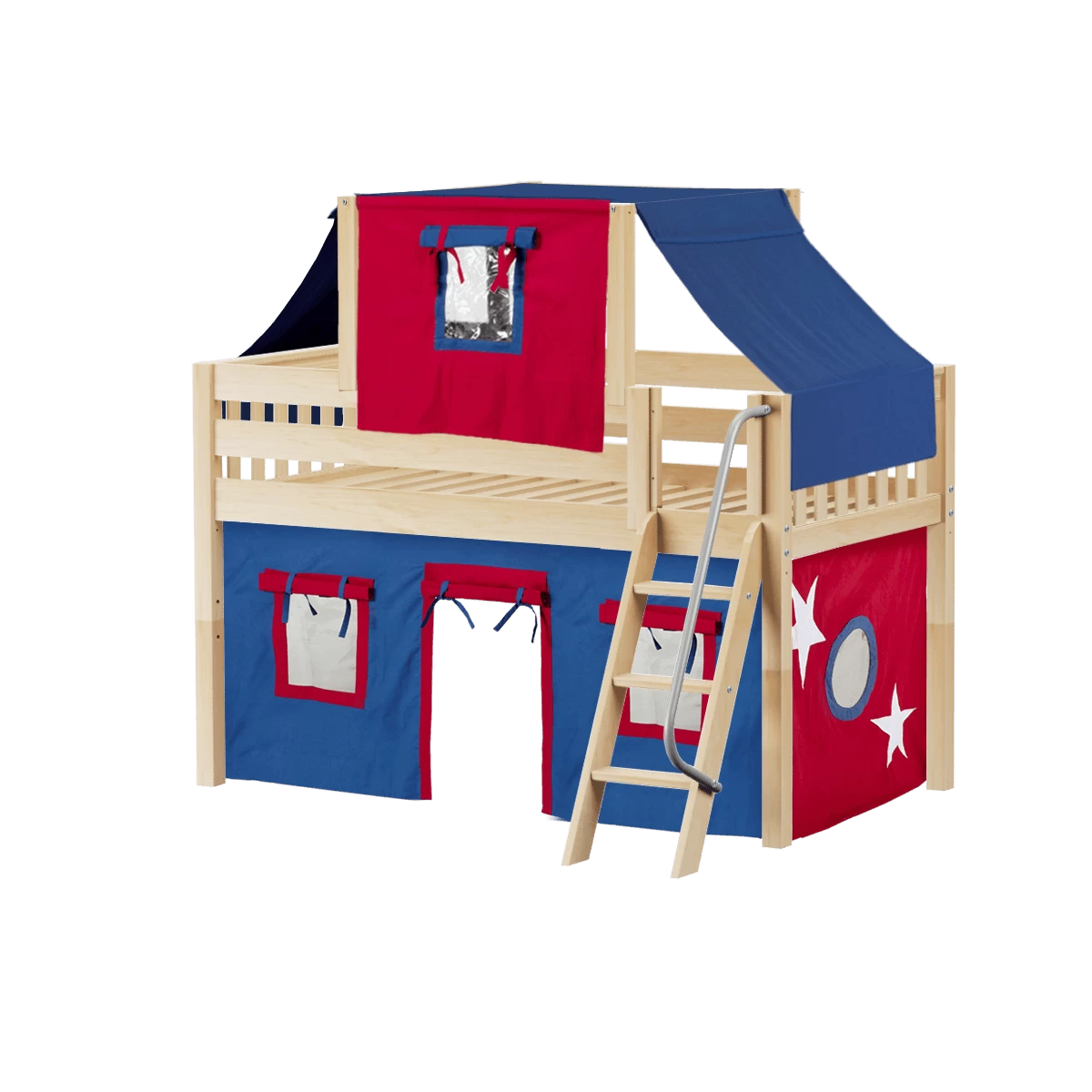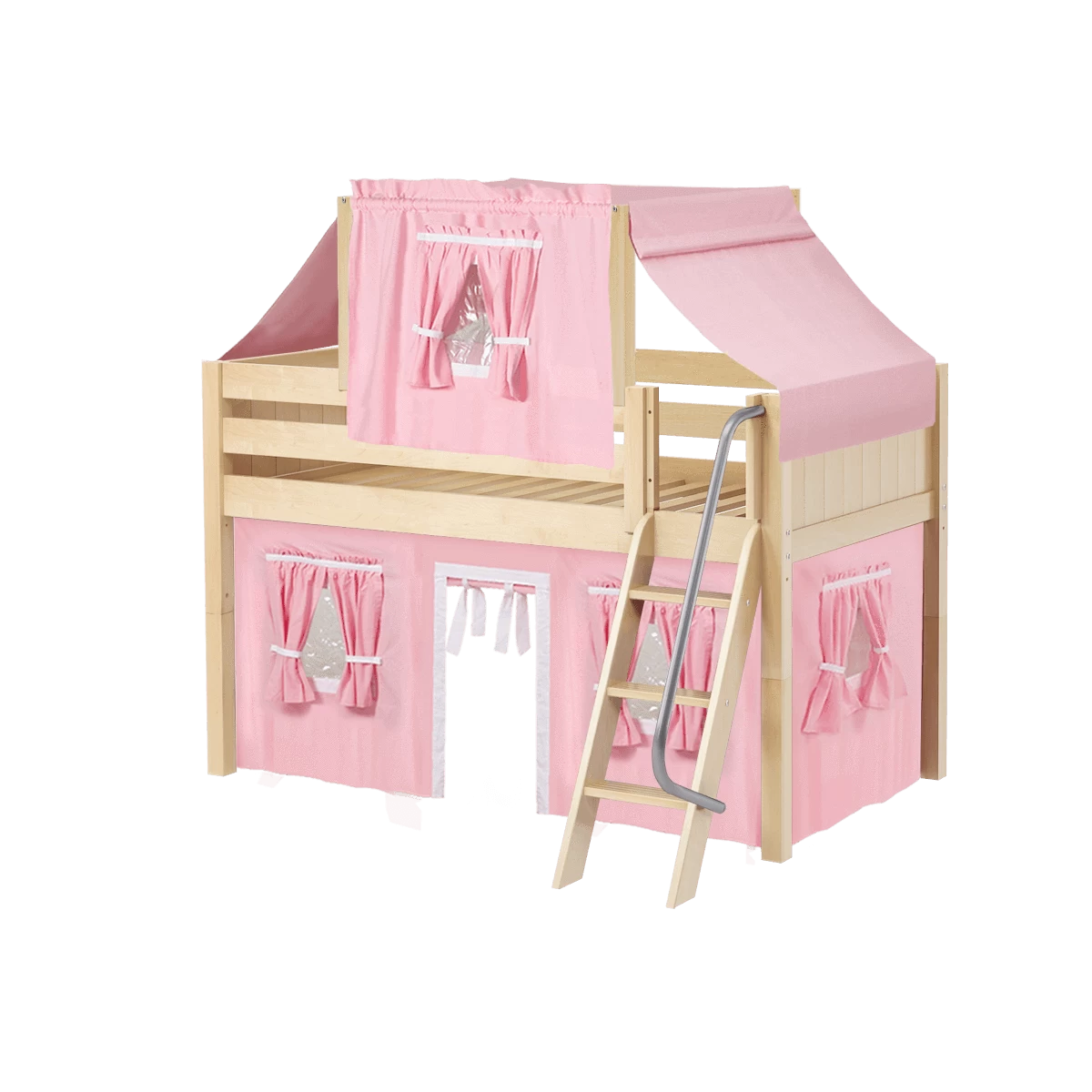 Maxtrix Twin Low Loft Bed With Angled Ladder, Curtain + Top Tent