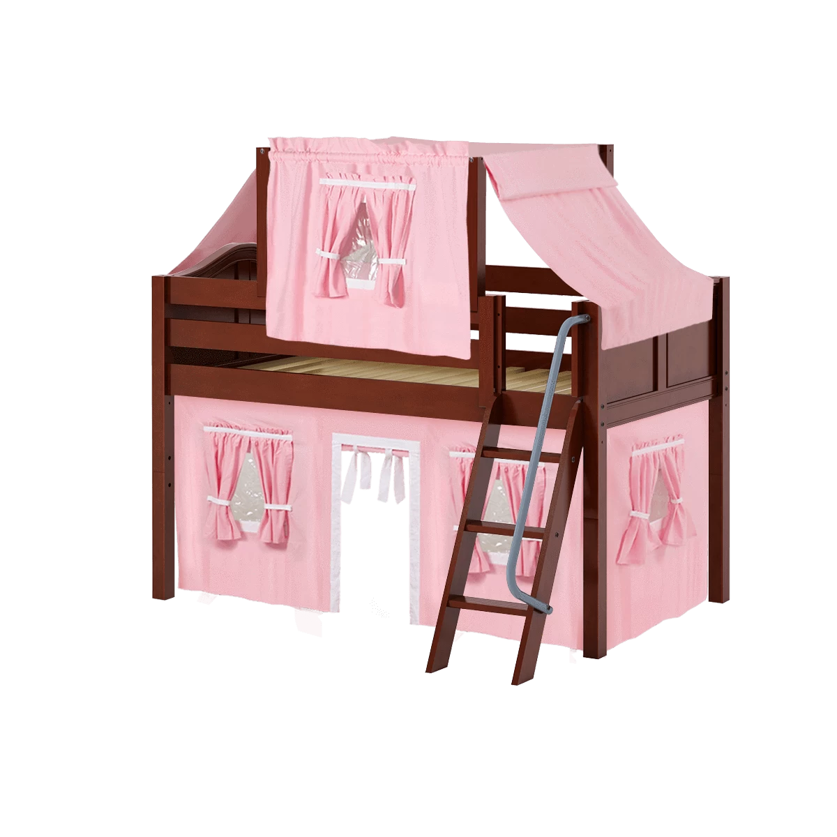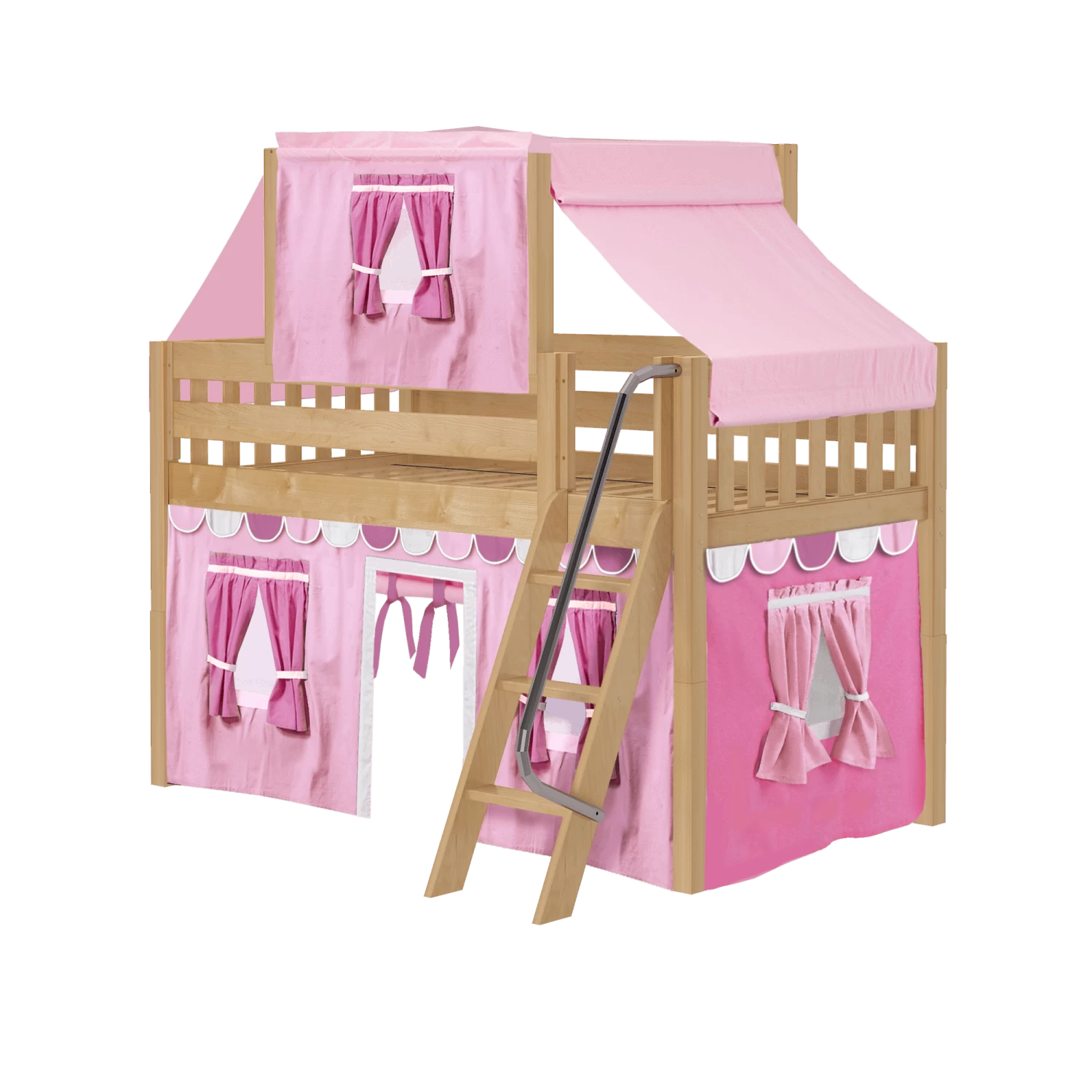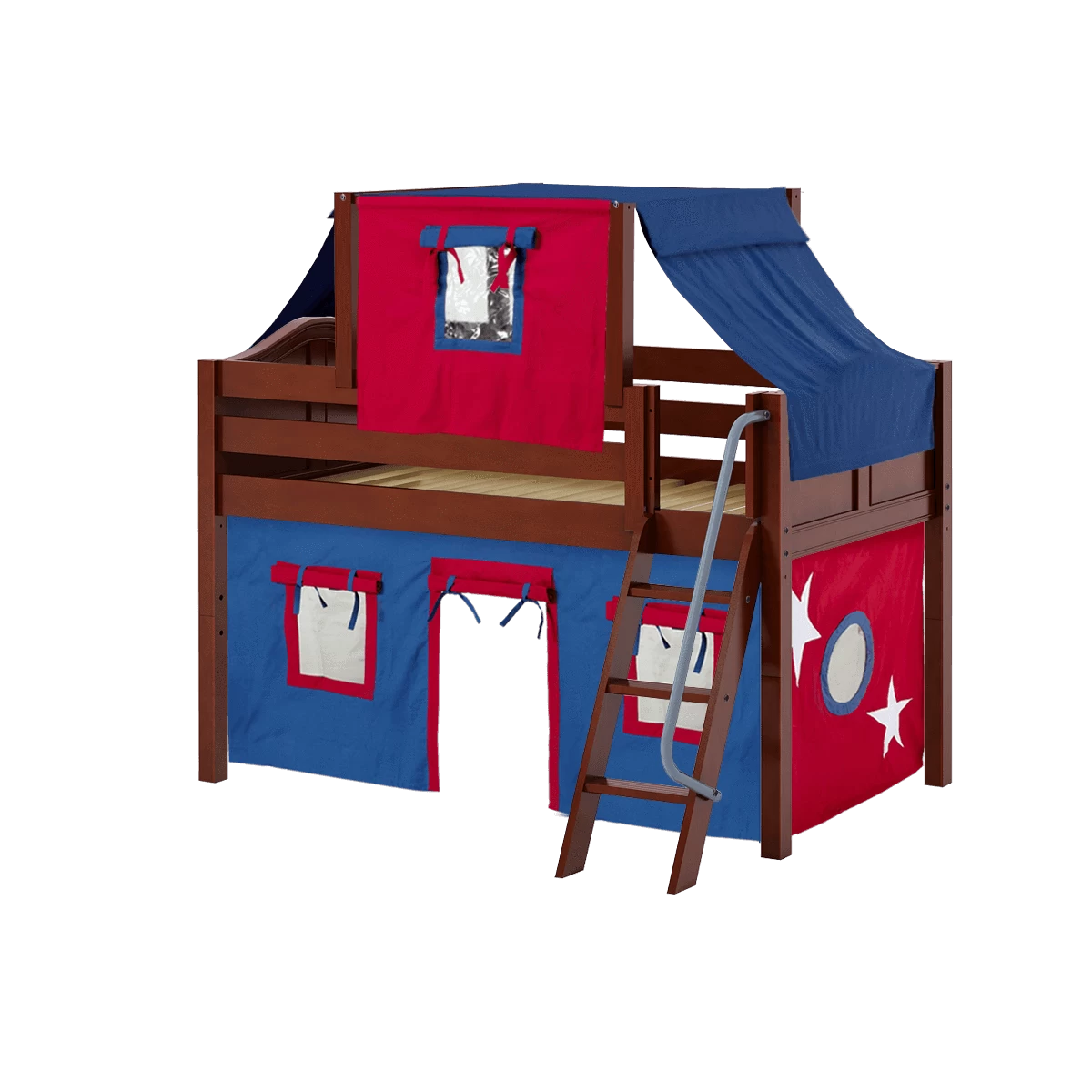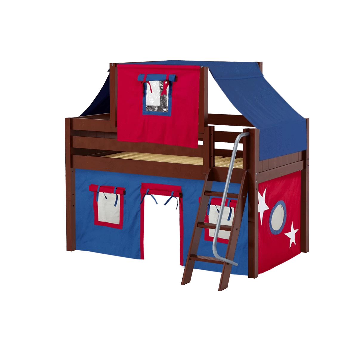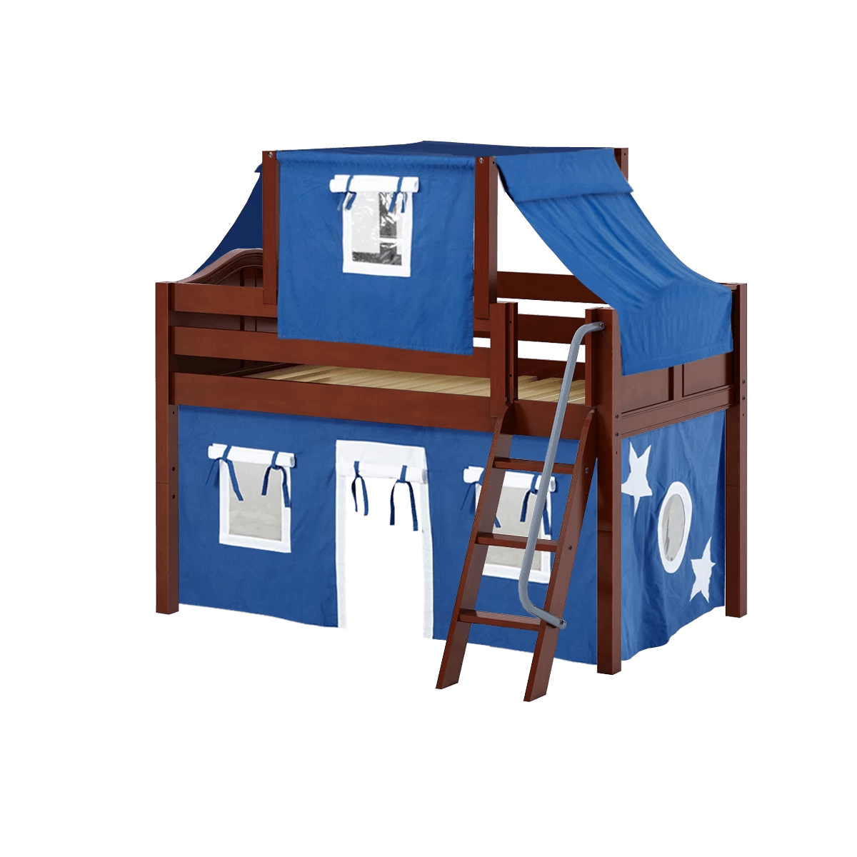Maxtrix Twin Low Loft Bed With Angled Ladder, Curtain + Top Tent