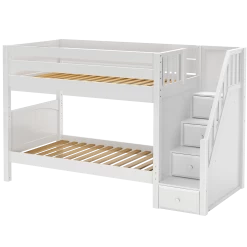 We added 5 inches to our classic bunk for more underbed space, but made sure it still fits average height ceilings and is safe enough for young children. The result = Maxtrix’s super functional twin Medium bunk bed with stairs!