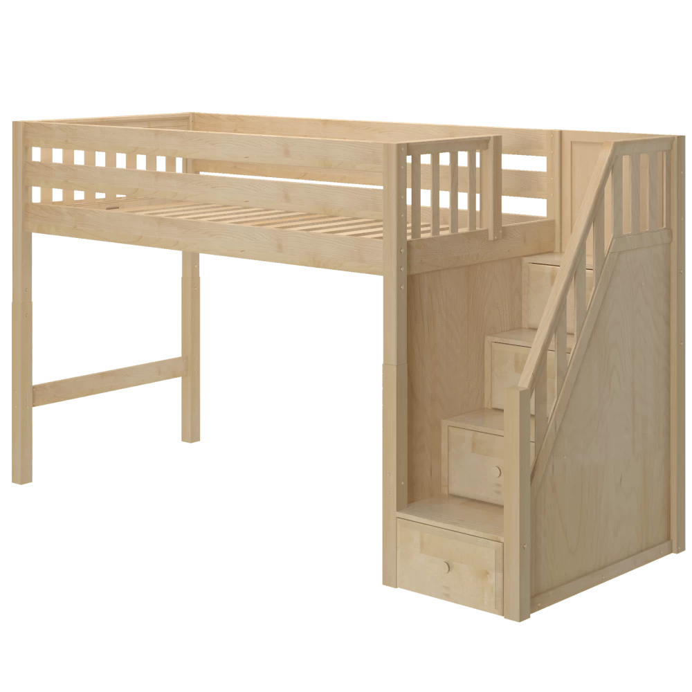 Raised high enough for ample underbed space (10+ inches than the low loft!), but still suitable for younger children and low ceilings, our popular mid loft bed with stairs works for all.