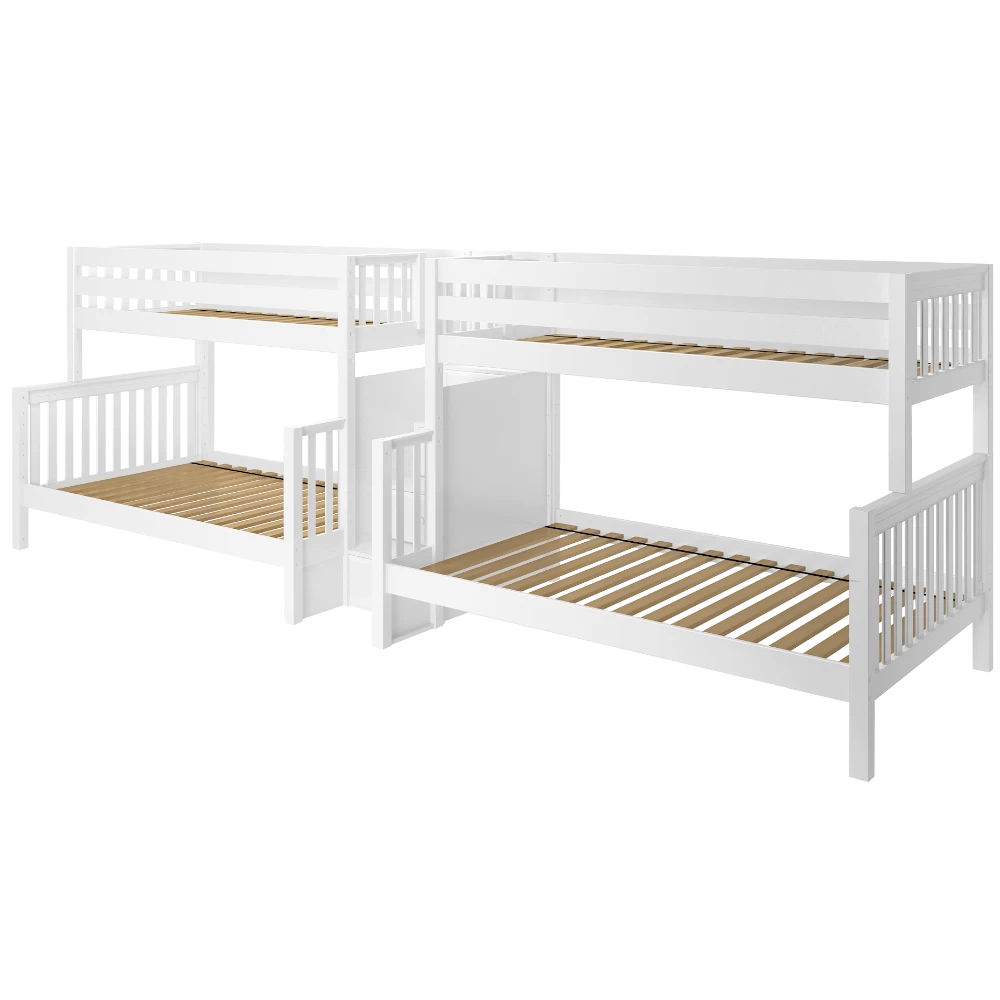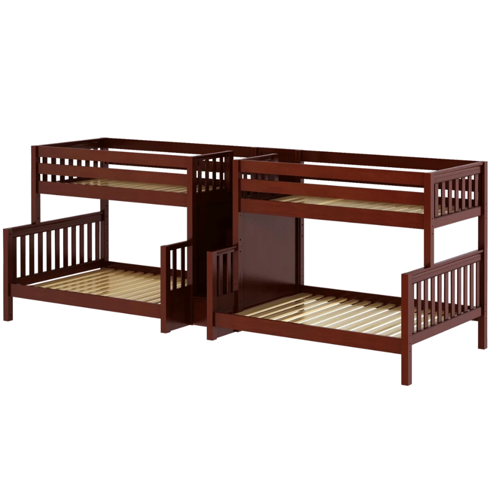 This Quadruple Bunk is two Twin XL over Full XL Bunk Beds connected by a staircase in the middle. Designed as a space-saving way to sleep four, it’s the perfect solution for a shared bedroom or vacation home. Added bonus, stairs double as drawers for built in storage!