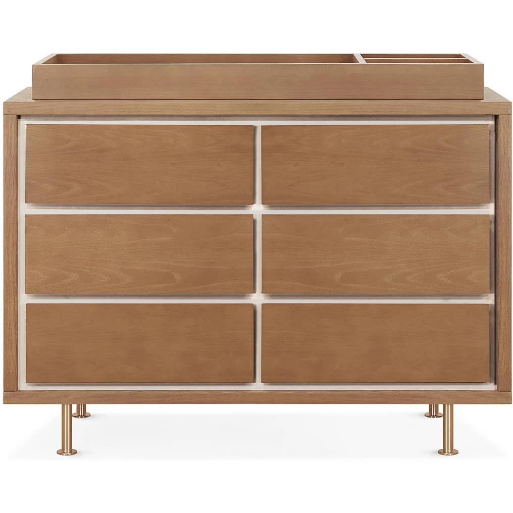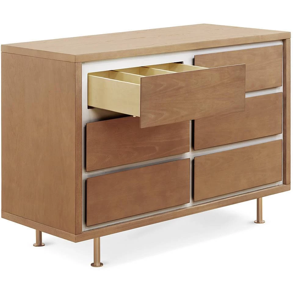 The Novella 6-Drawer Double Dresser is highlighted by the contrasting, inset, ivory-painted panels. Each dresser is given a satin finish with our water-based stain that highlights the natural Ash grain. The six spacious drawers offer ample storage for baby essentials, clothing and bulky items, while the removable dividers allow parents to create compartments suited for stacking diapers or holding little items such as socks that tend to get lost in big drawers.